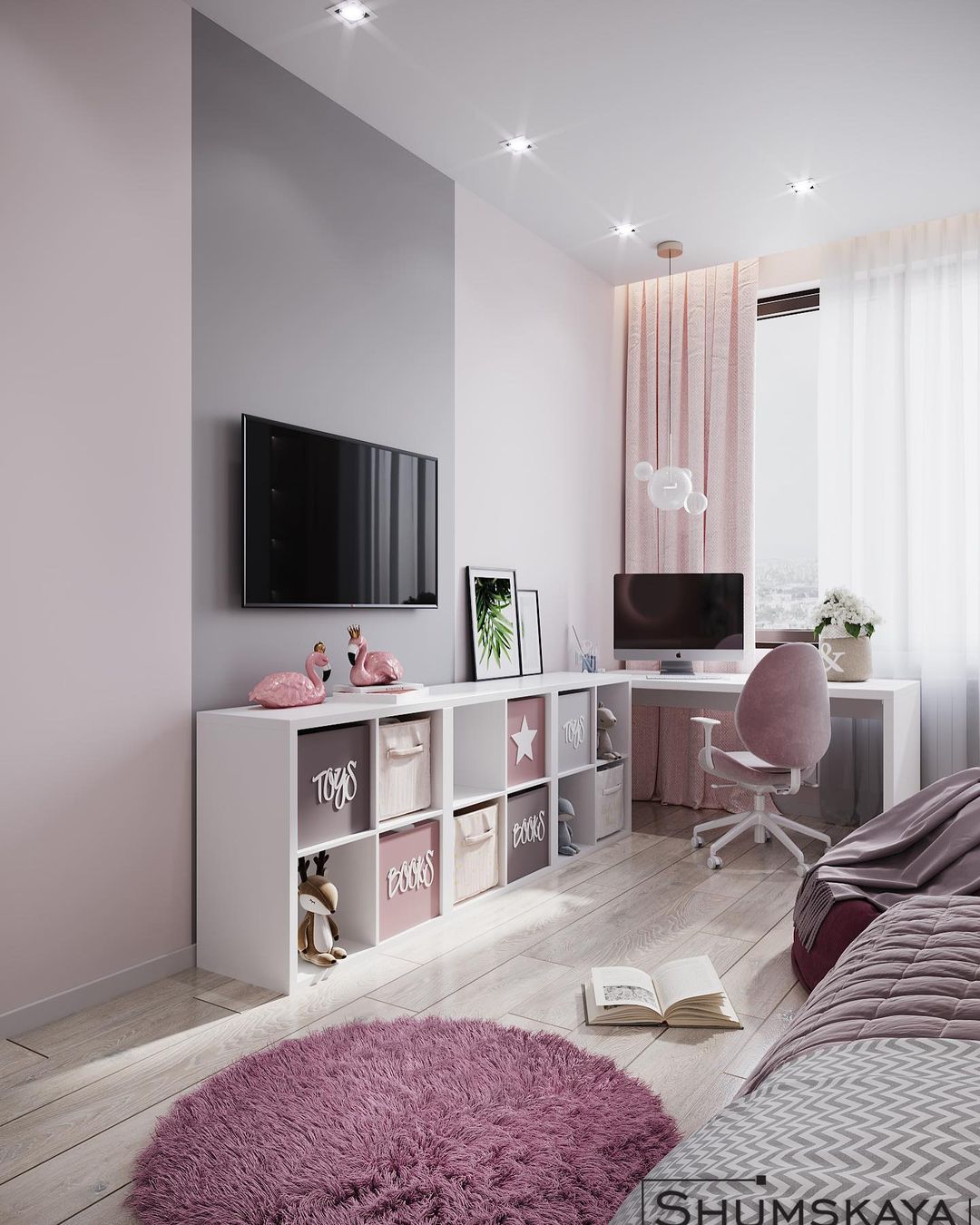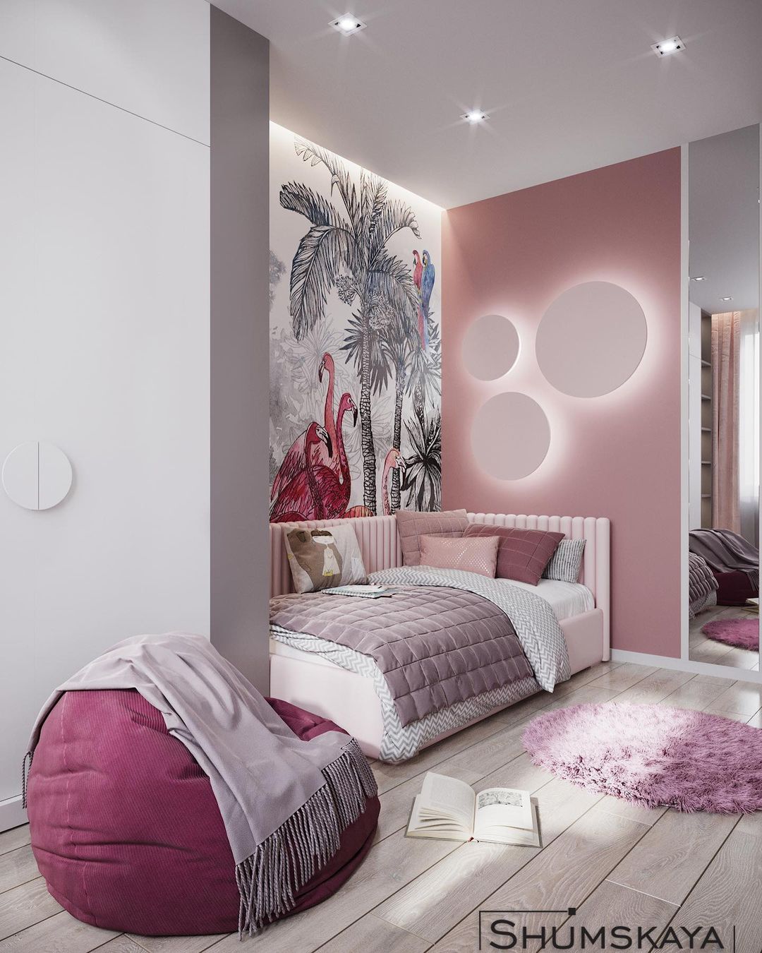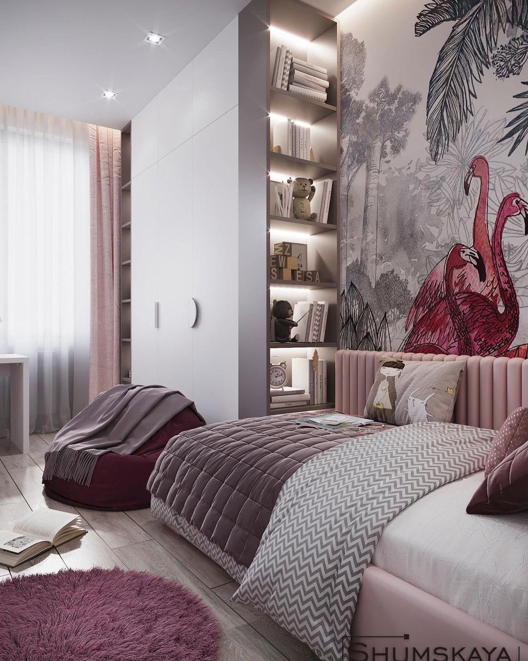 «Основная мебель, которую не планируется менять в будущем, была создана в нейтральных оттенках. А главный акцент сделали на обоях с розовыми фламинго из коллекции «Zoo». Этот рисунок достаточно сдержан в расцветке и может использоваться в оформлении любой детской — как для маленького ребенка, так и для школьника», — пишет дизайнер этого проекта Ольга.