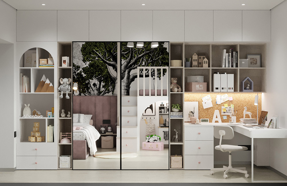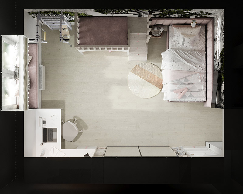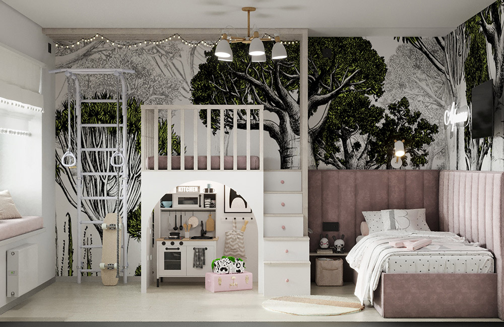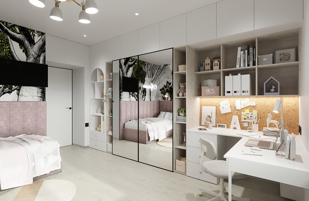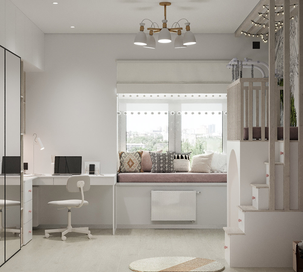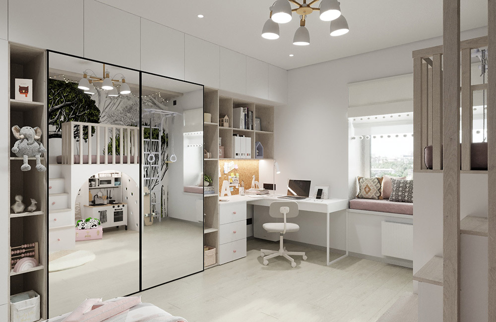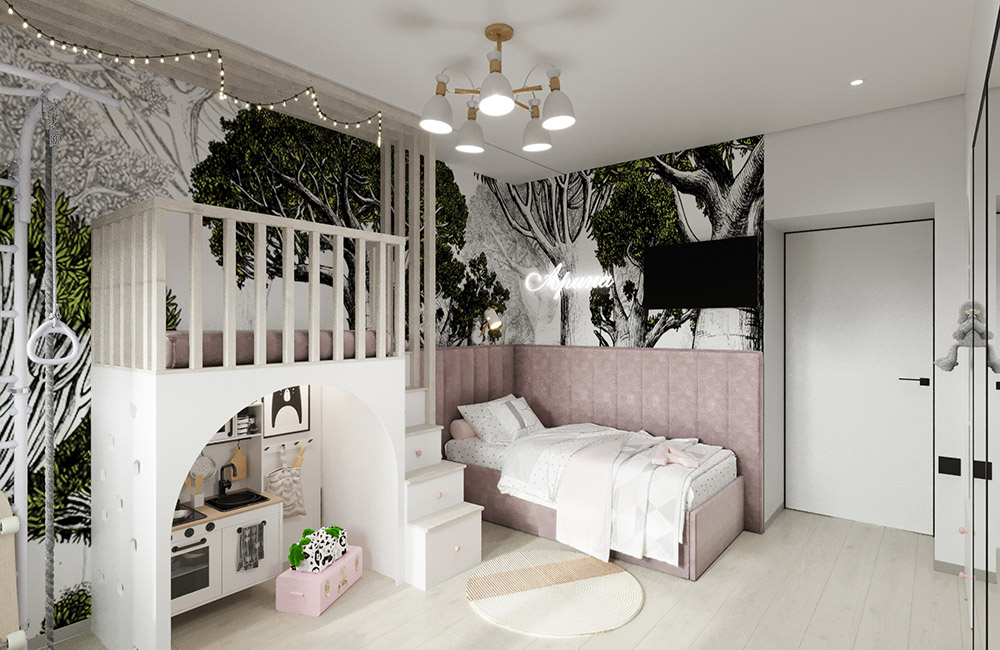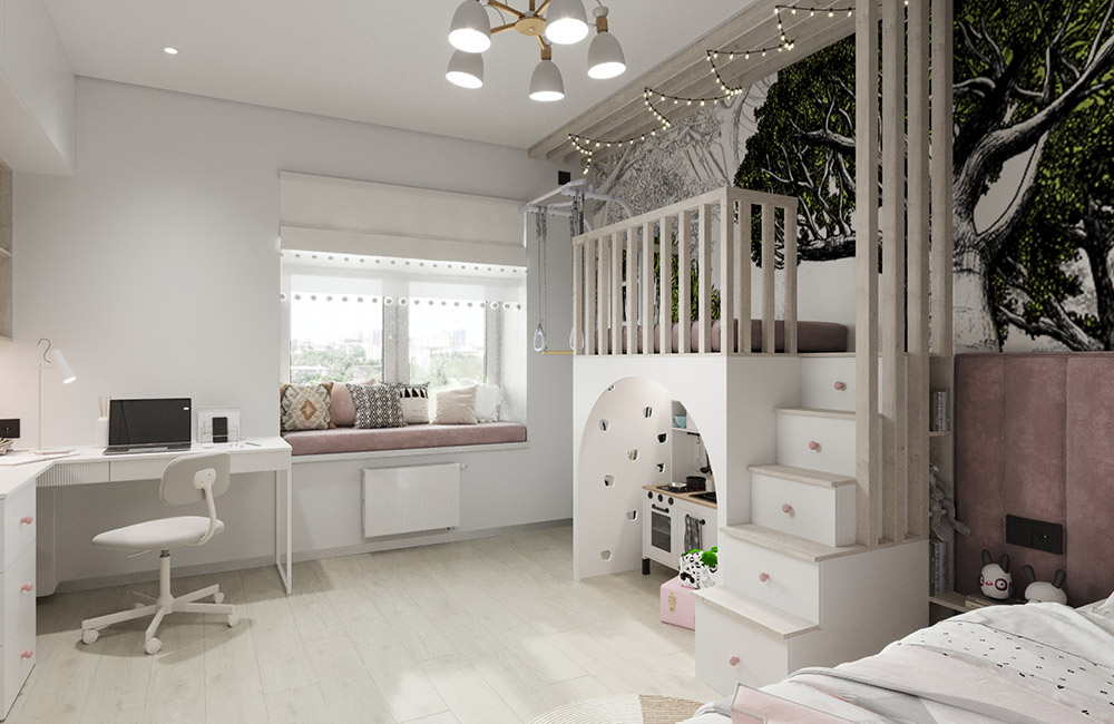 Детская создавалась для девочки 4,5 лет. Очень хотелось показать заказчику, что на 16 квадратных метрах вполне реально уместить все необходимое: и рабочее место, и зону хранения, и спальное место, и даже целый сказочный мир! Ведь так важно детям создавать детский мир, пока они им так наслаждаются и фантазируют.