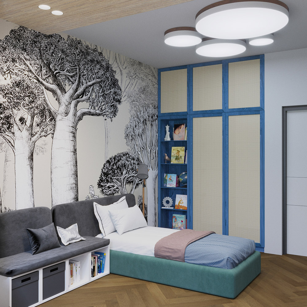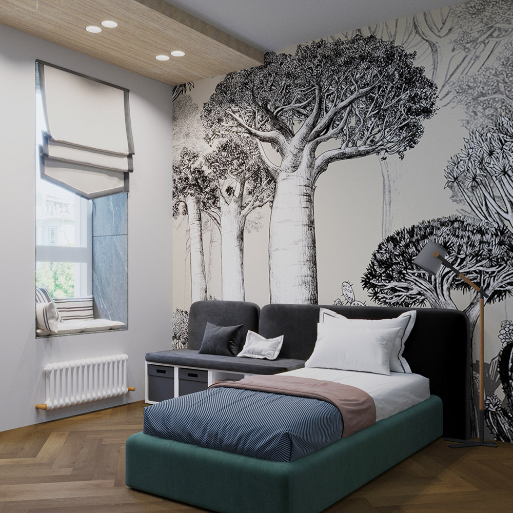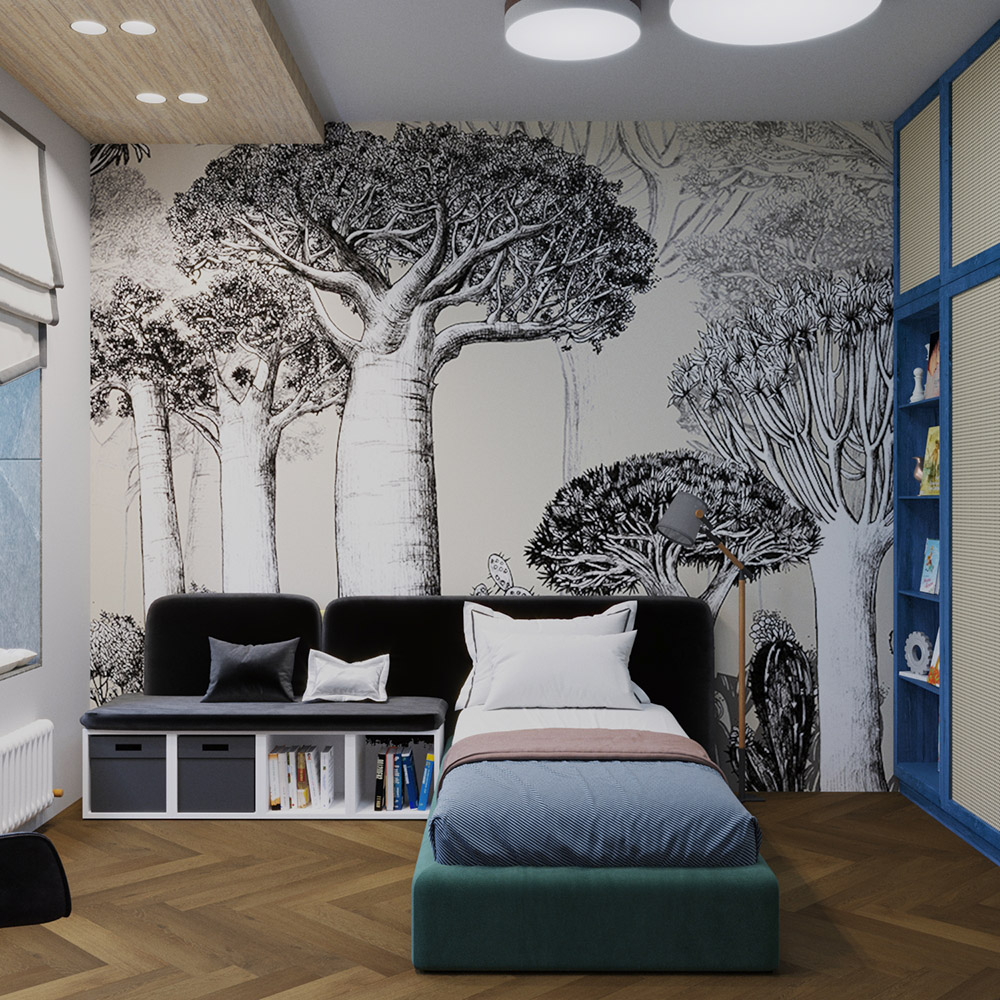 Основным принципом концепции было создание детского пространства без нарочито детских атрибутов. Так сказать, «взрослая» детская. Цветовая гамма природных оттенков, дерево и ротанг в отделке мебели заранее предопределили природную тематику настенного панно. Графичные баобабы из коллекции «Zoo» завоевали сердца заказчиков с первого взгляда, так что выбор фотообоев был самым быстрым при проектировании.