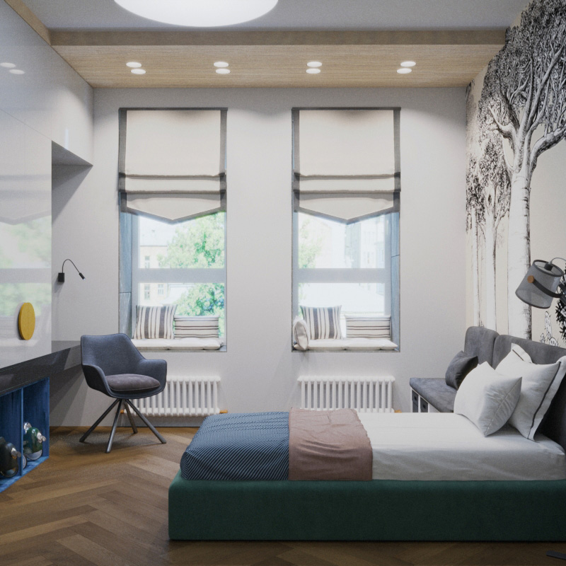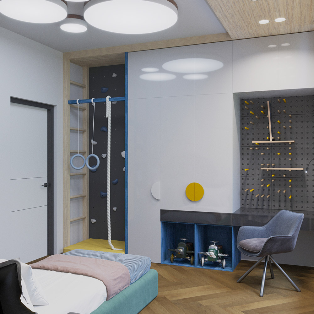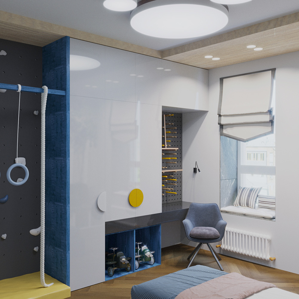 Проект детской площадью 13 м² в новостройке г. Красноярска, ЖК которого расположился прямо в центре города, недалеко от реки Енисей, был создан «на вырост» для мальчика 4 лет.