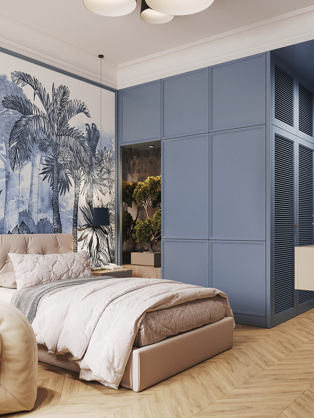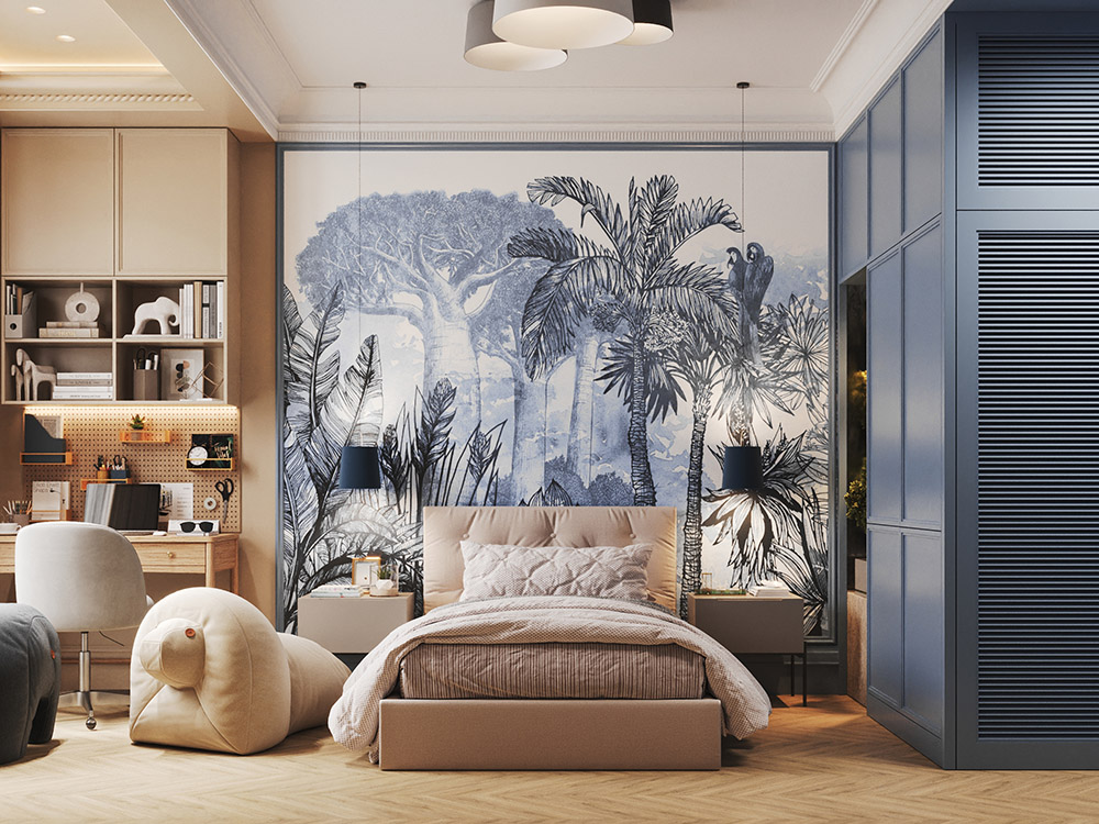 Эта комната принадлежит мальчику постарше, где есть место для своего маленького живого уголка. При наличии специальной подсветки в нише шкафа может быть как небольшой бонсай, так и более сложный флорариум.