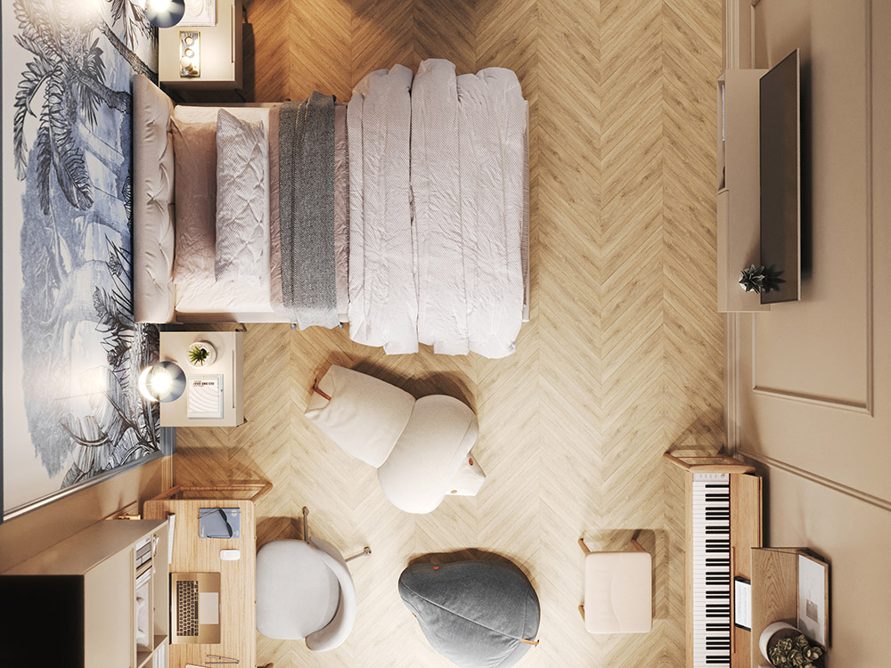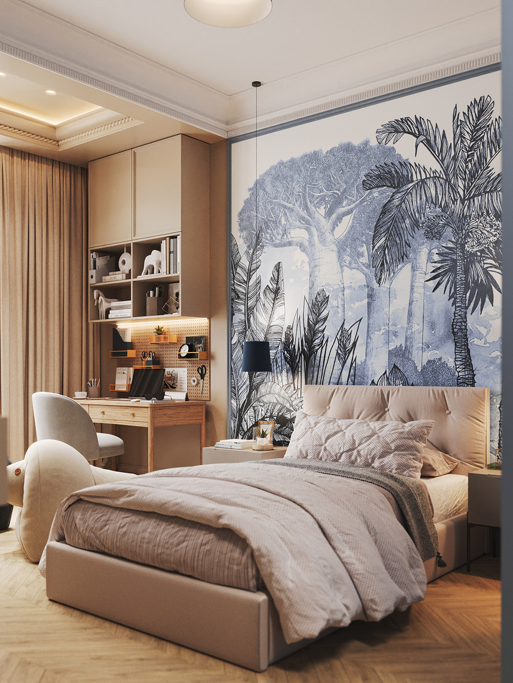 Это проект одной из двух парных детских комнат для младших детей. Площадь комнат — 20 м². По планировочному решению они почти идентичные: гардеробная, кровать, место для занятий.