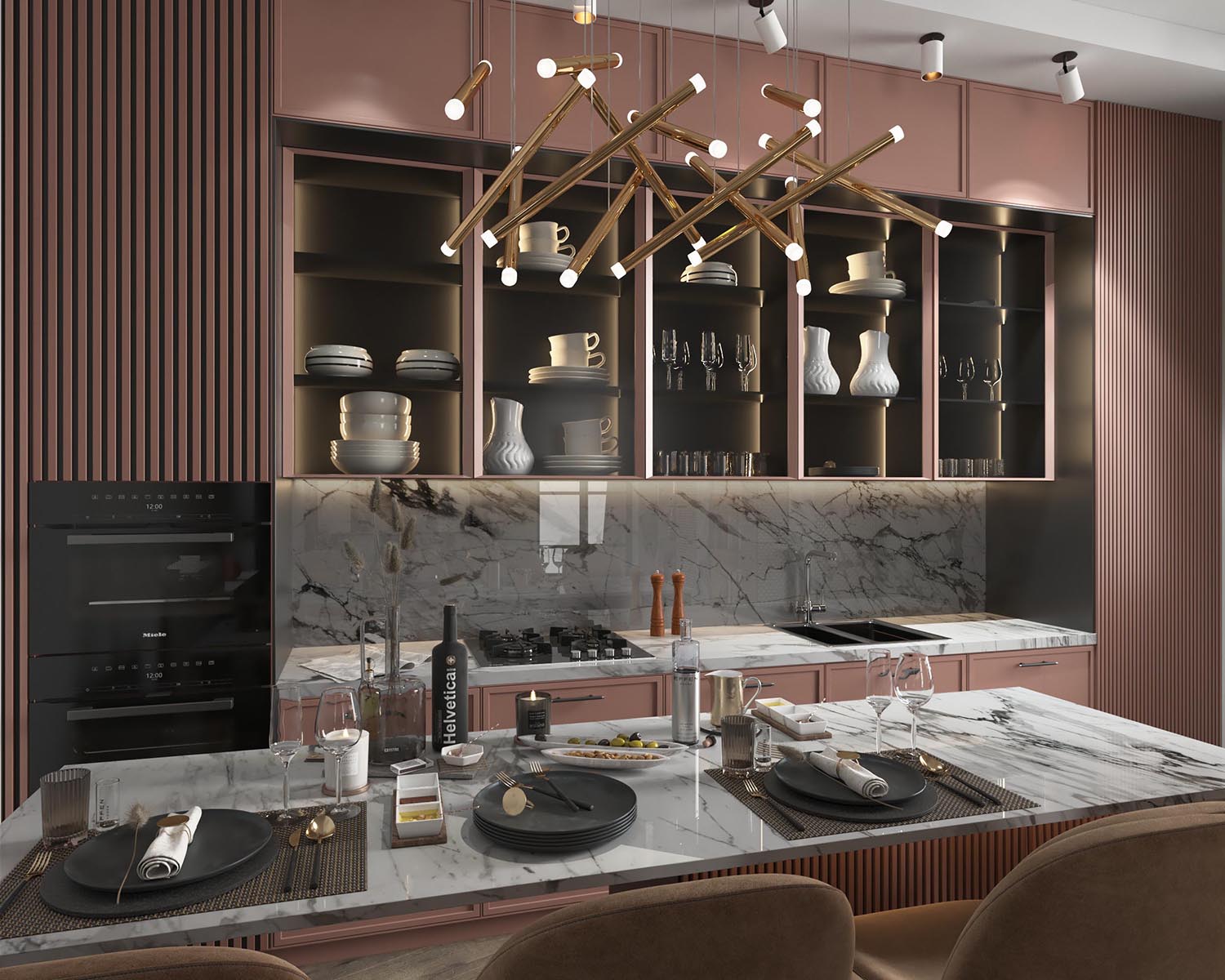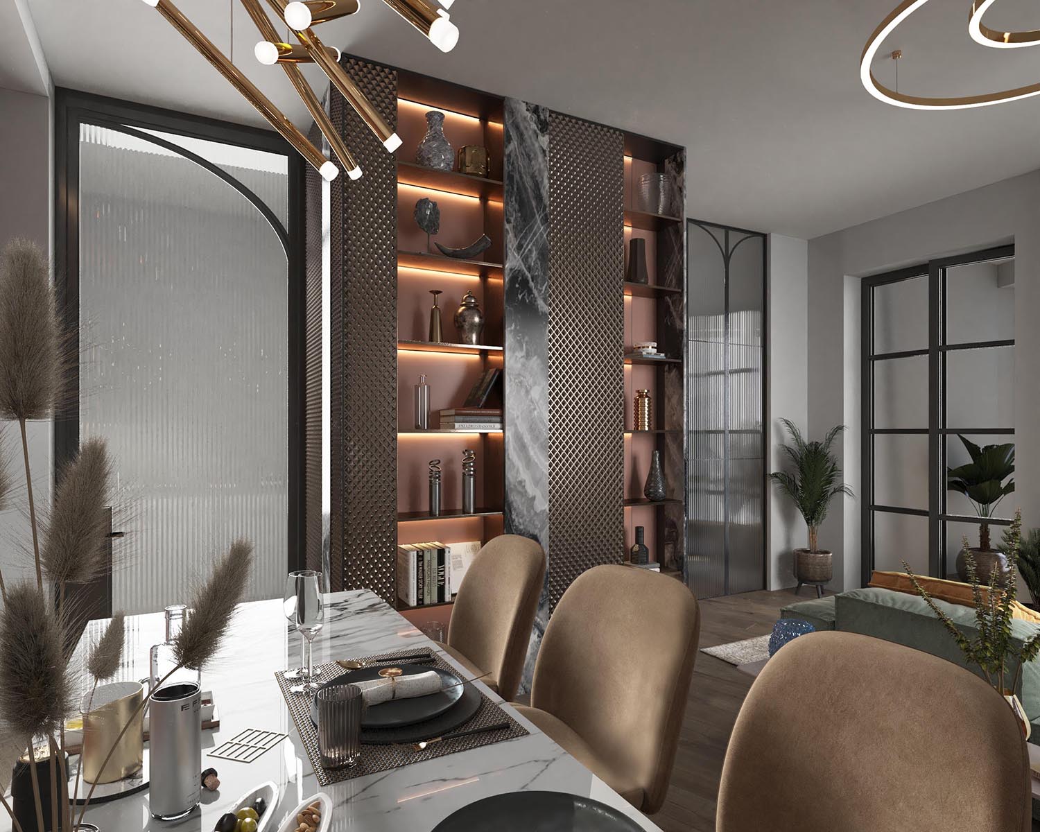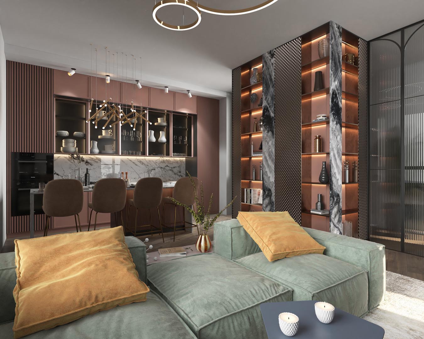 Хозяева квартиры любят смотреть фильмы с друзьями, вместе готовить и общаться. Поэтому отдали предпочтение не столу, а кухонному острову и модульному дивану с местами, ориентированными как на телевизор, так и на кухню. Вентиляционную шахту задекорировали металлическими панелями с объёмной ромбовидной фактурой, которая красиво подчёркивается от солнечного света. Зеркальные вставки визуально размывают границы и вся конструкция смотрится глубже, а помещение — больше, чем есть на самом деле. Рельефные фасады кухни перекликаются с вертикальными линиями на стеновых панелях и стеклянных перегородках.