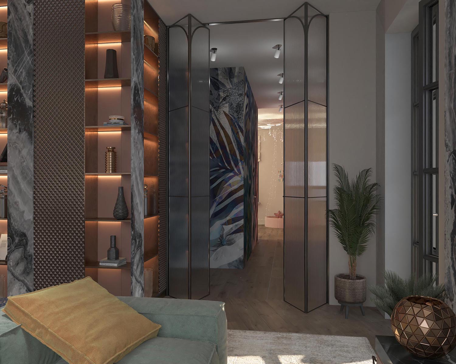 Через раздвижные стеклянные перегородки мы попадаем в приватную часть квартиры. Здесь расположены: спальня родителей, ванная комната, детская спальня и игровая зона. Перегородку между детской спальней и игровой выполняют встроенные шкафы. Предусмотрены два входа в детскую спальню: один — через «взрослую» дверь высотой 2 м., выполненную как фасад шкафа, и второй — через лёгкую маленькую дверь высотой 1 м. со сказочной ручкой».
