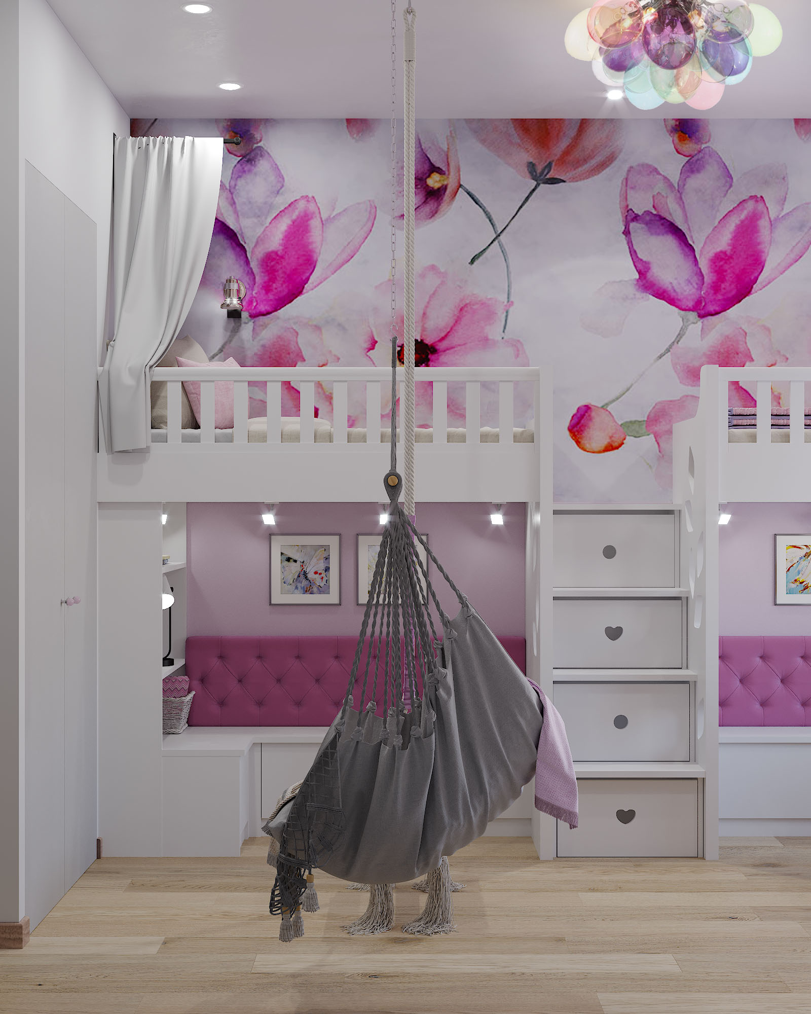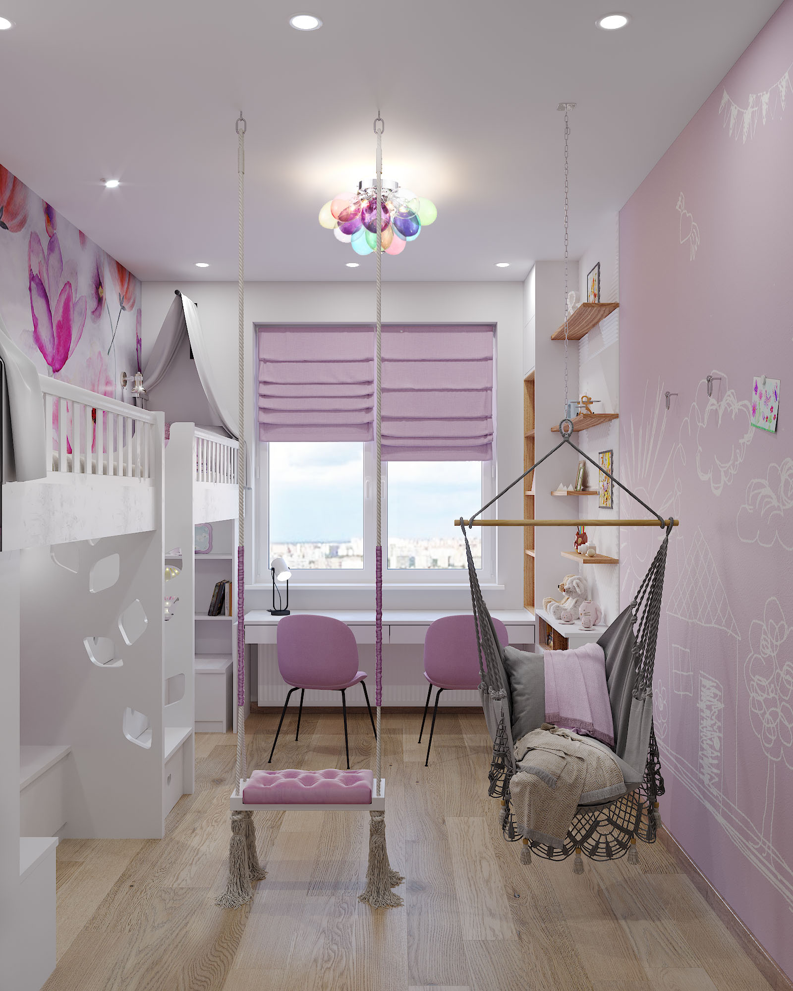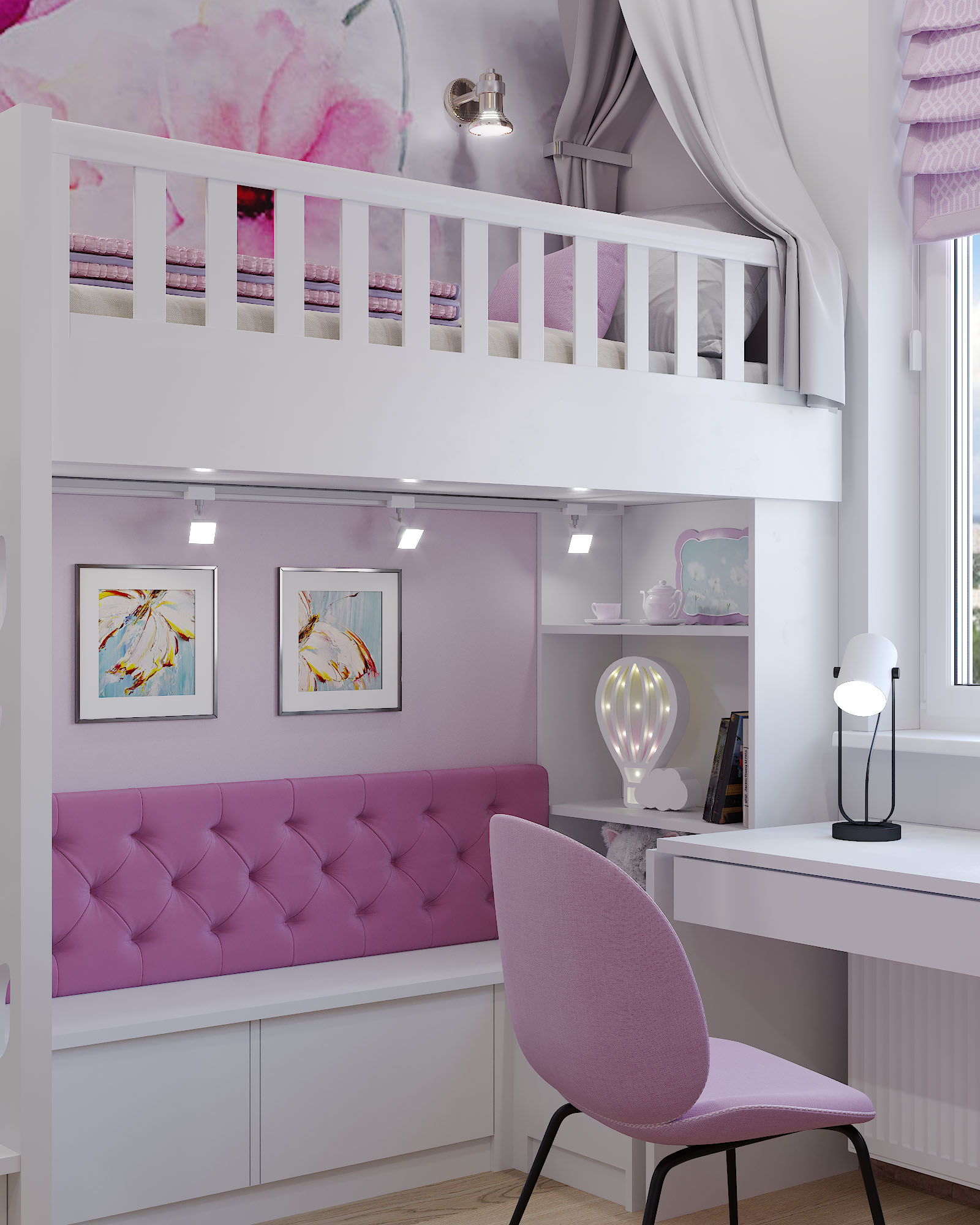 Детская комната площадью 14 м², г. Пушкино. Задача стояла непростая: не небольшом пространстве надо было разместить двух принцесс со всей необходимой для их возраста атрибутикой, а также предусмотреть пространство для игр, сна, занятий, творчества и активного отдыха.