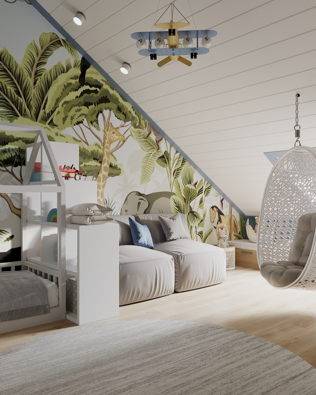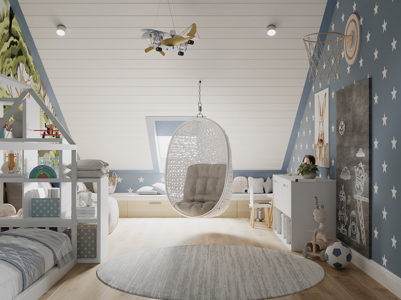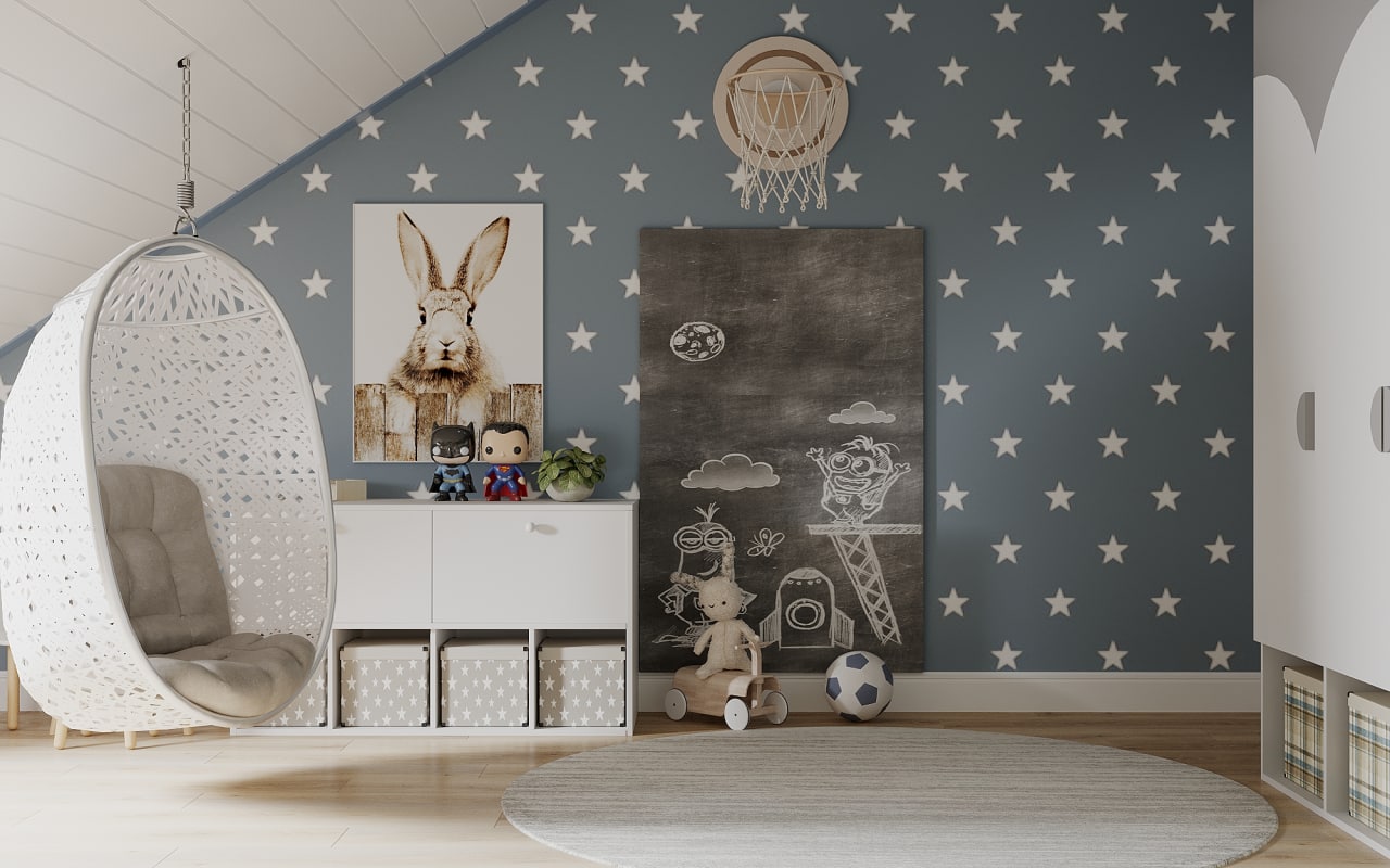 Детская комната в двухуровневой квартире в Калининграде. Дизайн детской разрабатывался для мальчика двух лет. Дети растут быстро, и изначально нужно было продумать её и на будущее: рабочий стол, игровая, хранение для игрушек и книг. Комната хоть и получилась активная — звезды, динозавры — но цветовая гамма у неё мягкая, что очень важно для психики малыша.