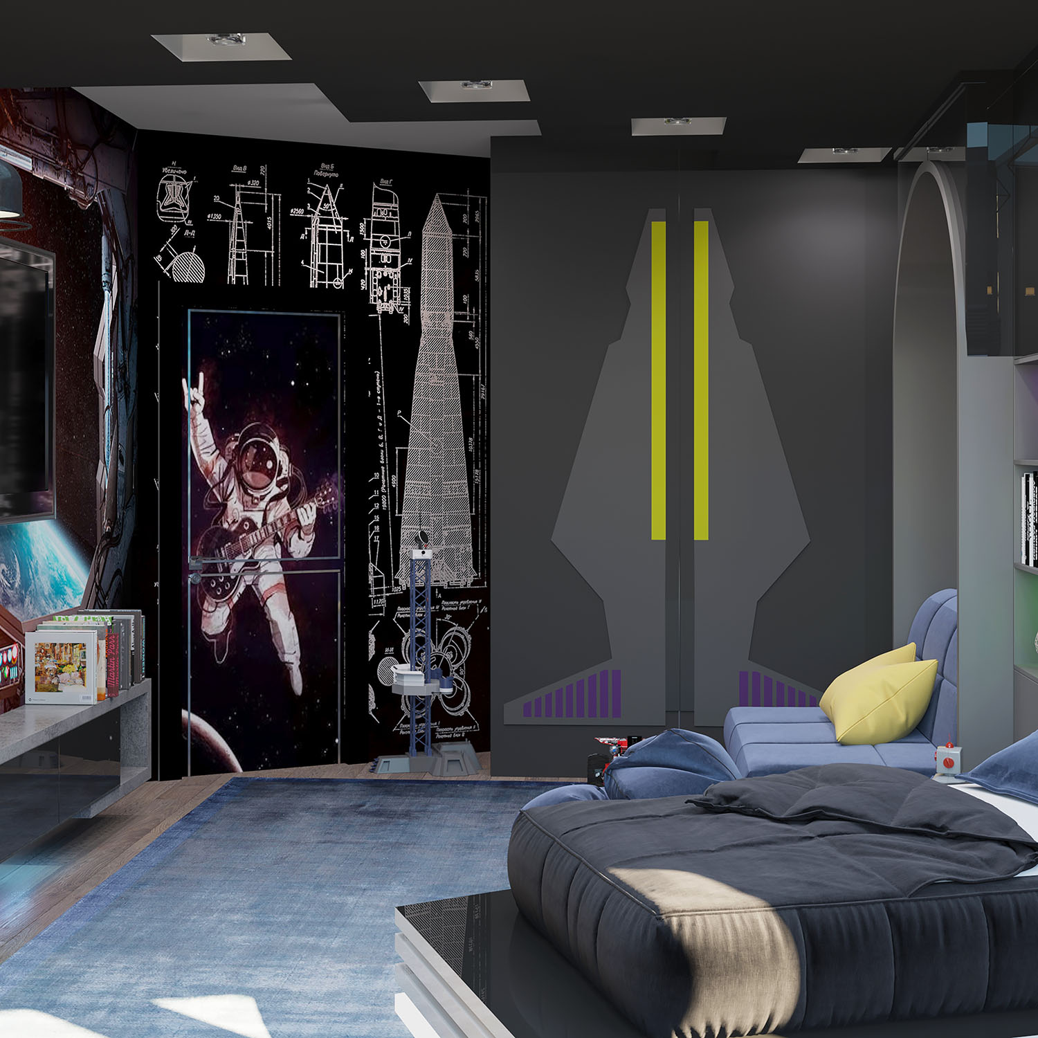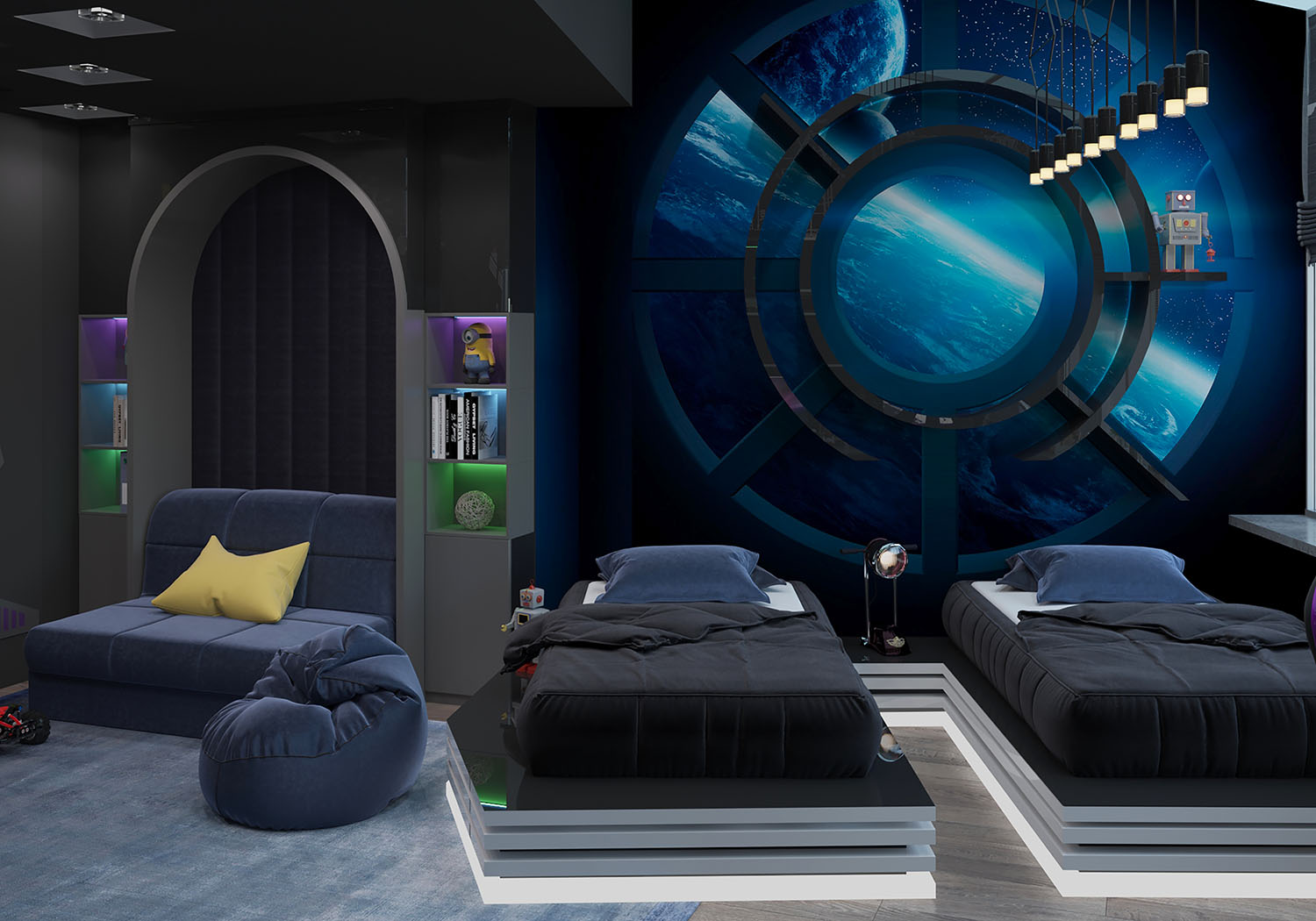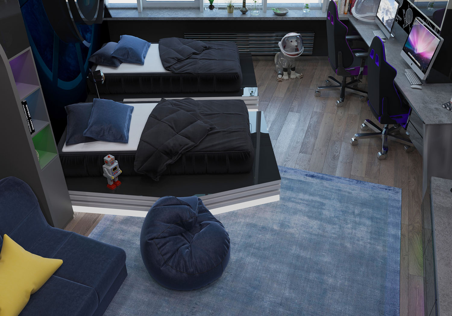 Детская комната для двух мальчиков возрастом 2 и 4 года, ЖК Сокольники, г. Москва. Нужно было сделать проект детской в футуристическом стиле на космическую тему. В комнате две одинаковые кроватки и два одинаковых рабочих места, чтобы детишки не ссорились. При этом получилось сохранить приличное пространство для игр.