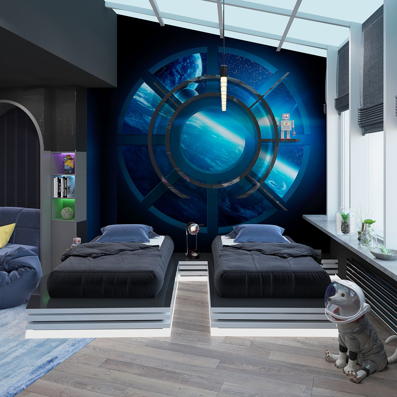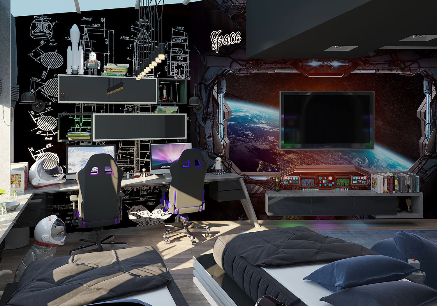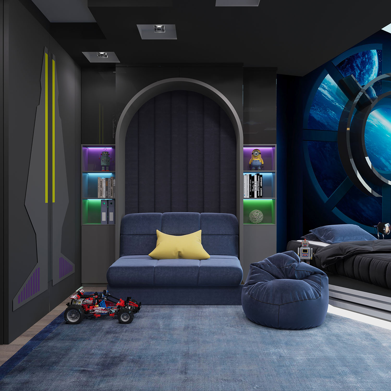 Детская комната для двух мальчиков возрастом 2 и 4 года, ЖК Сокольники, г. Москва. Нужно было сделать проект детской в футуристическом стиле на космическую тему. В комнате две одинаковые кроватки и два одинаковых рабочих места, чтобы детишки не ссорились. При этом получилось сохранить приличное пространство для игр.