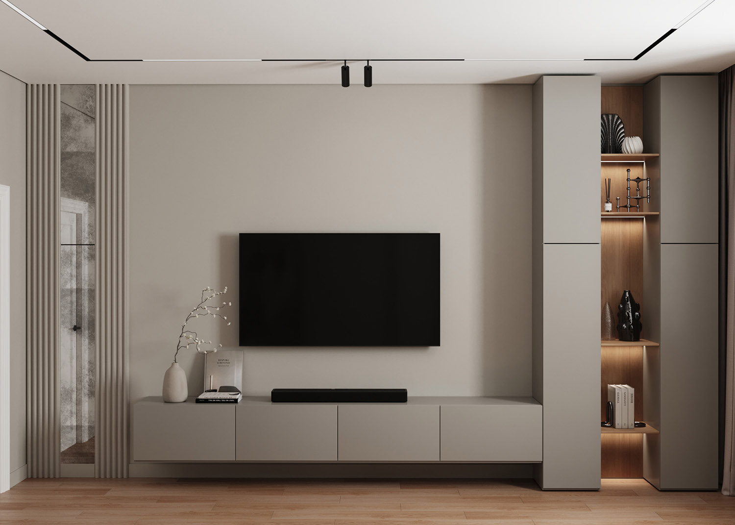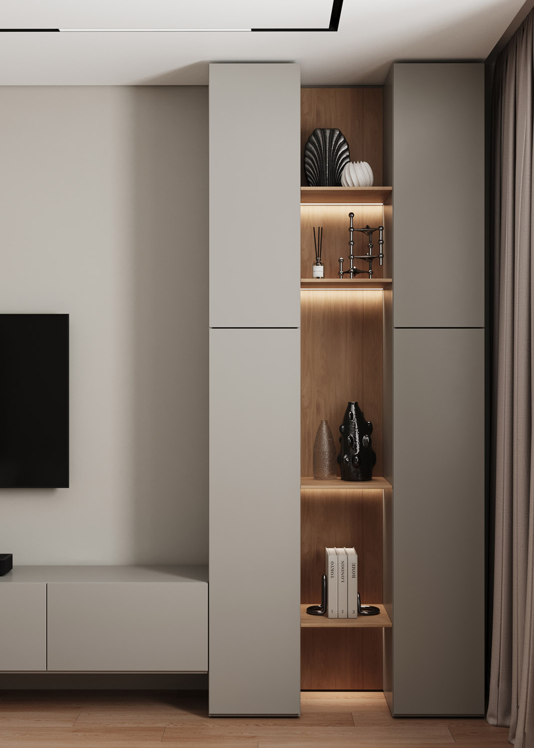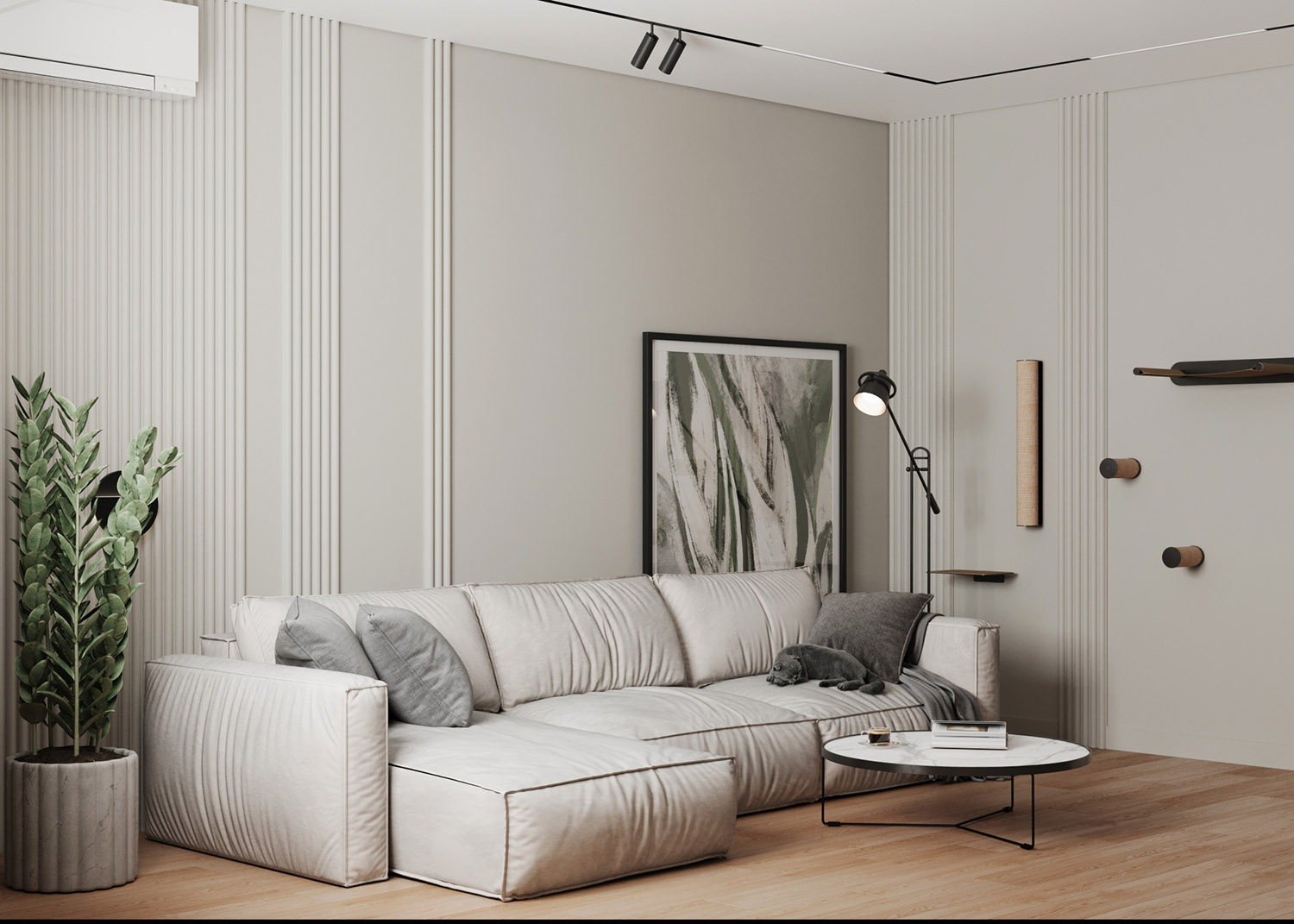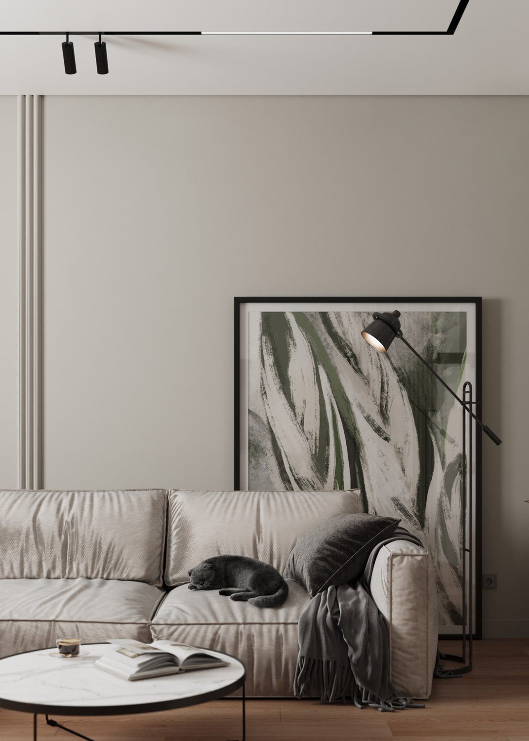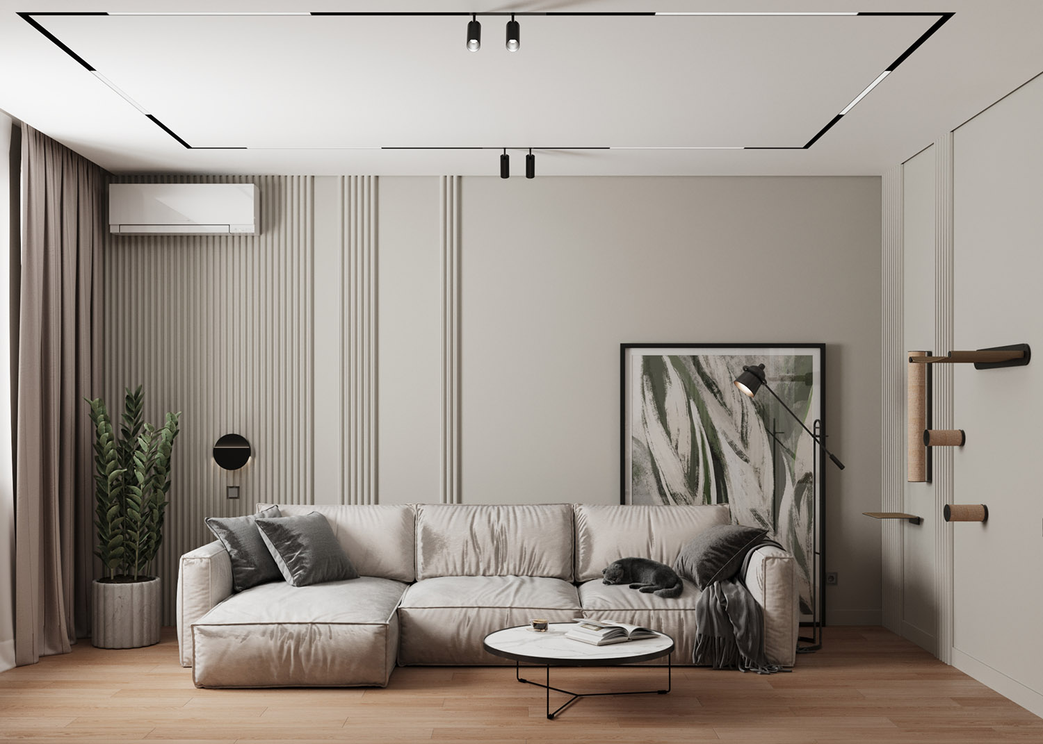Квартира располагается в городе Краснодар. Площадь гостиной — 20 м². Квартиру для молодой успешной девушки дизайне реализовал в серо-бежевой гамме теплых оттенков. Основными пожеланиями были современный уютный дизайн и обязательно уголок для кота, который так же гармонично вписался в интерьер)