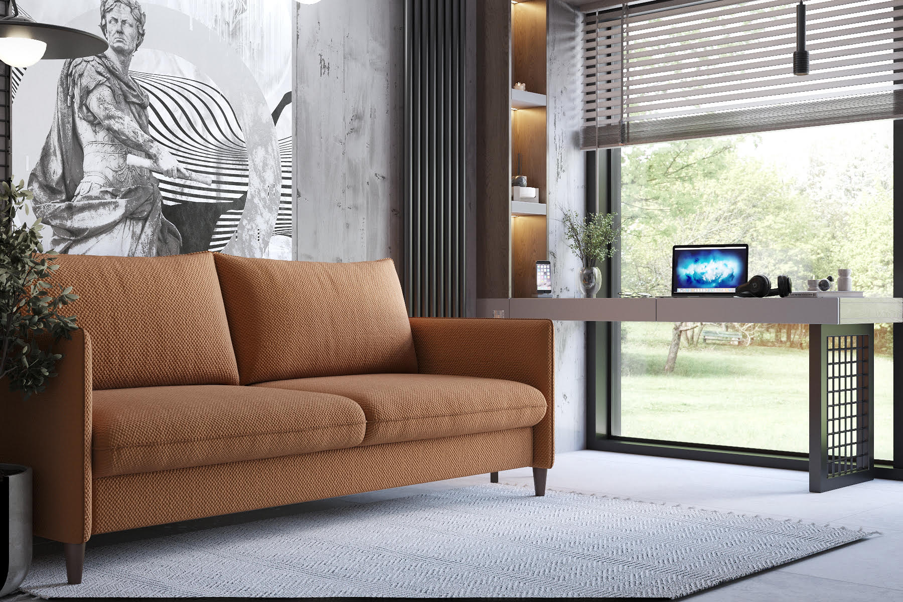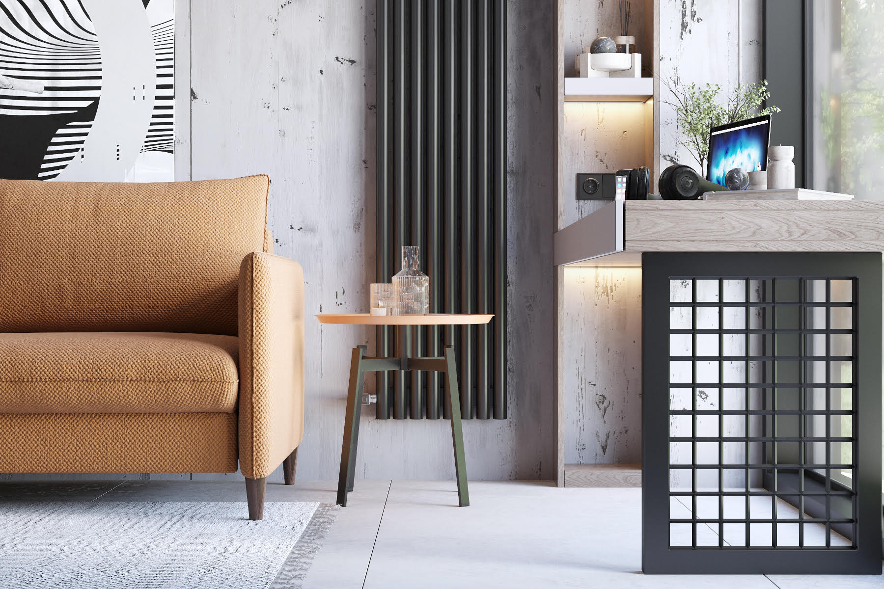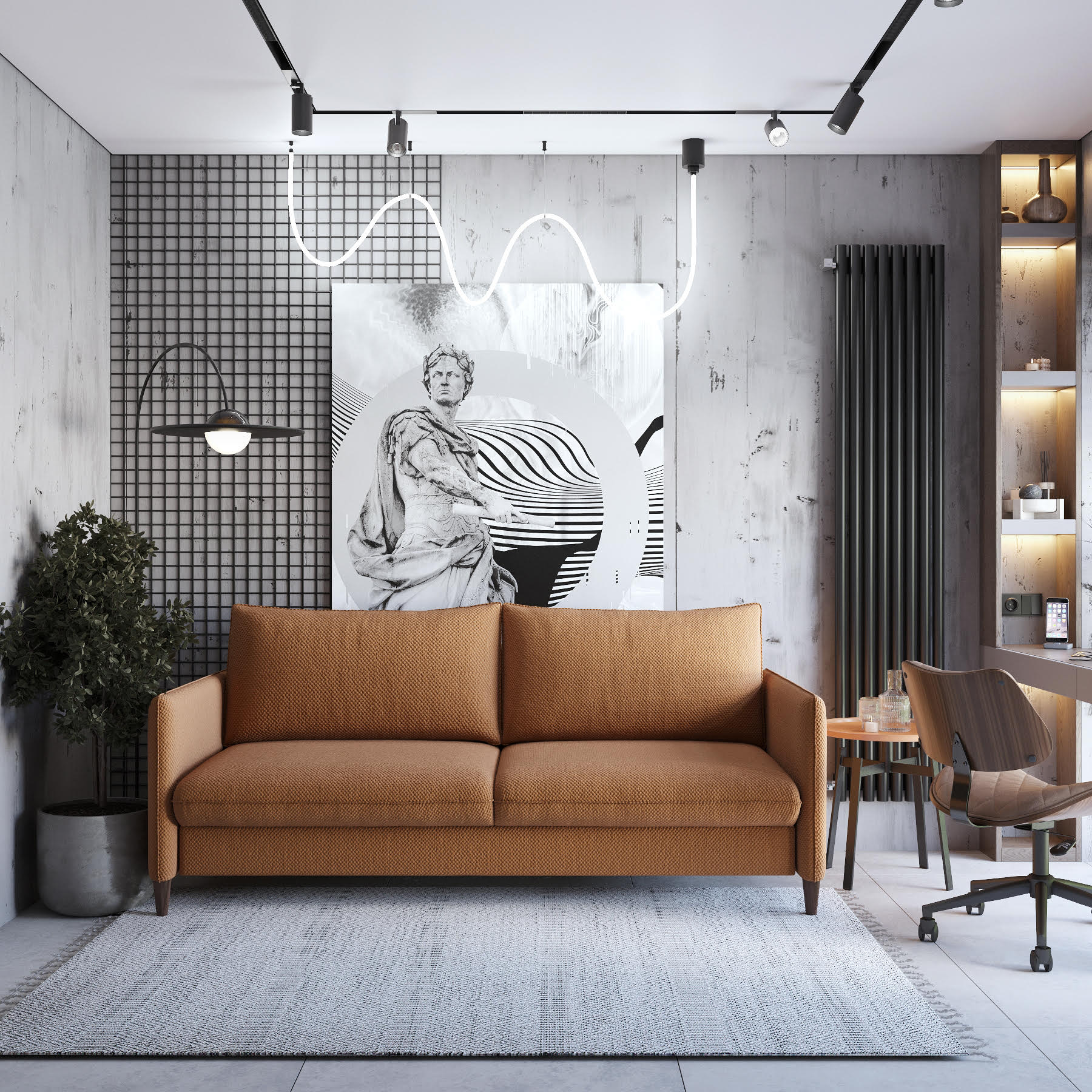 Комната отдыха площадью 10 м² в частном доме. Пожеланием заказчика было использовать комнату отдыха при сауне в качестве места для работы, также с возможностью размещать в этой комнате гостей. Поэтому в данном помещении расположили небольшой, но удобный раскладной диван и рабочее место у окна. А в качестве акцента использован волборд из коллекции ANTIQUE.