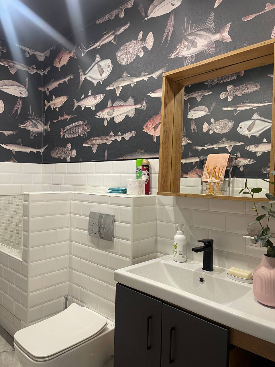 Нам хотелось, чтобы ванная выглядела дерзко, смело, необычно. Подходящее изображение мы нашли в коллекции EDEN – рыбы на черном фоне сразу добавили комнате характера. А решение оформить ванную обоями оказалось не только оригинальным, но и практичным.