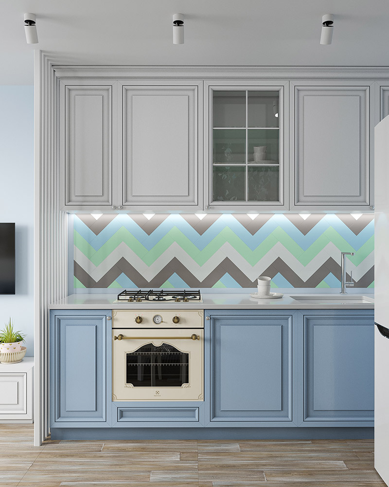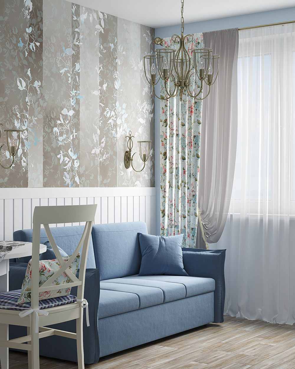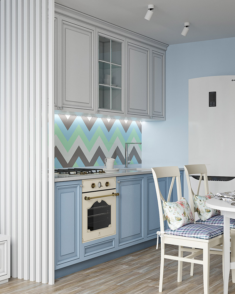 Кухня-гостиная из проекта квартиры для мамы с сыном. Из пожеланий — голубой цвет, отсылки к провансу в кухне-гостиной, а также много игрового места в детской. Для кухни выбрали обои из коллекции «Alexandra».