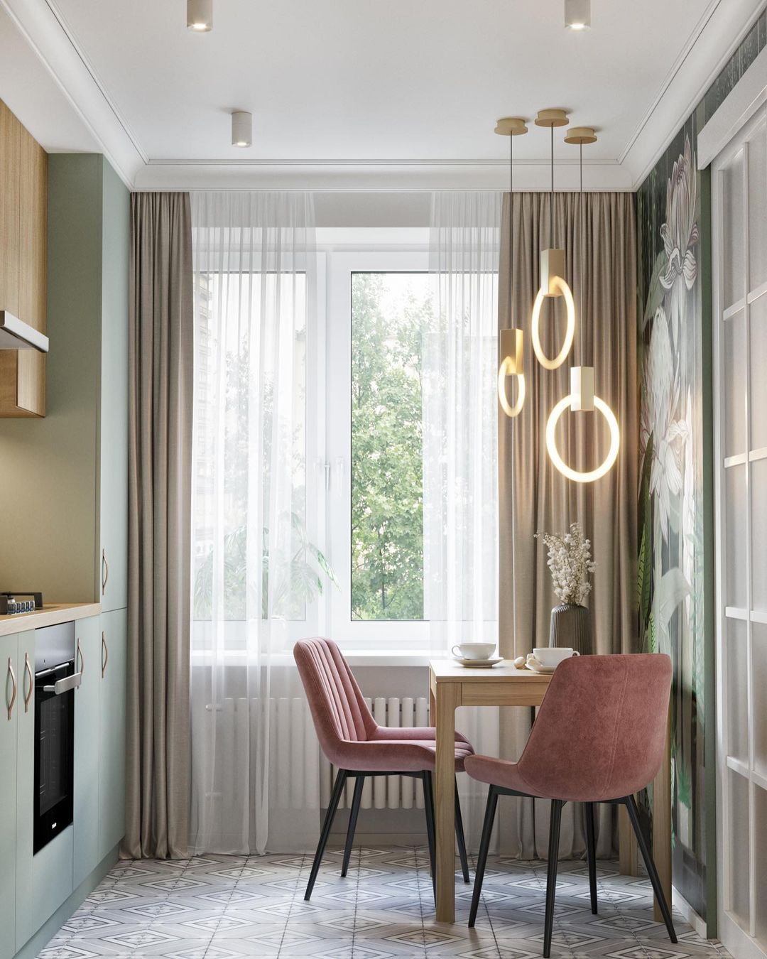 Если площадь кухни 8 м²., а высота потолка всего 2,5 м. – нужен максимально светлый и лёгкий дизайн. Бюджет ниже среднего, поэтому играем цветом и принтами. Оттенки тоже не яркие, а более сложные тона. За счет таких решений, несмотря на простую планировку и форму помещения, интерьер получился очень интересным.