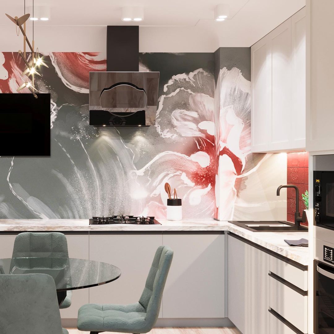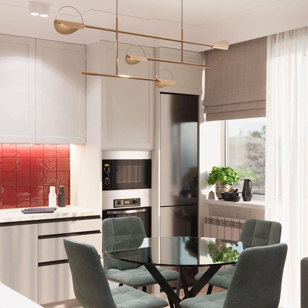 «Чтобы интерьер на кухне не выглядел монотонно, фартук я решила украсить неординарными обоями «La Prima» и яркой плиткой, — рассказывает об этом проекте дизайнер Олеся, — Красный цвет делает интерьер необычным и смелым, тем более этот оттенок остаётся трендовым в 2022 году».