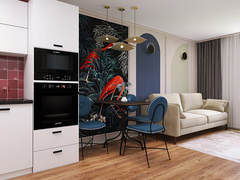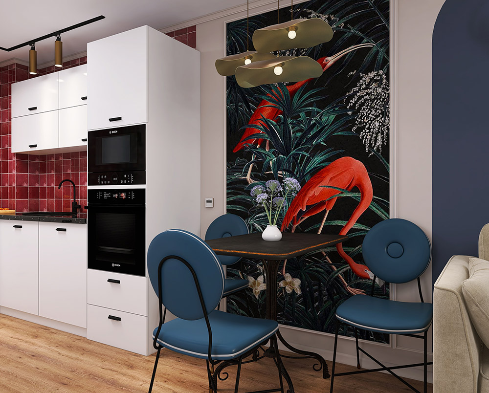 Проект кухни-гостиной в стиле эклектика. ЖК Ньютон Парк, г.Екатеринбург. Обои из коллекции «Eden-21». В ней мы совместили привлекательные для всех природные мотивы с яркими интенсивными красками. Эти удивительные принты придадут вашему интерьеру особый шик, а проработанные до мельчайших деталей рисунки каждый раз будут привлекать внимание и открывать вашему взору что-то новое.
