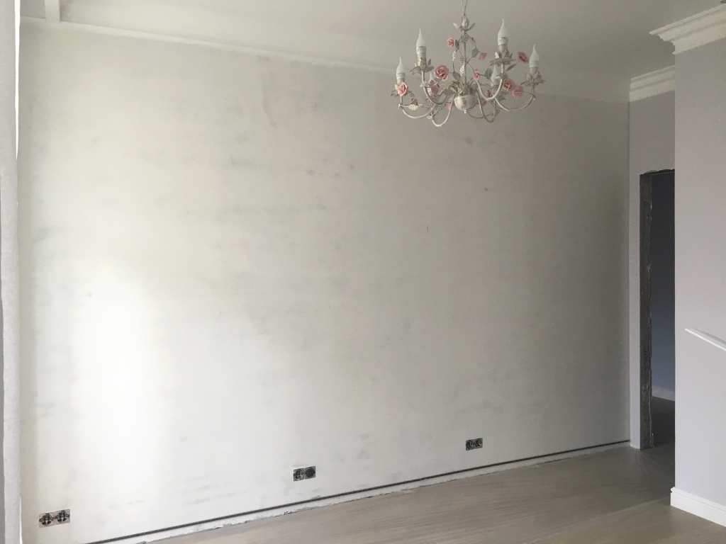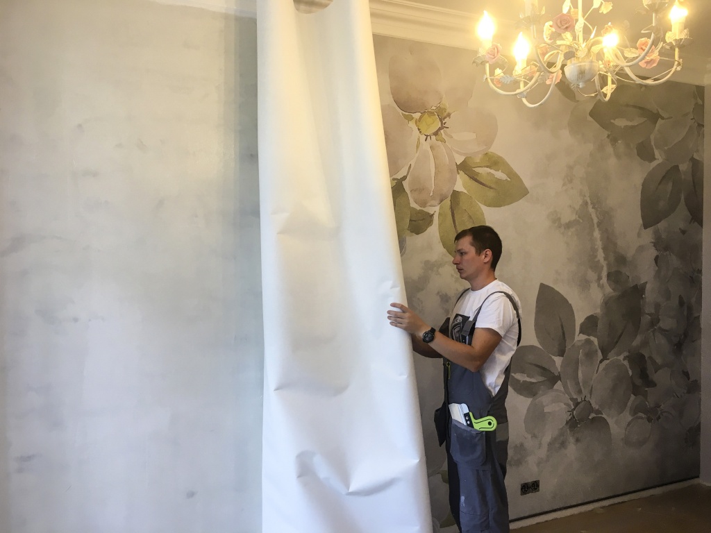 Сделали макет в размер стены и цветопробу. Фресочники изготовили материал. Наносим рисунок и едем на монтаж.