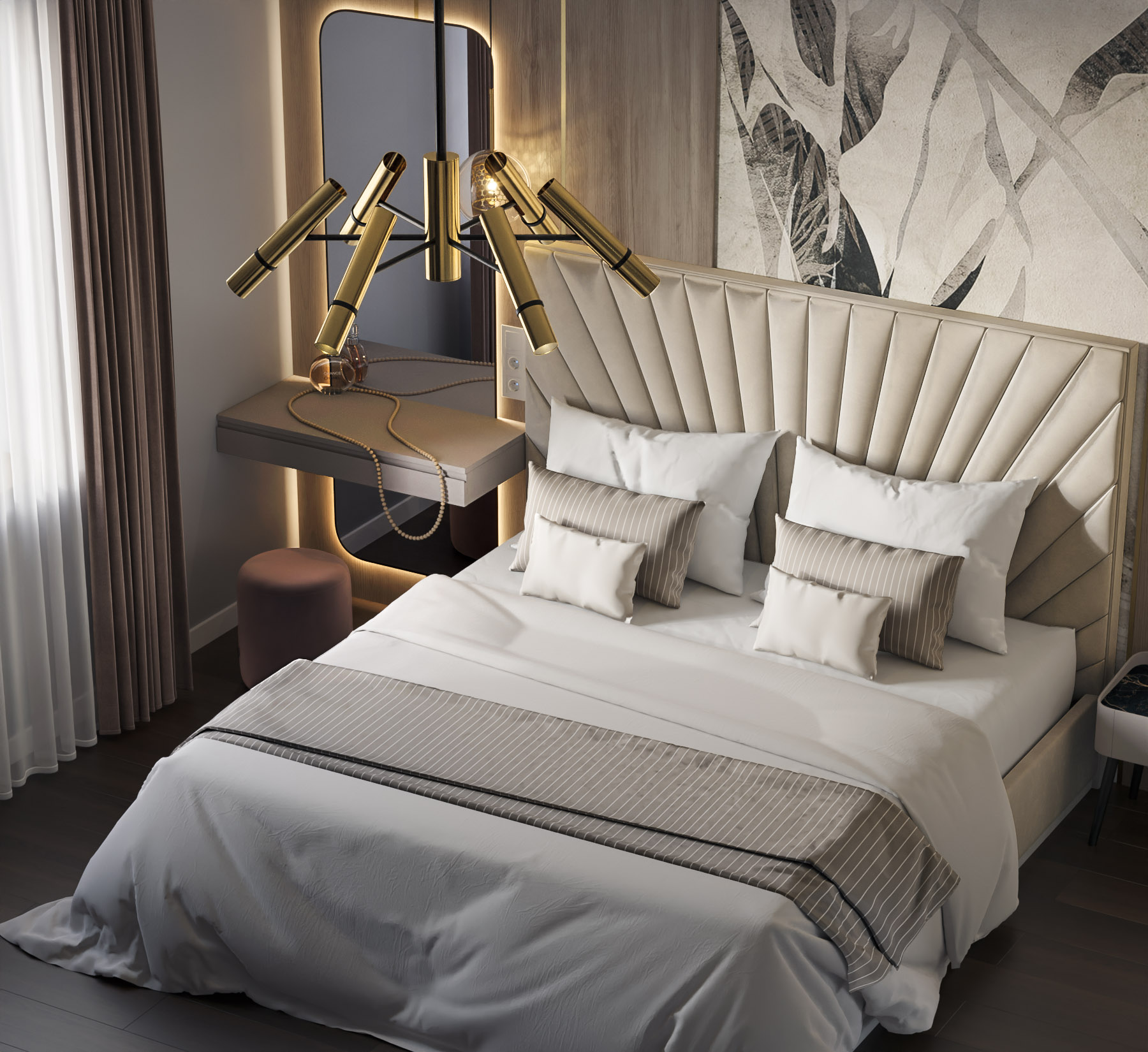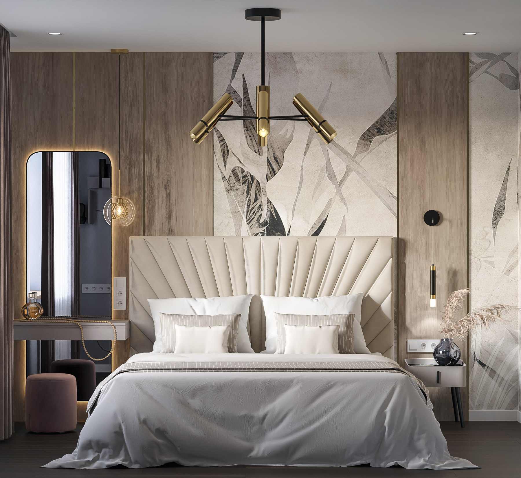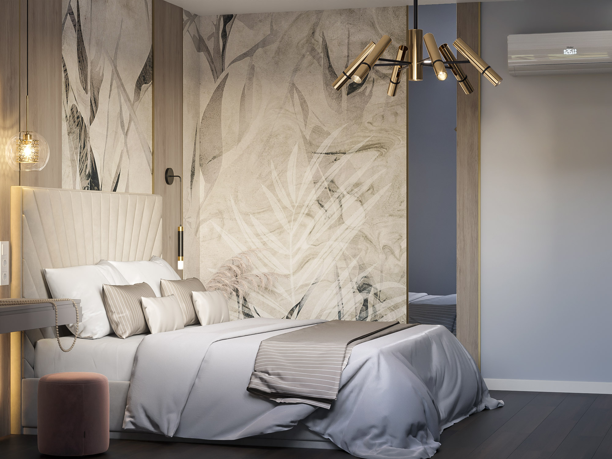 Проект спальни площадью 15,8 м². Заказчики — молодая активная семья. Из пожеланий был «классный современный интерьер с трендовыми фишками», и фреска из коллекции «Air» — одна из них!