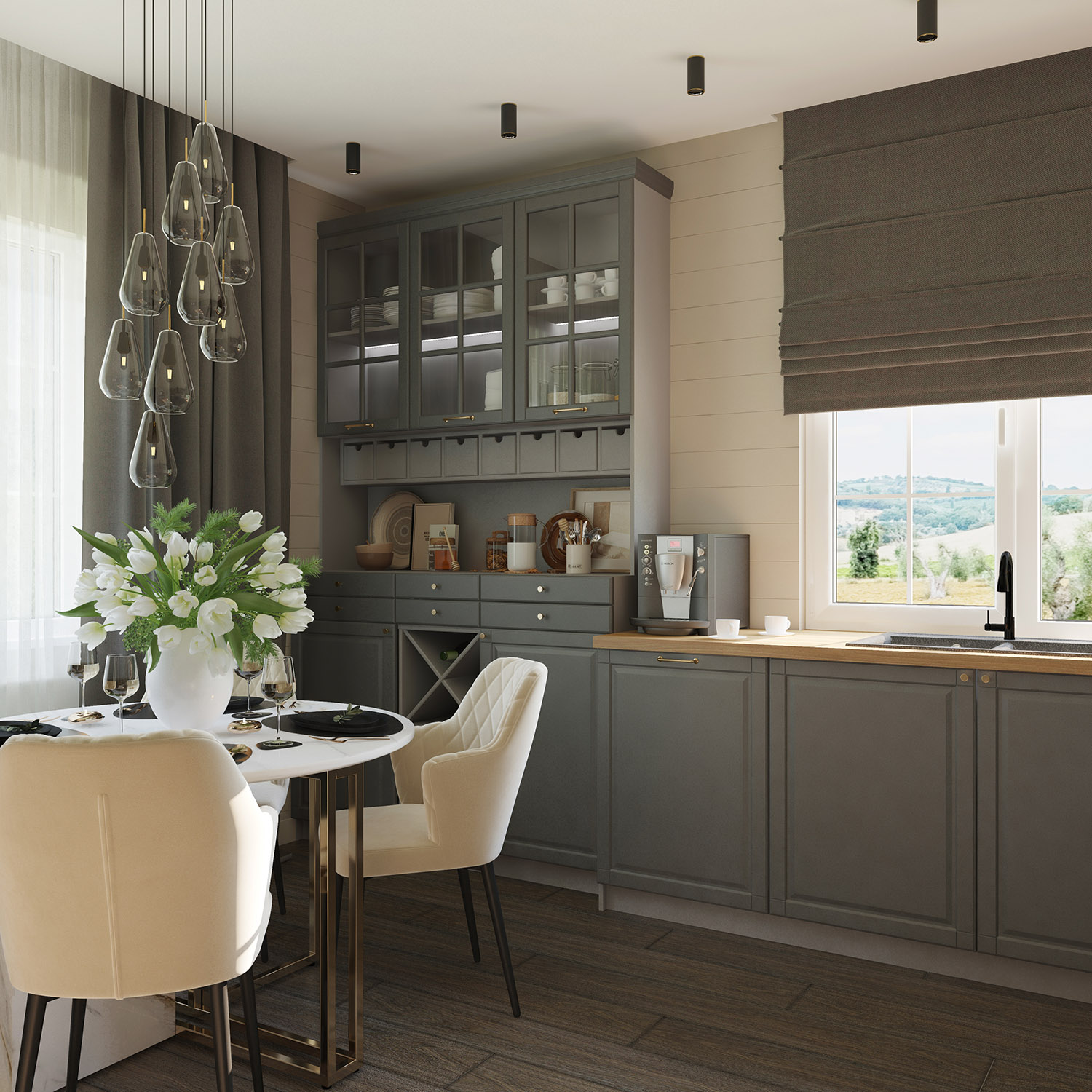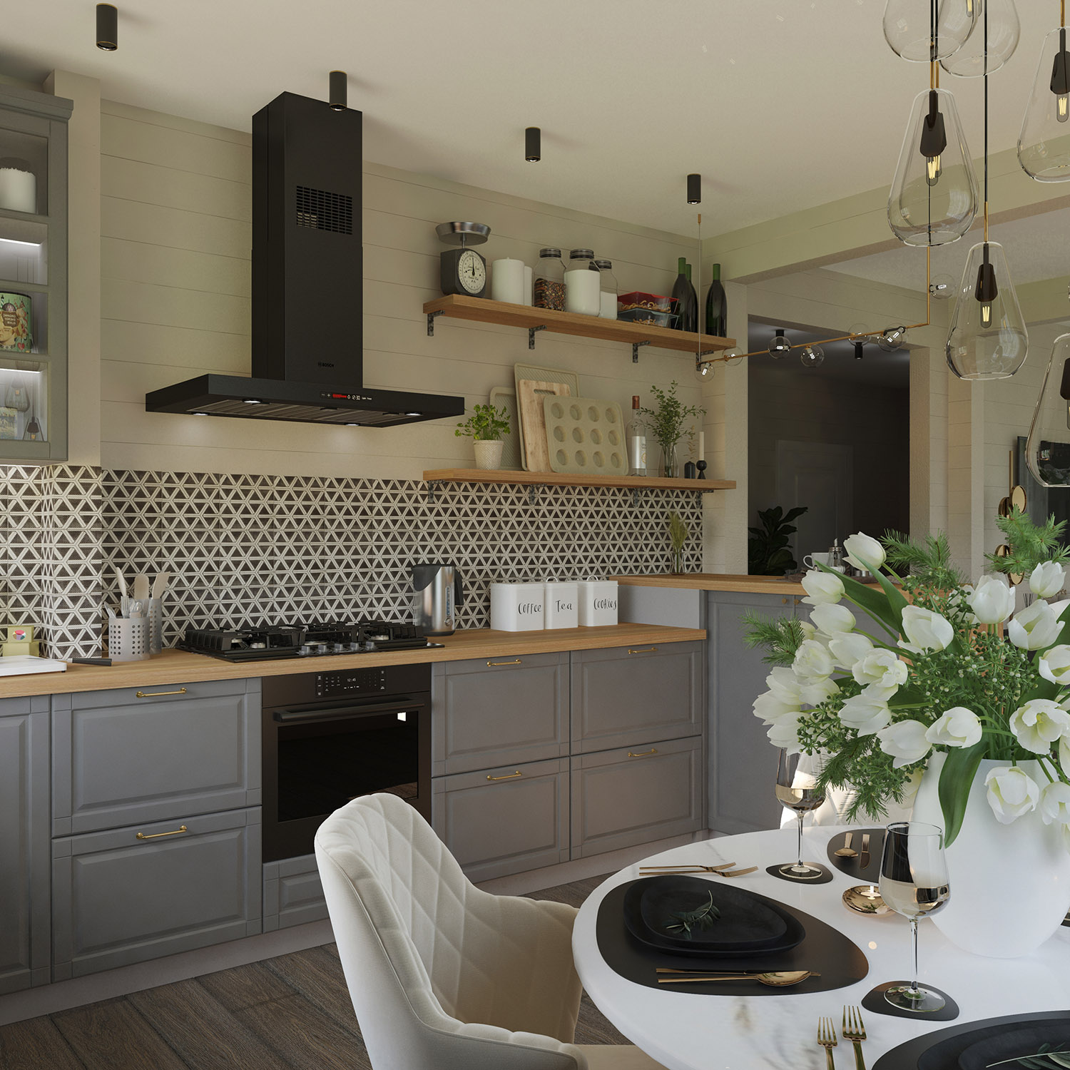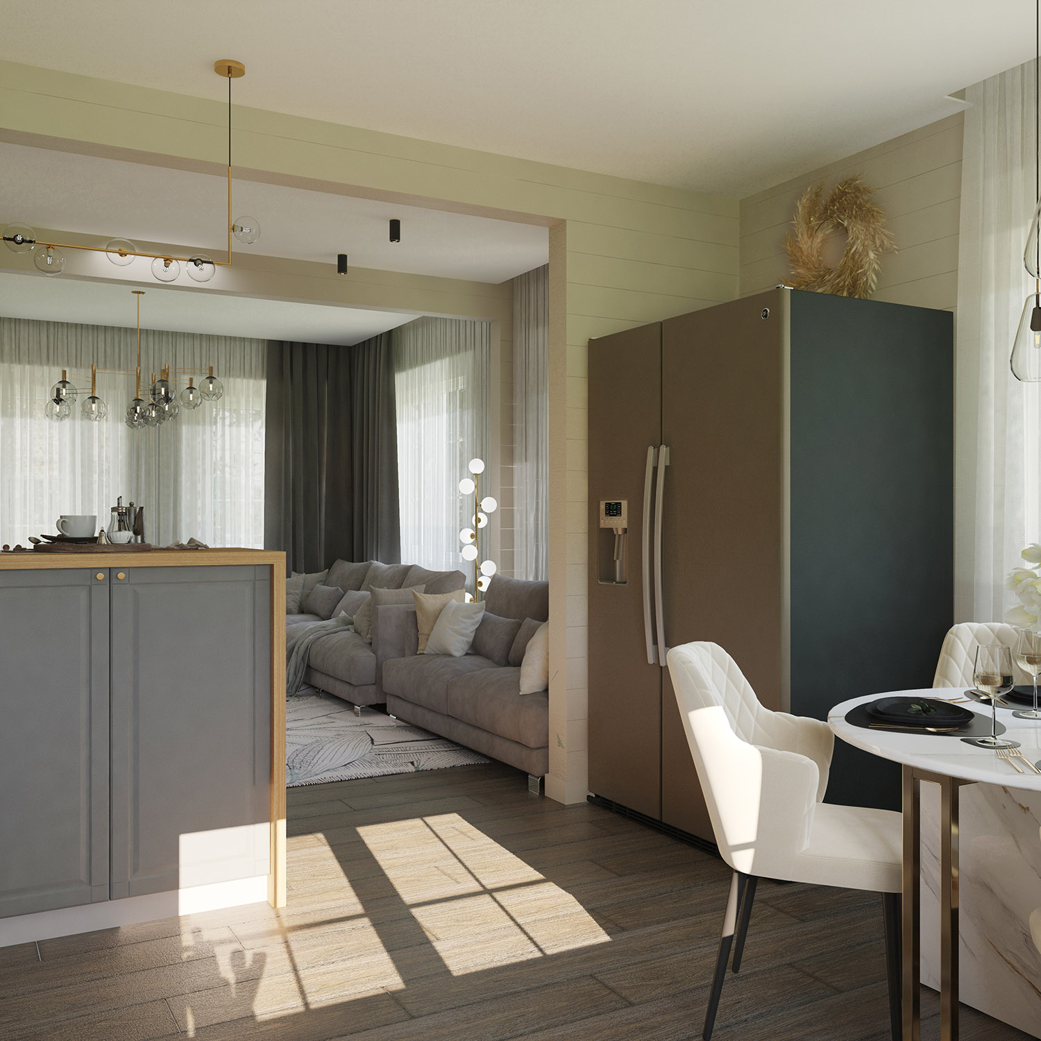 Кухня-гостиная в загородном доме. За окнами снег, а внутри этого помещения царит лето. И это не случайно. Дом находится в очень живописной части д.Циково, и для заказчиков хотелось передать именно ту атмосферу интерьера, что будет к моменту окончания реализации проекта.