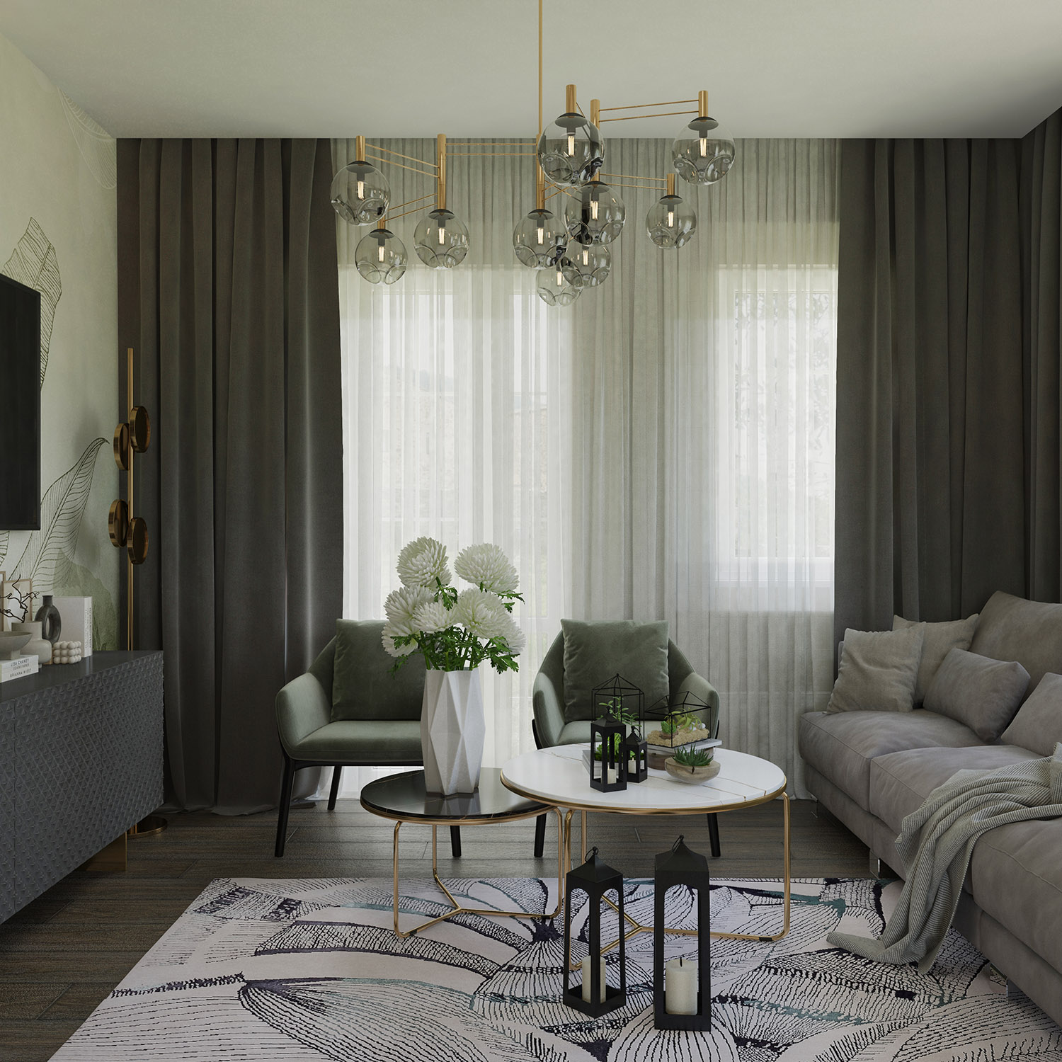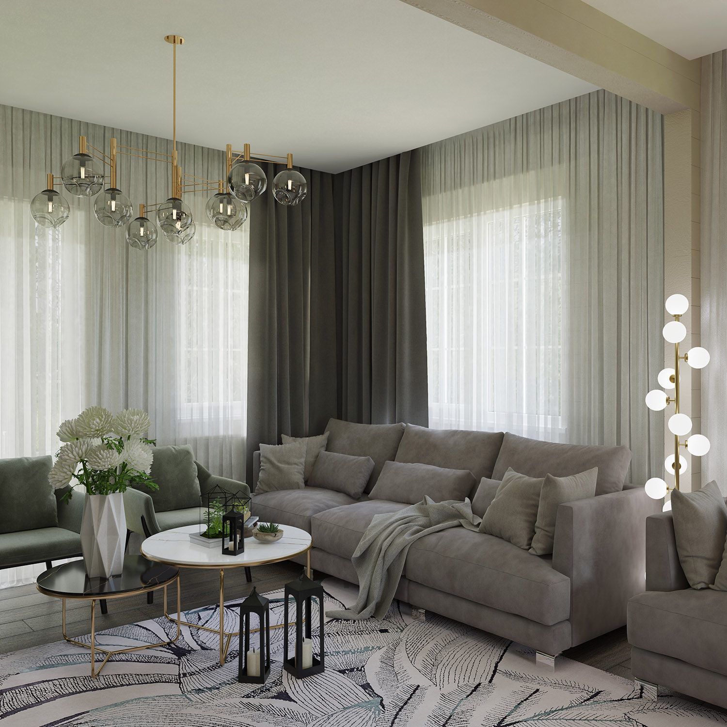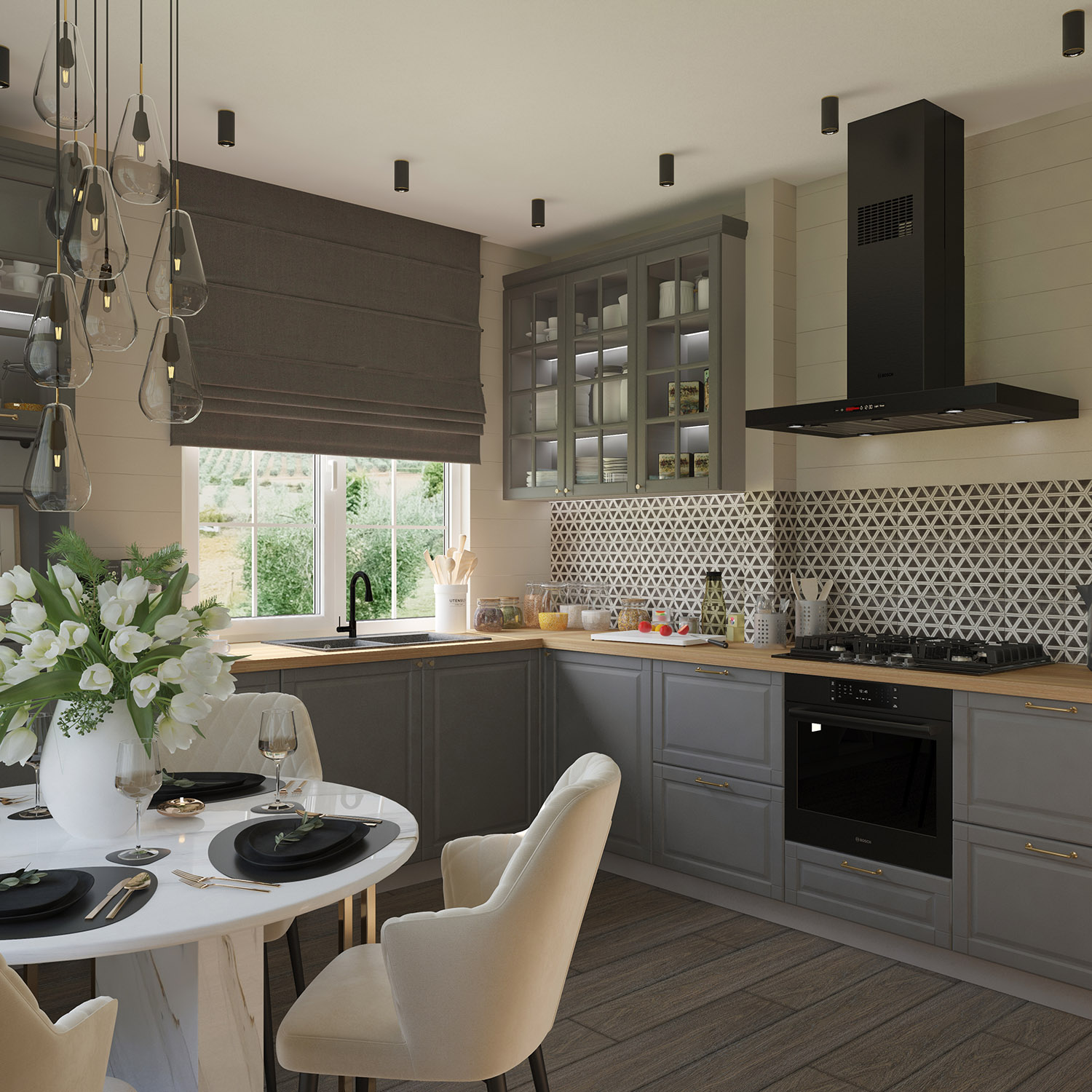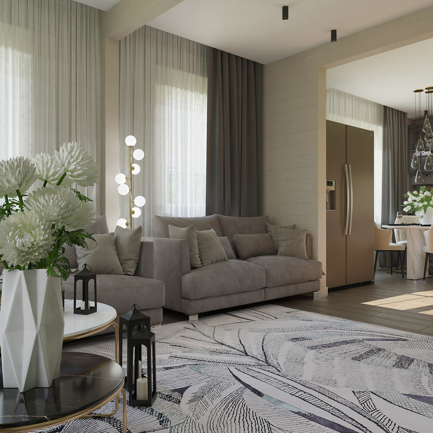 Кухня-гостиная в загородном доме. За окнами снег, а внутри этого помещения царит лето. И это не случайно. Дом находится в очень живописной части д.Циково, и для заказчиков хотелось передать именно ту атмосферу интерьера, что будет к моменту окончания реализации проекта.