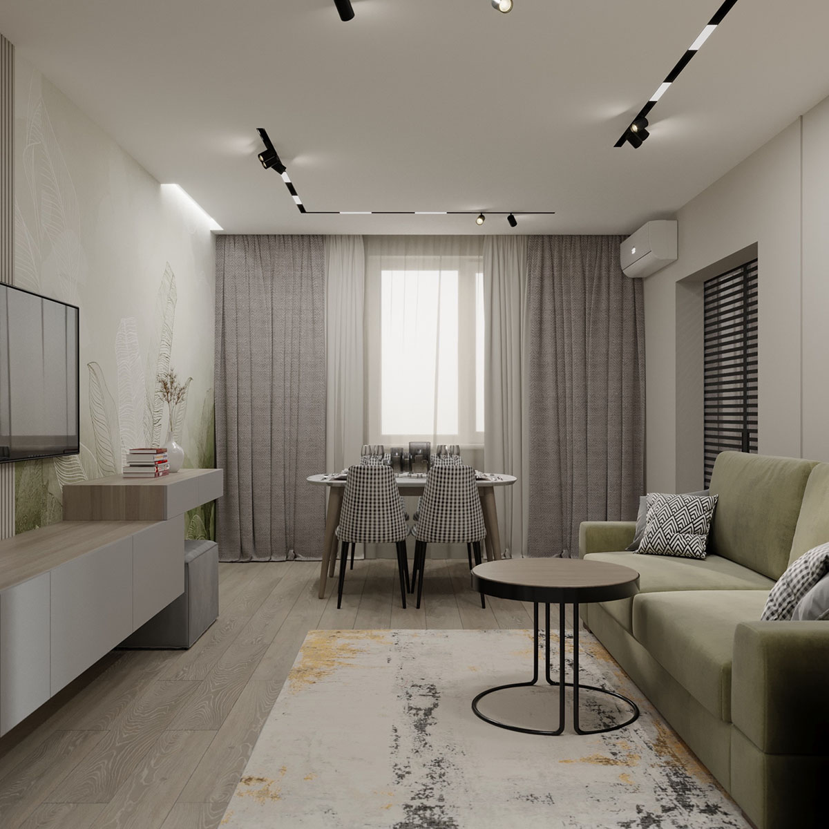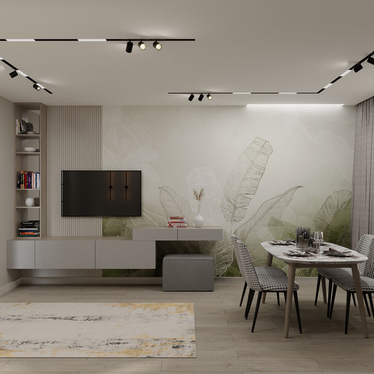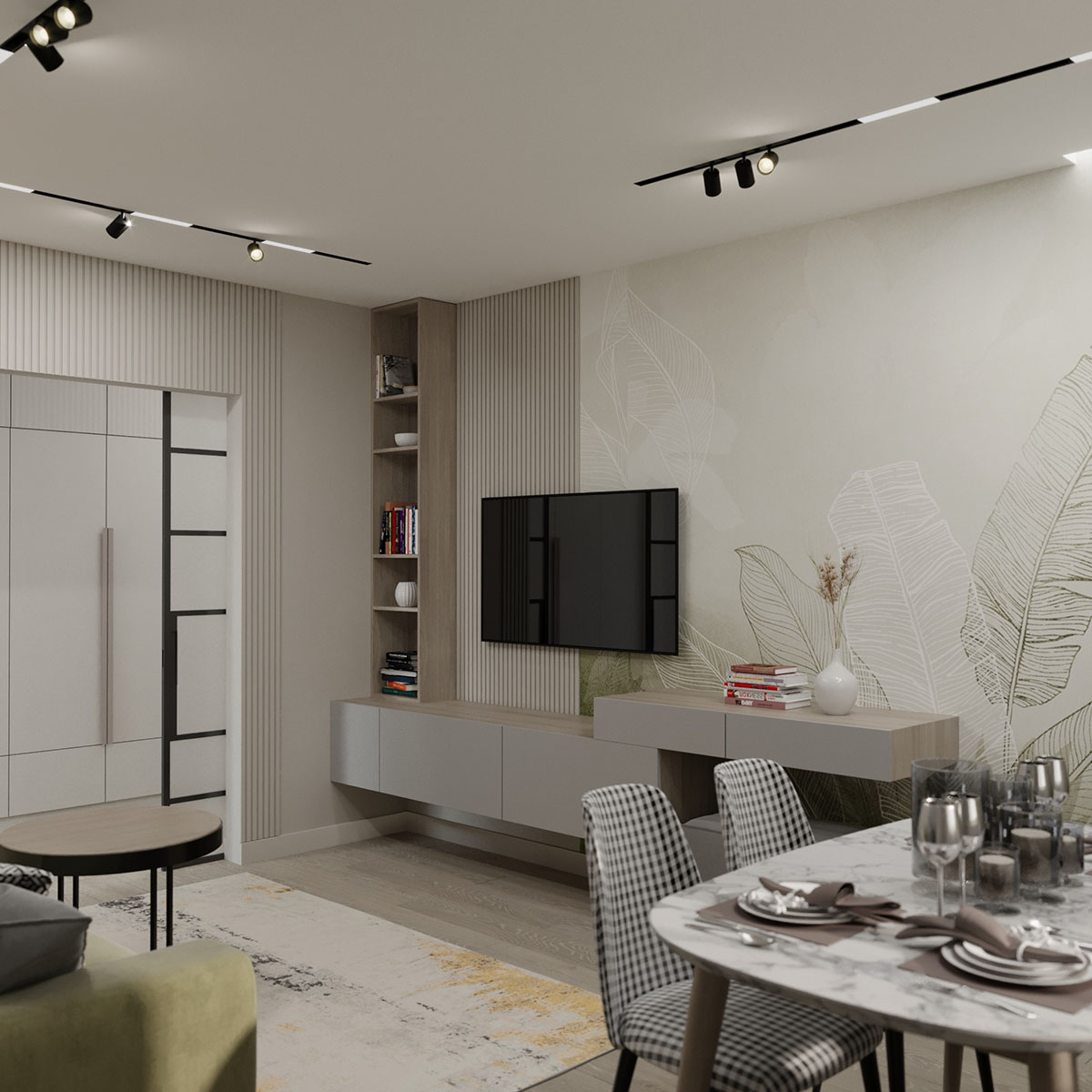 Кухня-гостиная в московской квартире. Обои из коллекции AIR. Светлые пастельные цвета с преобладанием натуральных оттенков создают уют, а длинные растения вытягивают комнату вверх. Стиль и гармония могут проявляться даже в одной стене.