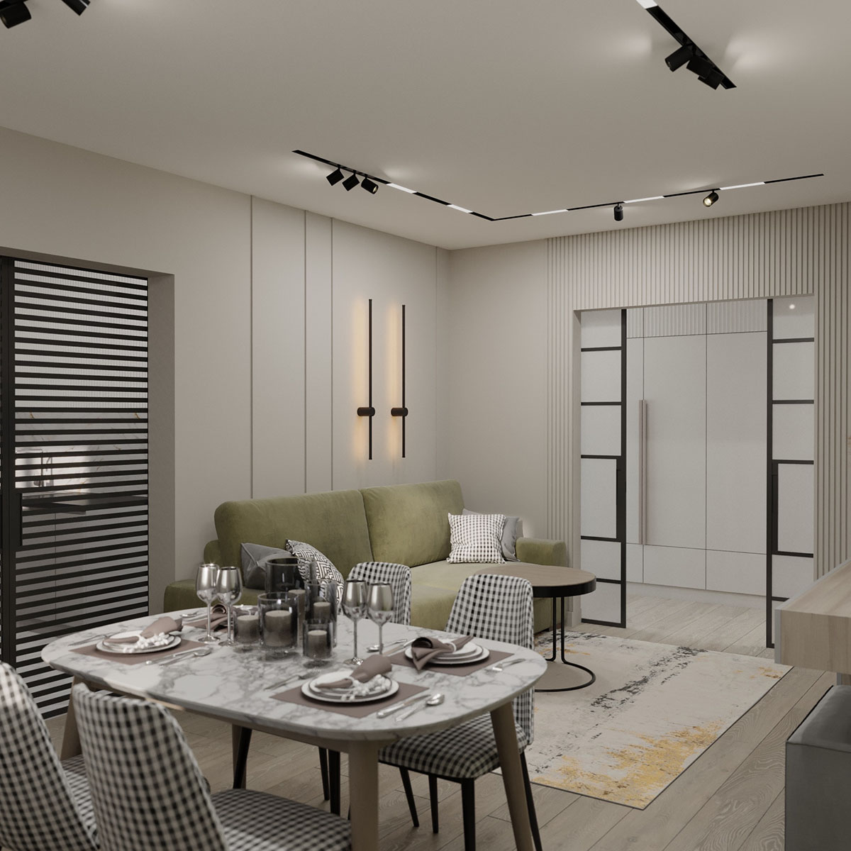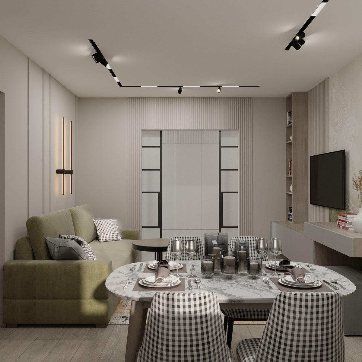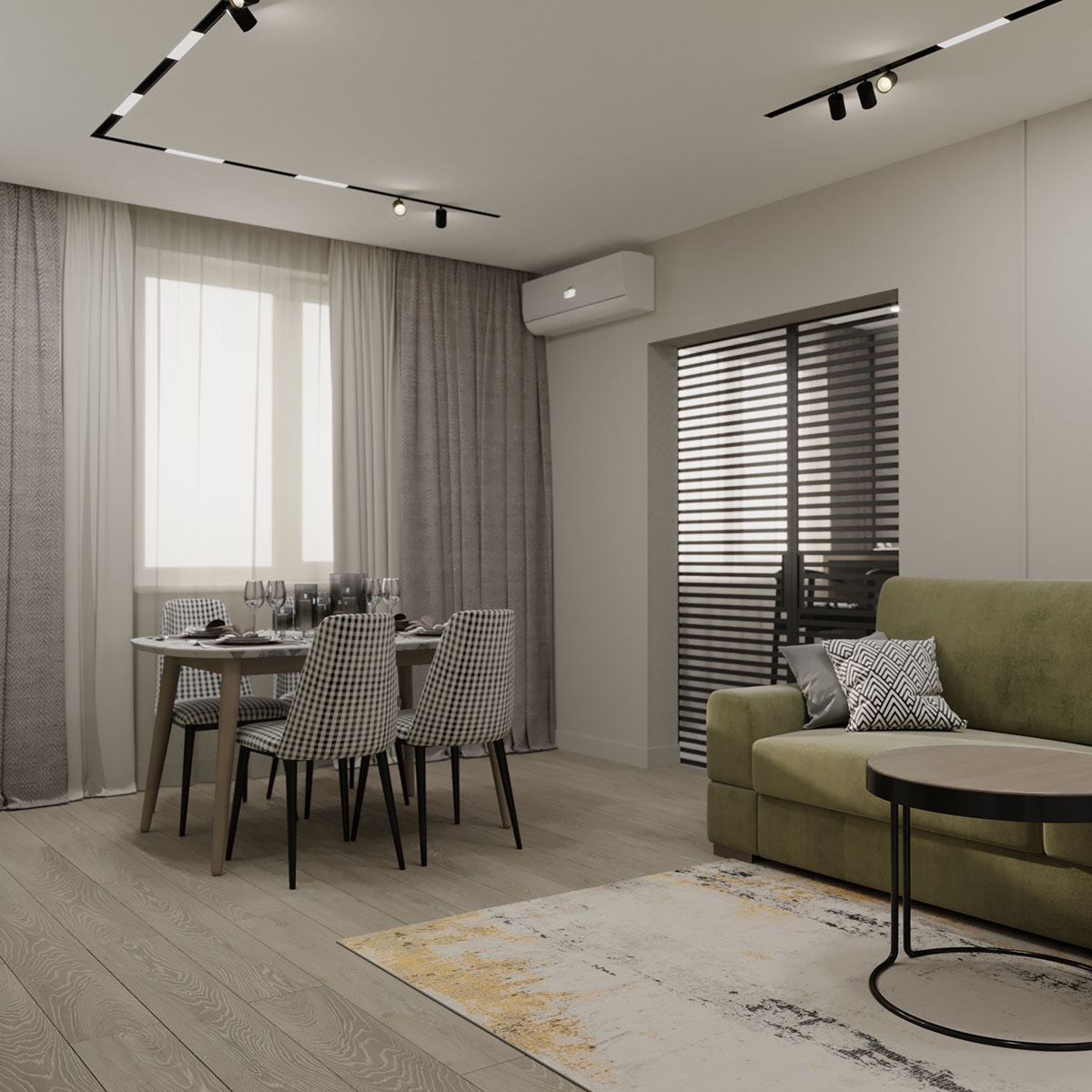 Кухня-гостиная в московской квартире. Обои из коллекции AIR. Светлые пастельные цвета с преобладанием натуральных оттенков создают уют, а длинные растения вытягивают комнату вверх. Стиль и гармония могут проявляться даже в одной стене.