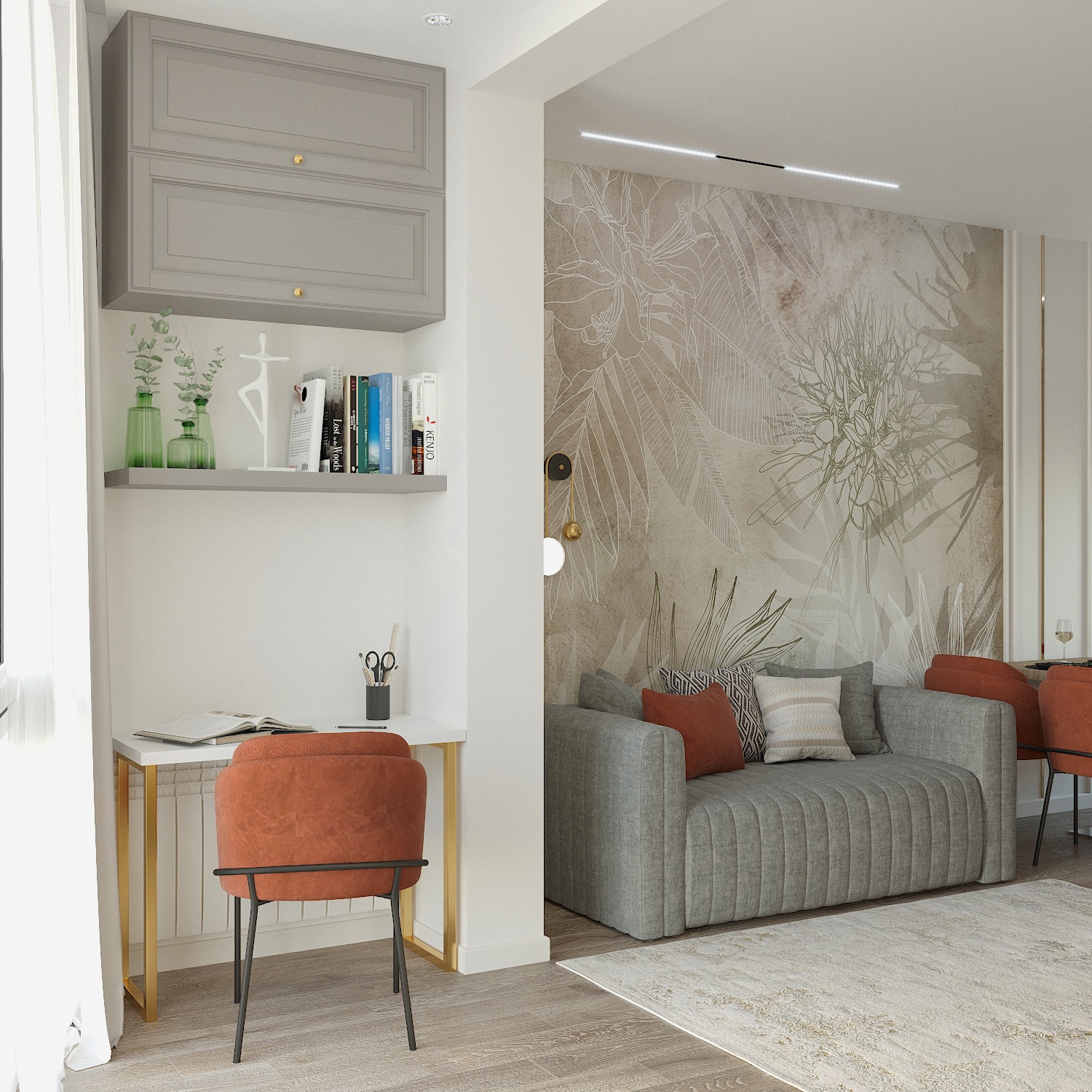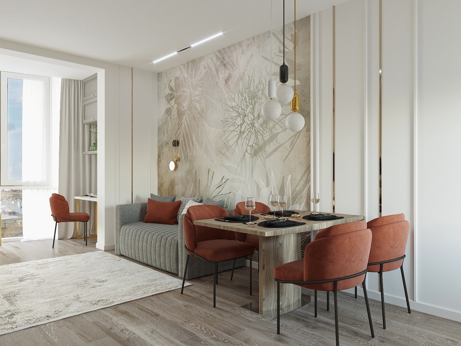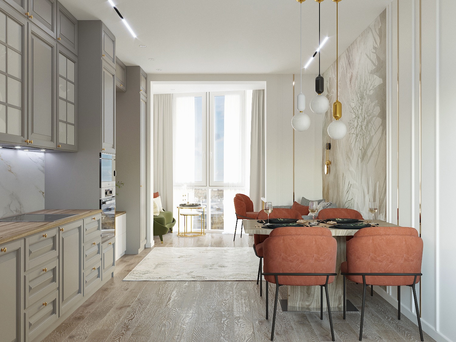 Проект кухни-гостиной для семьи их четырех человек из города Архангельск. По цветовому решению был выбран неяркий зеленый и терракот. Обои из коллекции AIR добавили помещению шарма, отлично вписавшись в цветовую гамму комнаты.