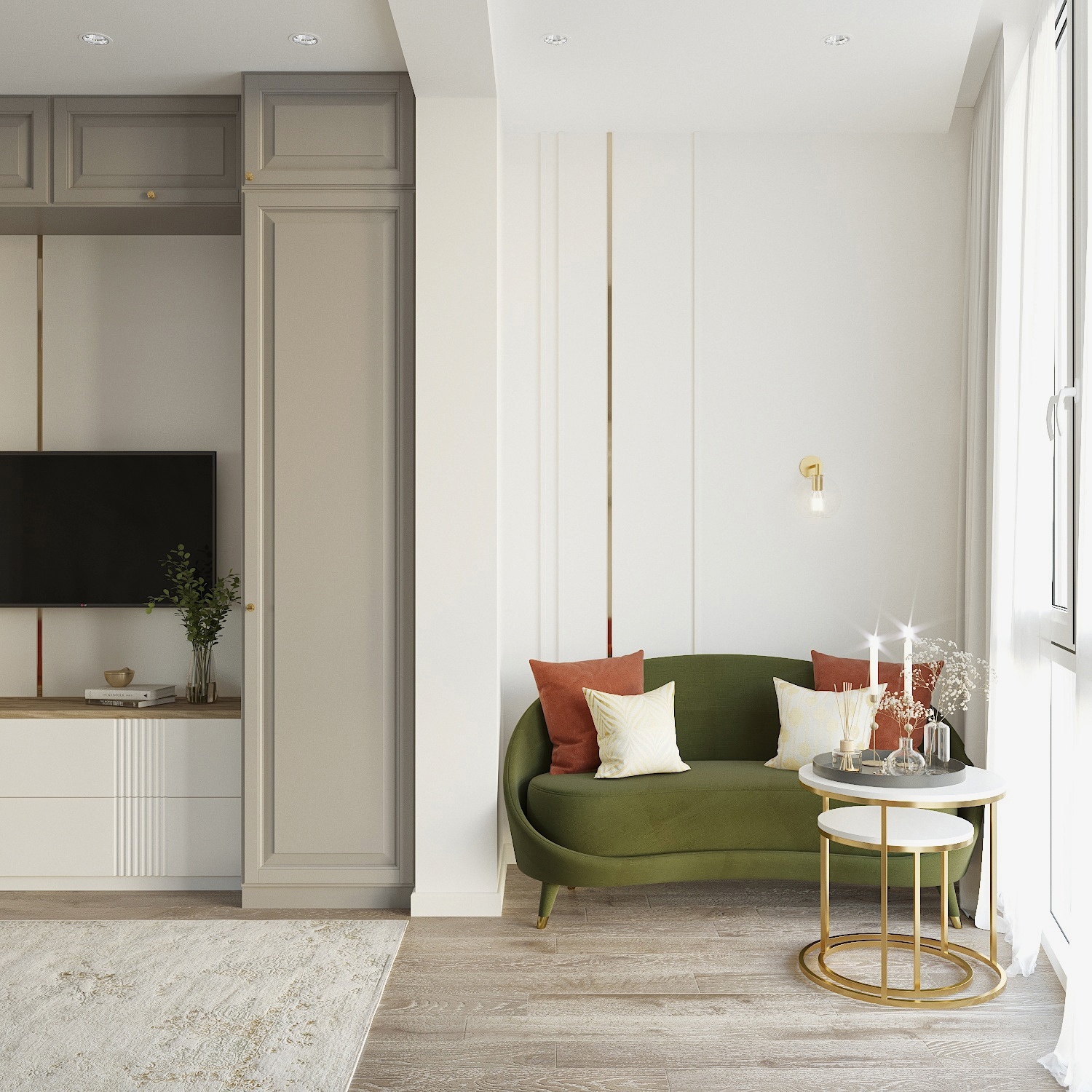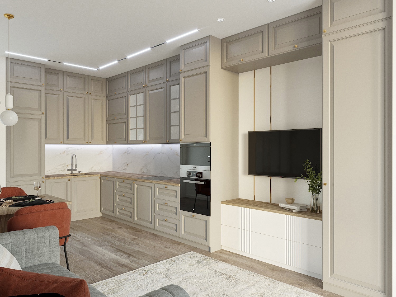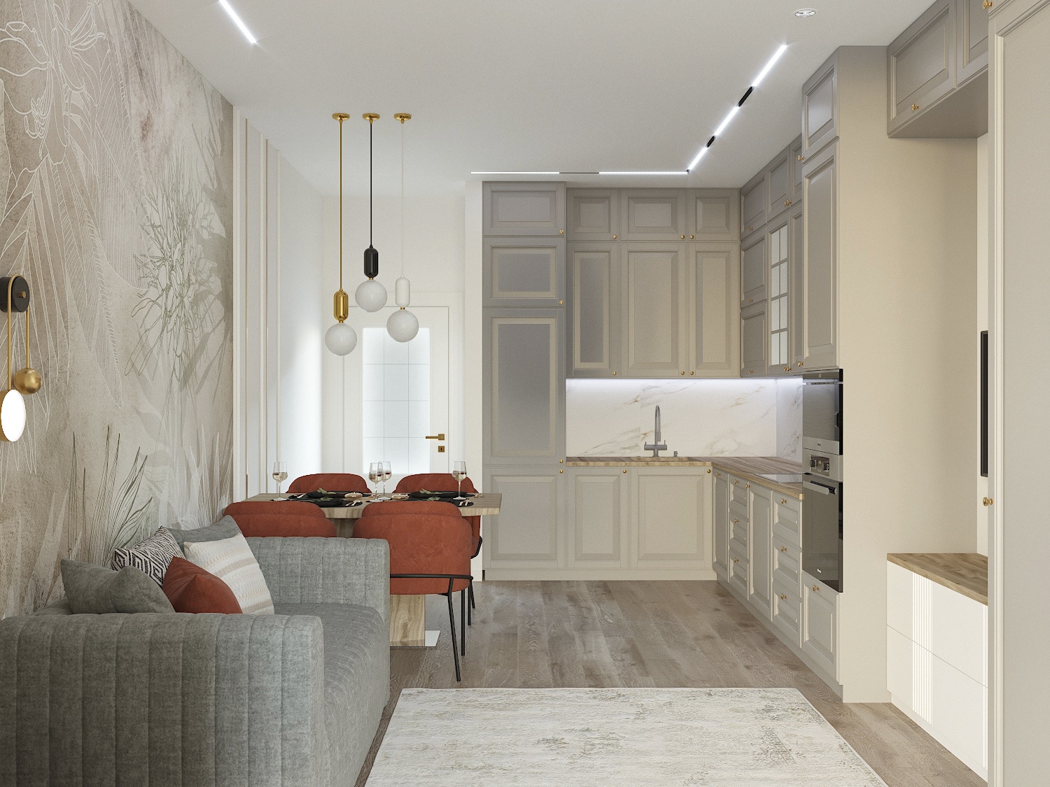 Проект кухни-гостиной для семьи их четырех человек из города Архангельск. По цветовому решению был выбран неяркий зеленый и терракот. Обои из коллекции AIR добавили помещению шарма, отлично вписавшись в цветовую гамму комнаты.