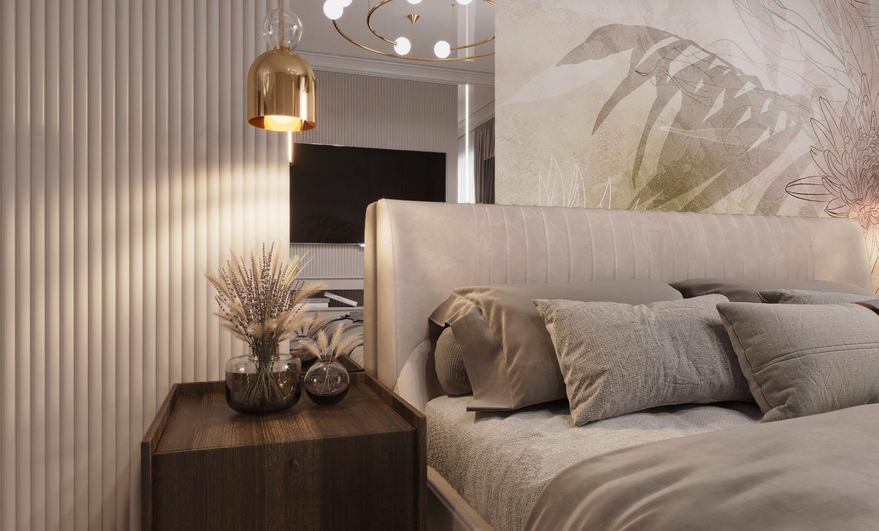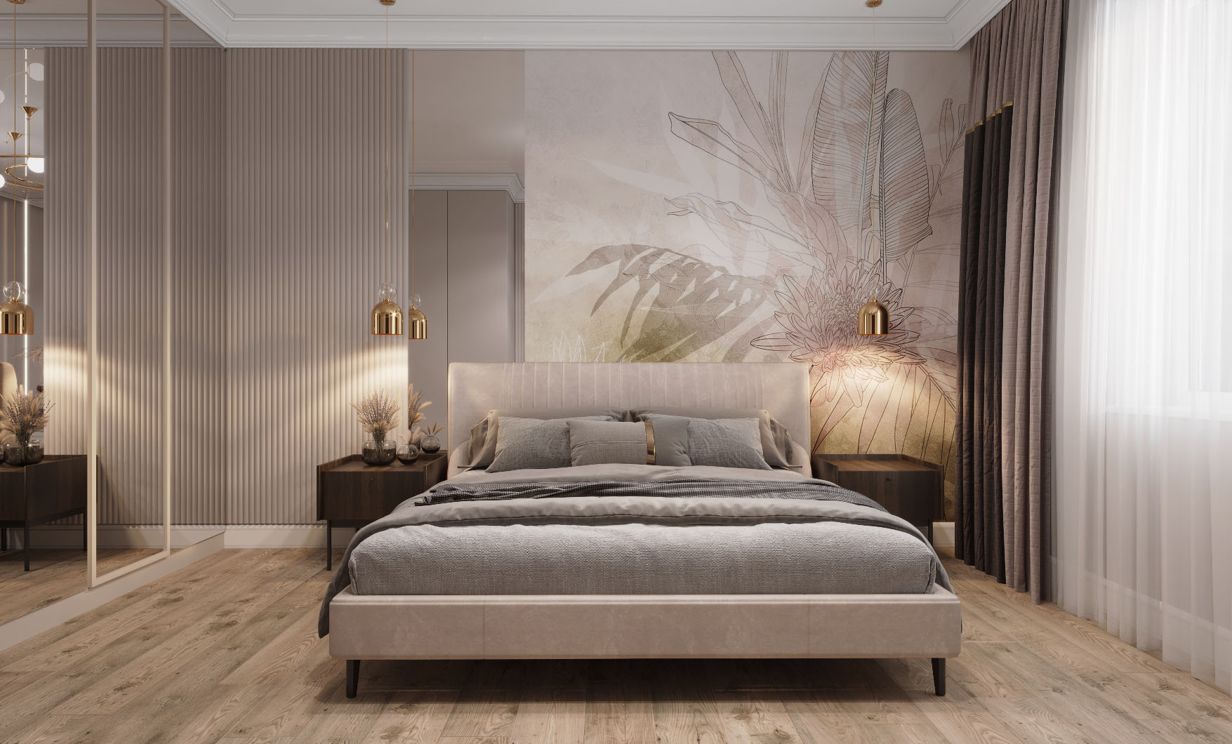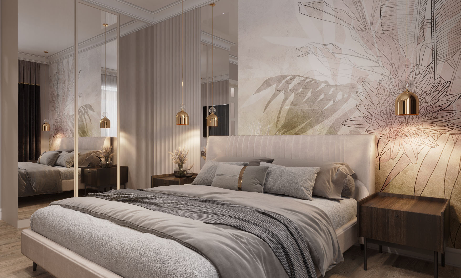 Для этой спальни заказчики выбрали фреску из коллекции Air. Комната по-настоящему начинает «дышать», так как за счет светлых тонов и стройных форм листьев, колосьев и стеблей пространство расширяется. Фигуры либо ложатся тенью на дизайнерские обои, либо очерчены лишь по контуру тонкими линиями. Хозяева же могут обрести спокойствие и гармонию, как после отдыха на природе.