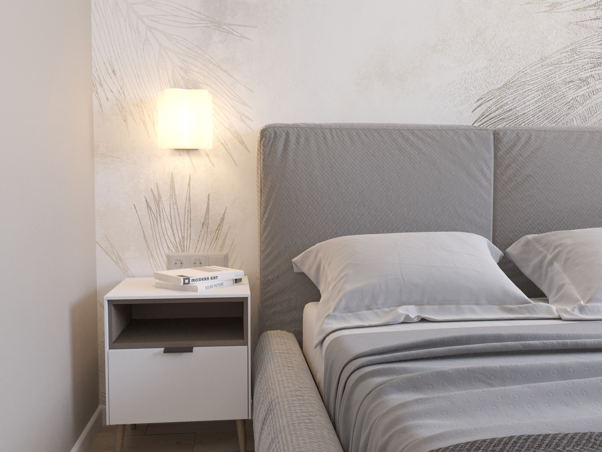 Интерьер мастер-спальни для молодой семьи. Обои из коллекции Air. С ней комната по-настоящему начинает «дышать», так как за счет светлых тонов и стройных форм листьев, колосьев и стеблей пространство расширяется. Фигуры либо ложатся тенью на дизайнерские обои, либо очерчены лишь по контуру тонкими линиями. Хозяева же могут обрести спокойствие и гармонию, как после отдыха на природе.
