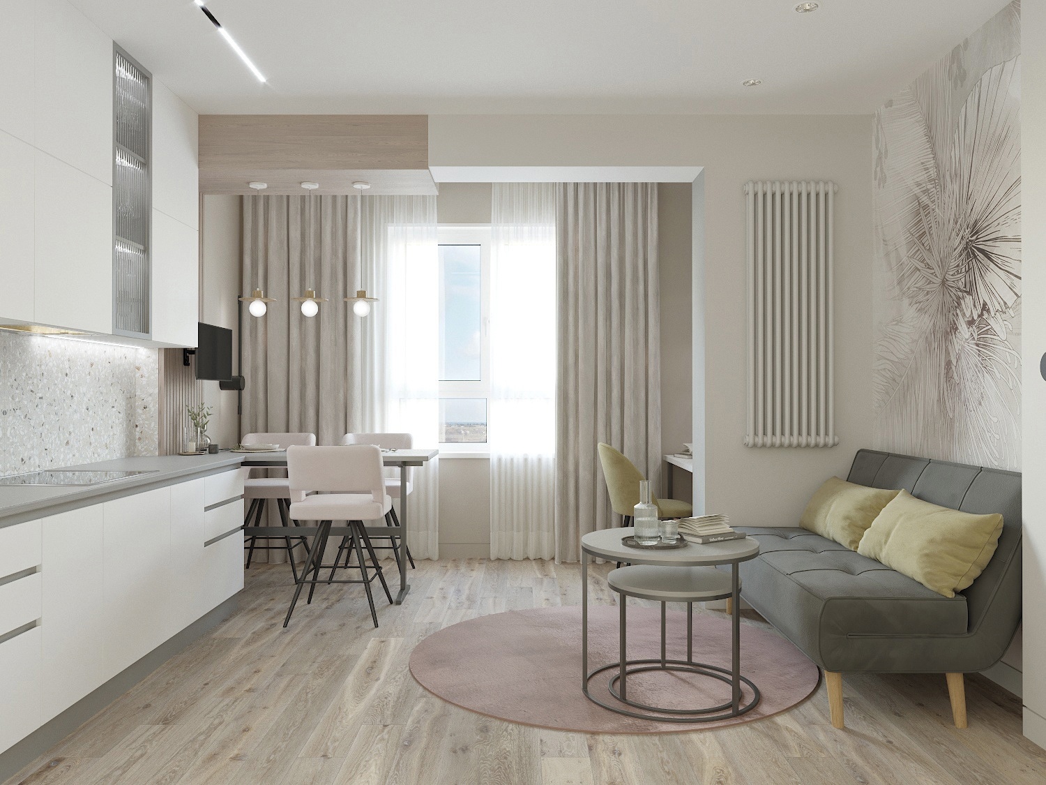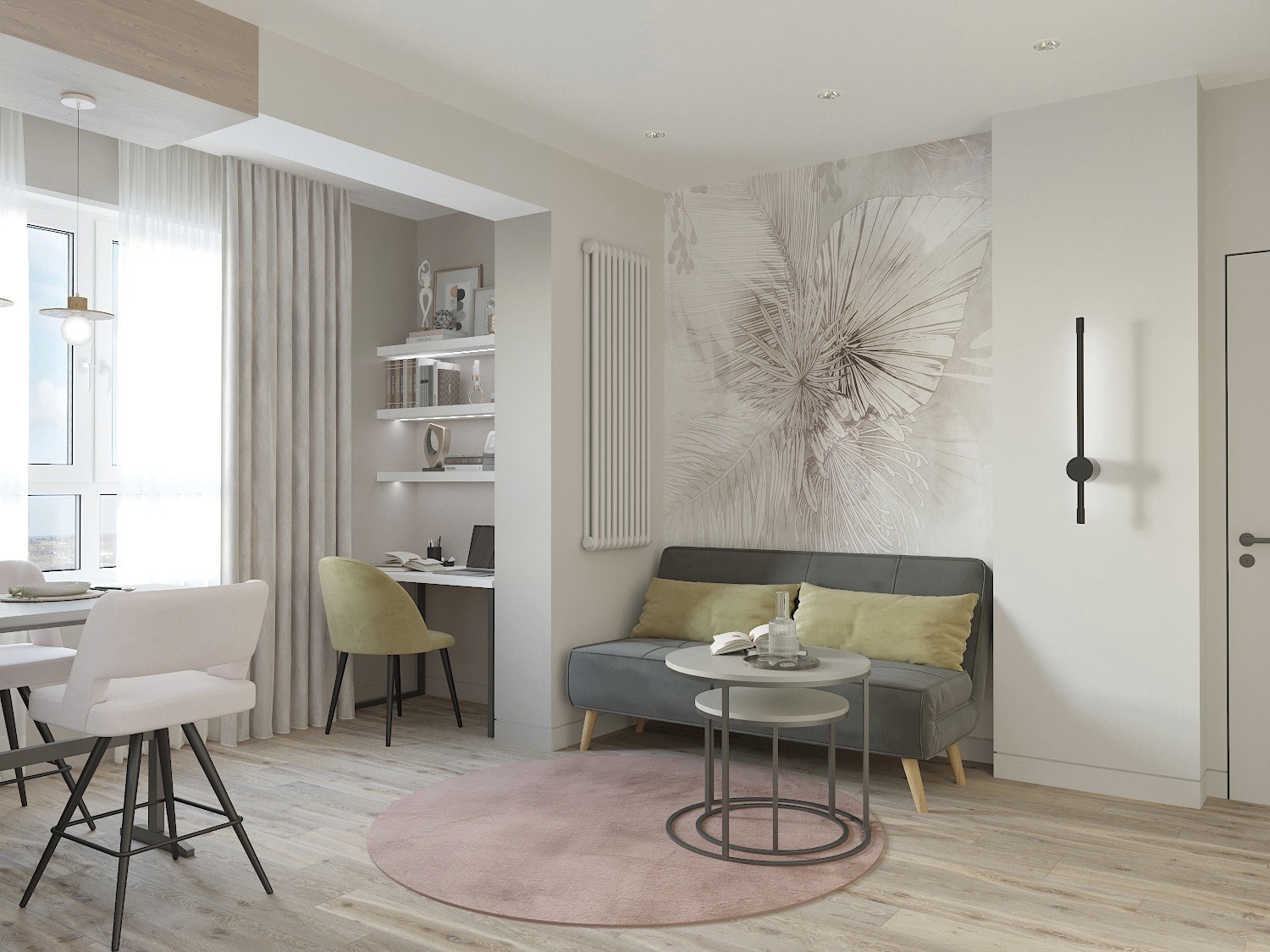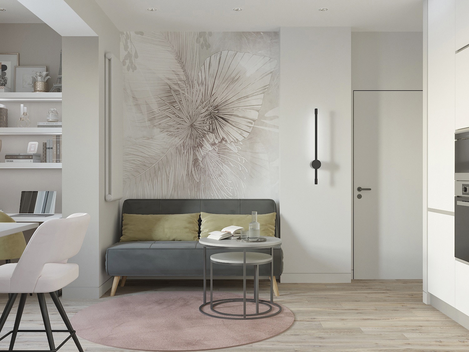 Кухня-гостиная площадью 20 м² в пастельно-серых оттенках. Обои из коллекции AIR. Светлые пастельные цвета с преобладанием натуральных оттенков создают уют, а длинные растения вытягивают комнату вверх. Стиль и гармония могут проявляться даже в одной стене.