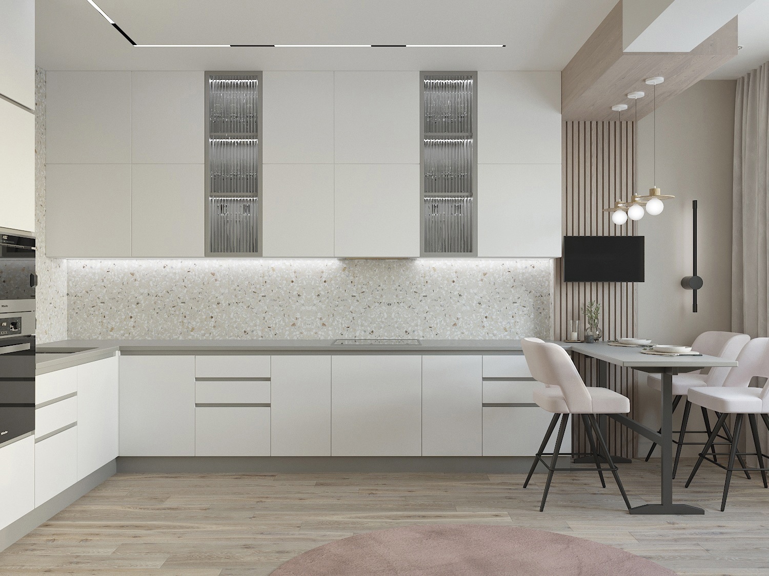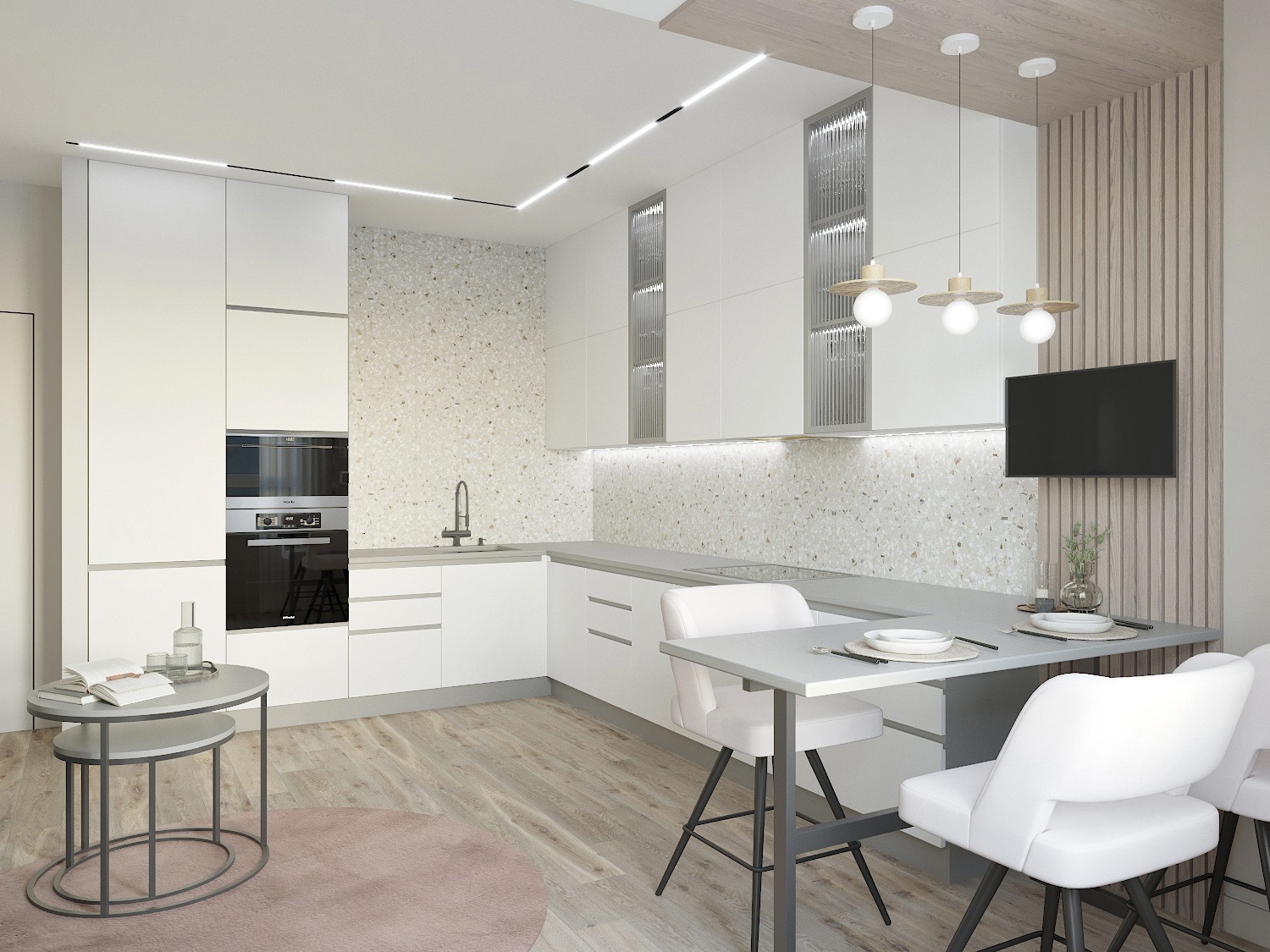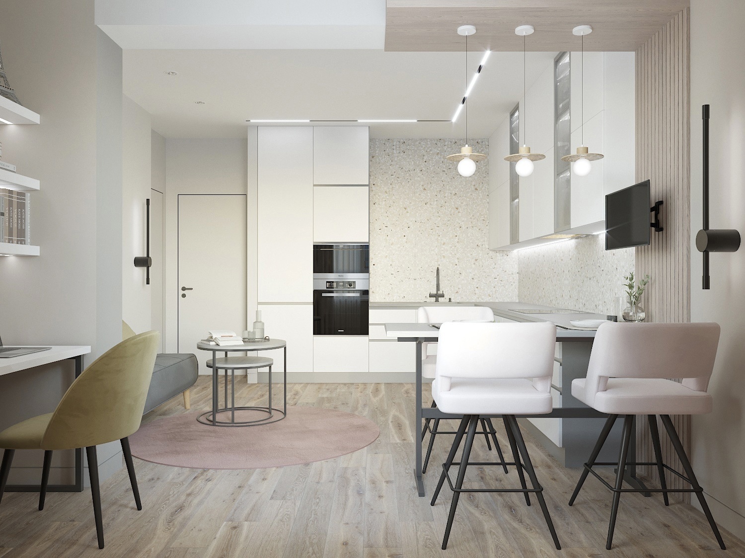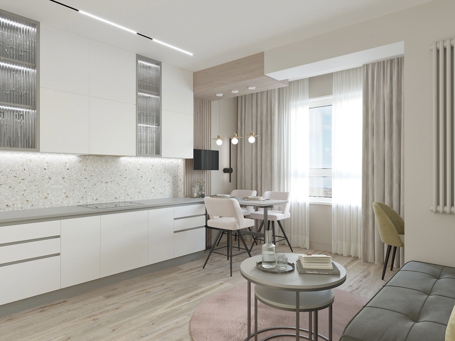 Кухня-гостиная площадью 20 м² в пастельно-серых оттенках. Обои из коллекции AIR. Светлые пастельные цвета с преобладанием натуральных оттенков создают уют, а длинные растения вытягивают комнату вверх. Стиль и гармония могут проявляться даже в одной стене.