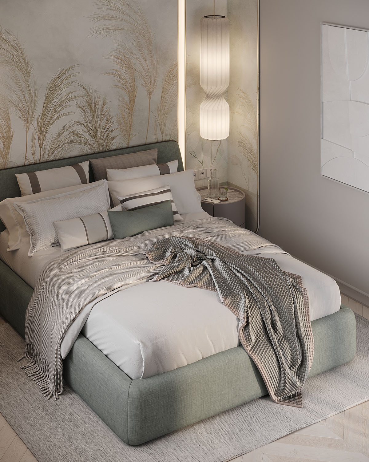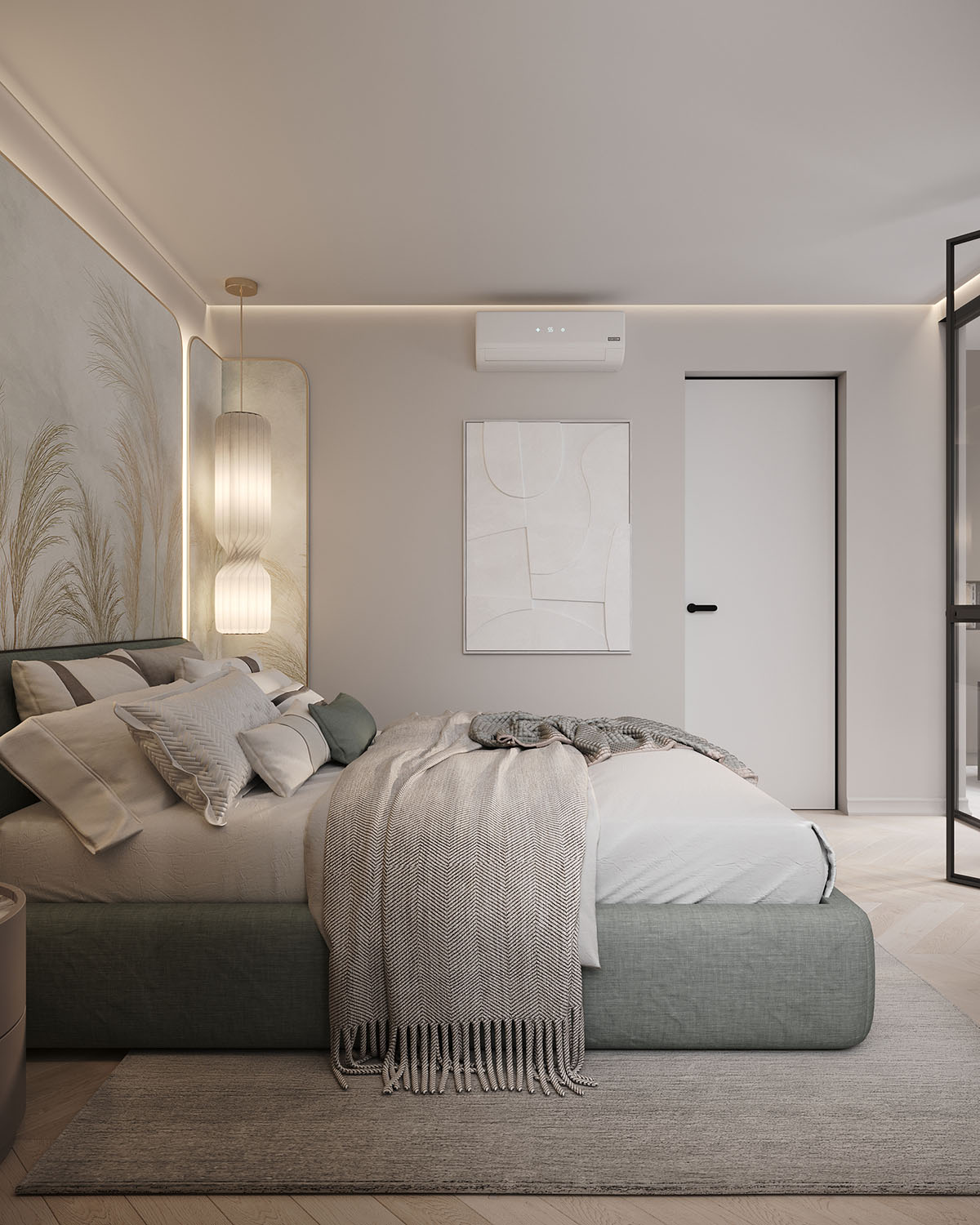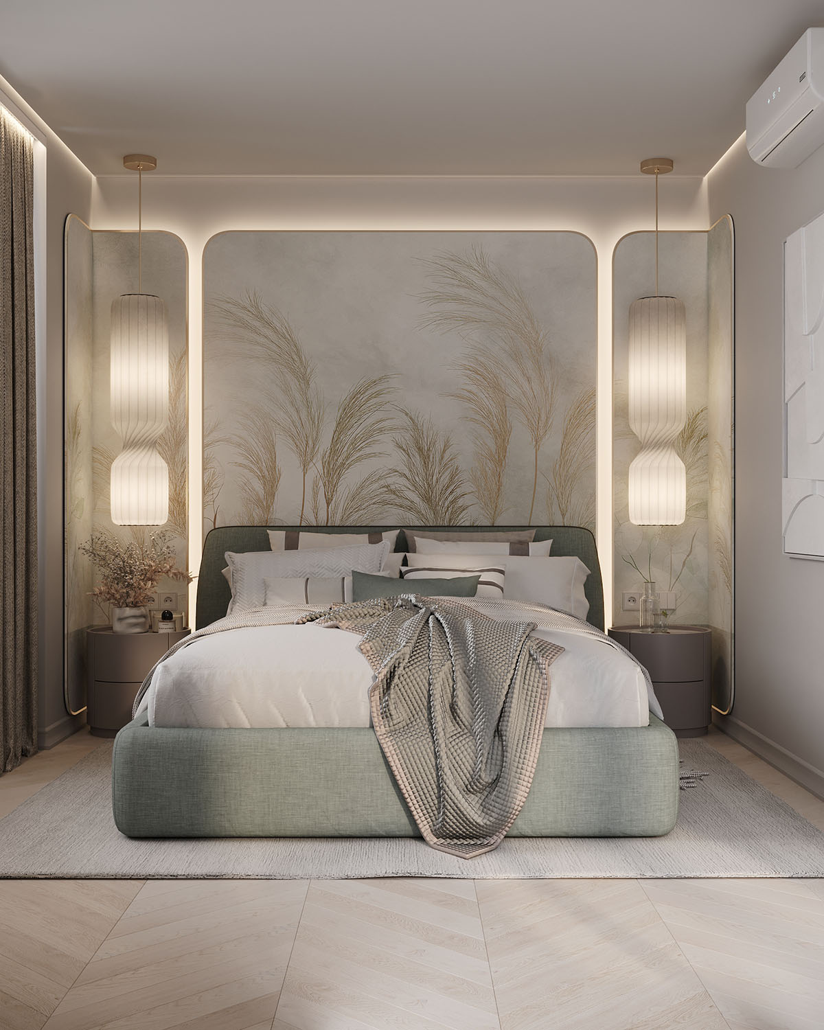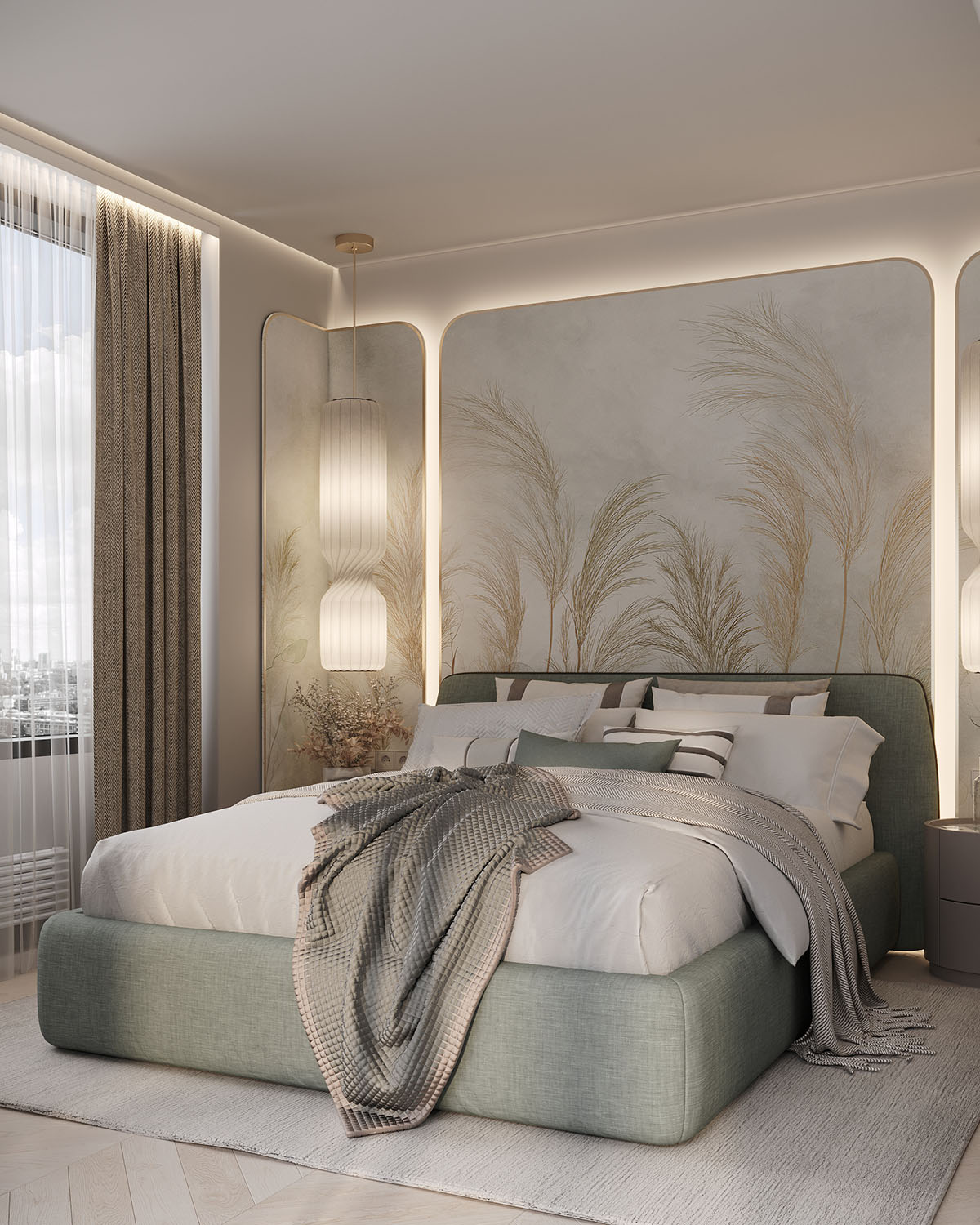 Спальня в небольшой квартире в ЖК Atlantis Deluxe, г. Казань. Обои из коллекции AIR. Светлые пастельные цвета с преобладанием натуральных оттенков создают уют, а длинные растения вытягивают комнату вверх. Стиль и гармония могут проявляться даже в одной стене.