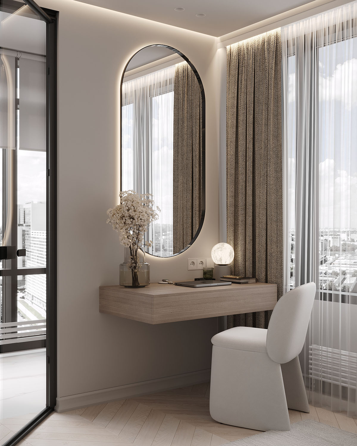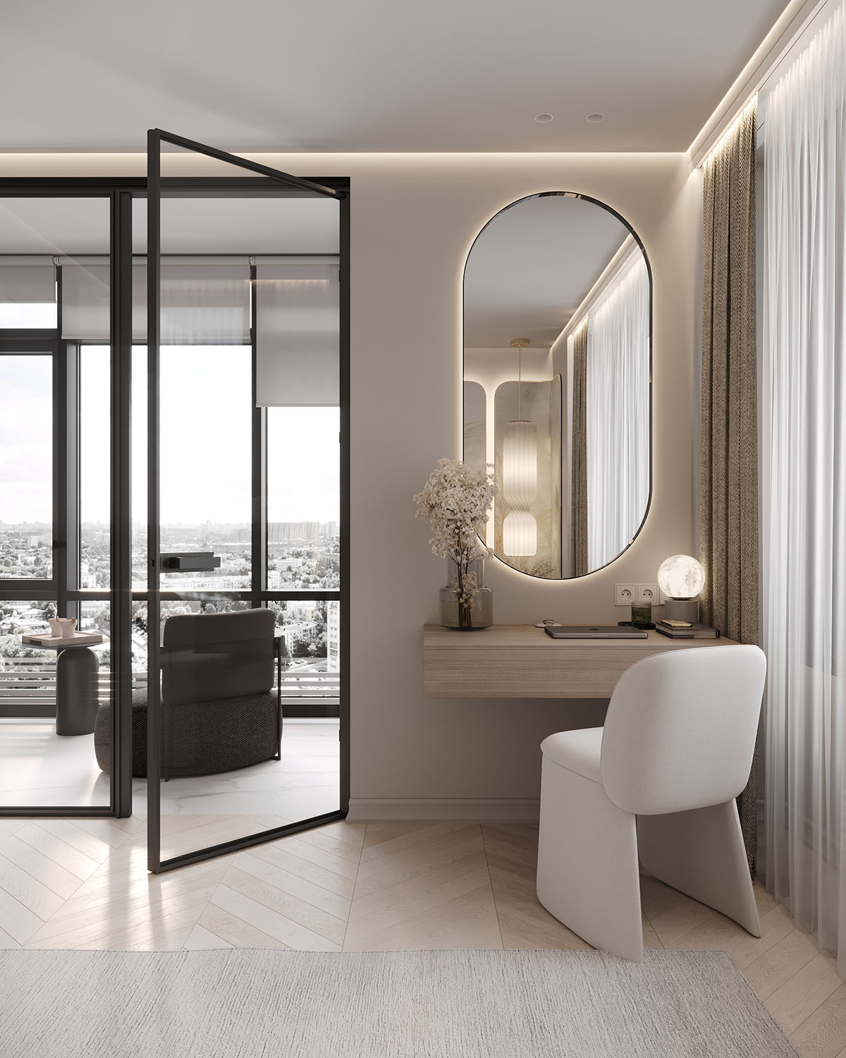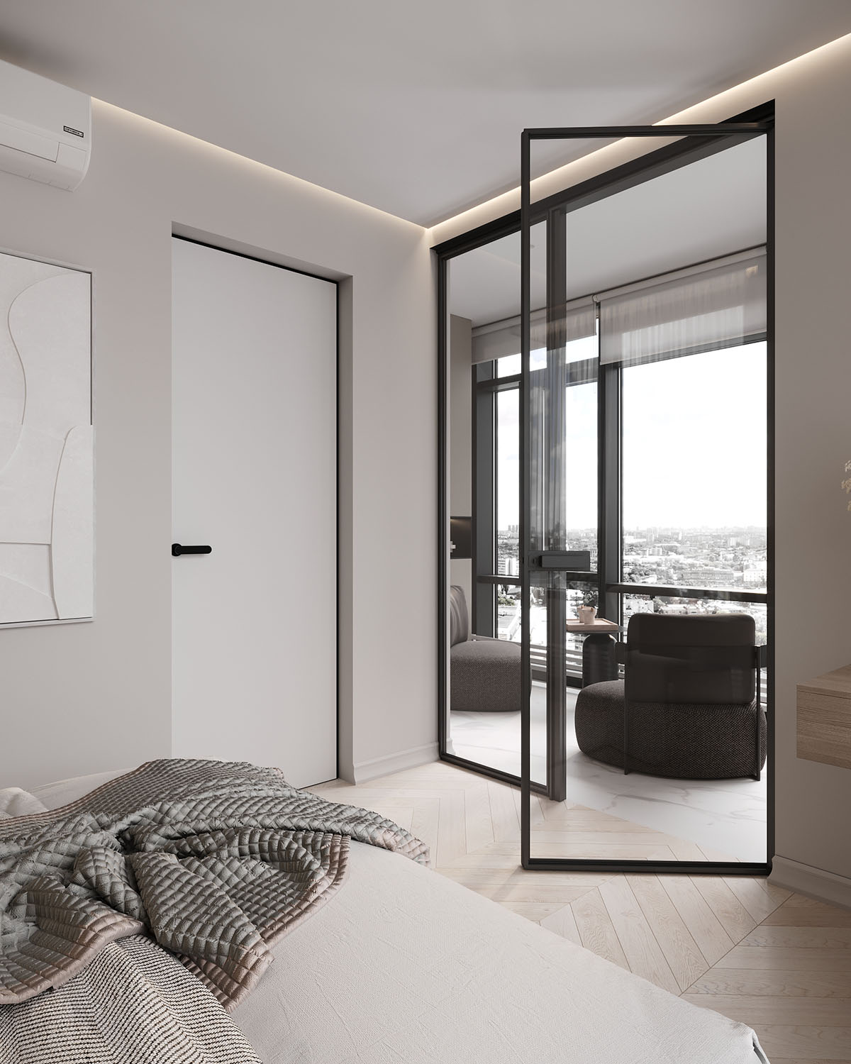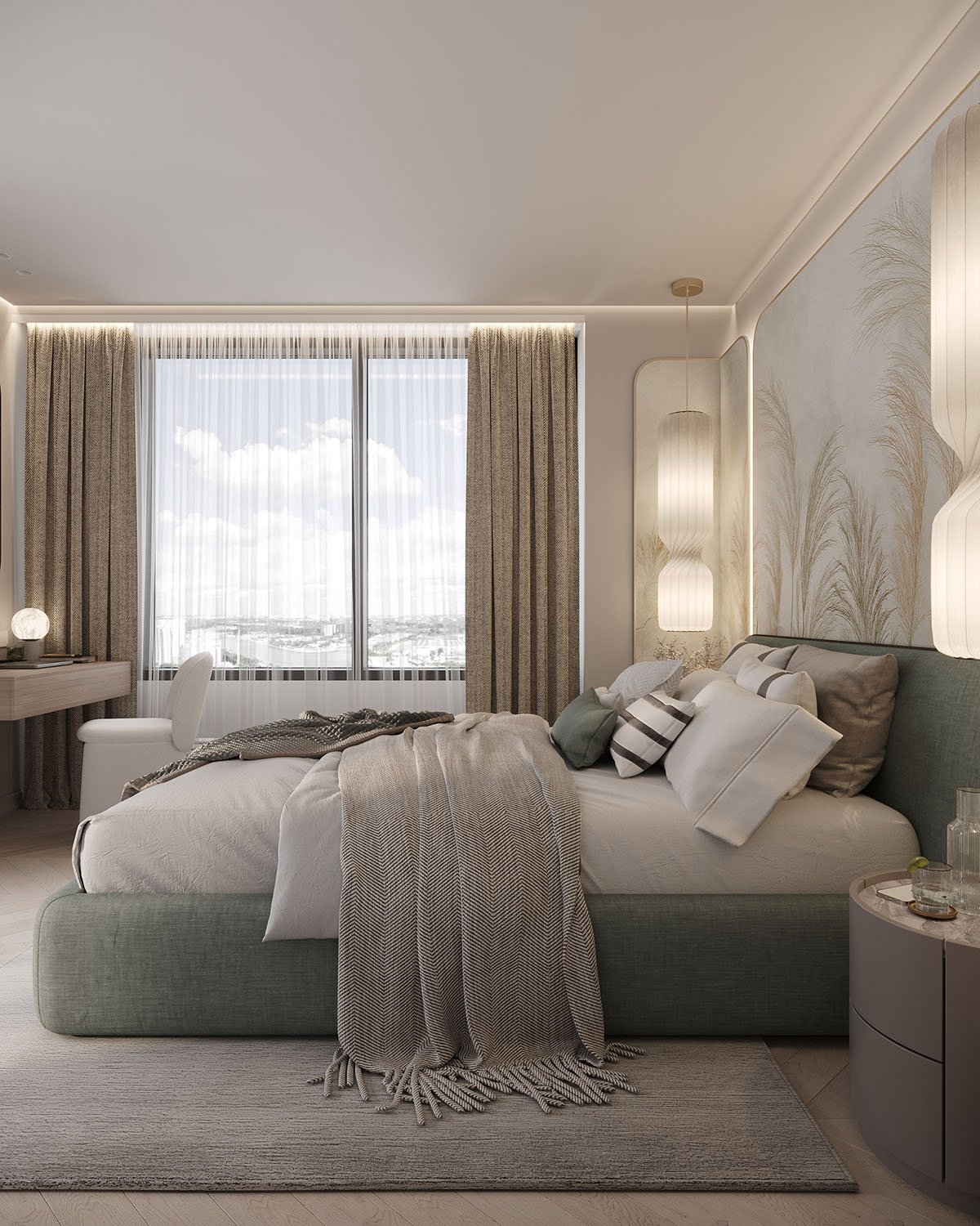 Спальня в небольшой квартире в ЖК Atlantis Deluxe, г. Казань. Обои из коллекции AIR. Светлые пастельные цвета с преобладанием натуральных оттенков создают уют, а длинные растения вытягивают комнату вверх. Стиль и гармония могут проявляться даже в одной стене.