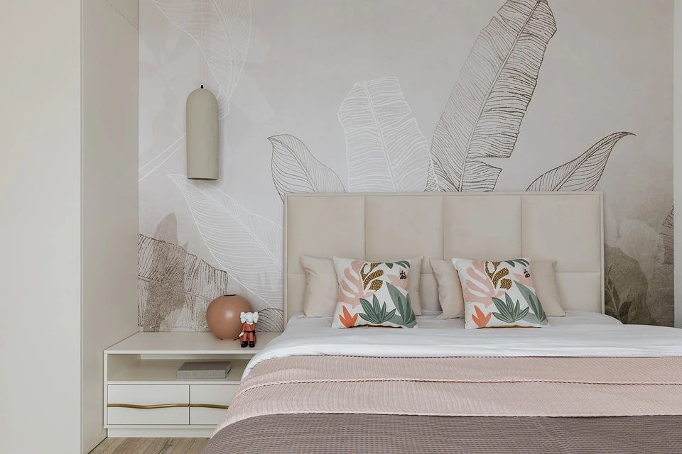 Один из элементов художественного оформления детской — стена с большой фреской. При выборе фрески в детскую комнату дизайнер сделал ставку на полотно с нейтрально-фоновым принтом, который будет актуален долгое время. Кроме того, для ребенка его комната — это место учебы, игровая и спальня одновременно. Фреска неярких цветов смотрится здесь органично. Она не мешает уснуть или сосредоточиться на учебе. Конечно, стена, ставшая акцентной, привлекает внимание, но не перегружает интерьер. А ее расположение за изголовьем кровати обозначает функциональную зону. При этом декор не виден во время отдыха и вряд ли надоест.