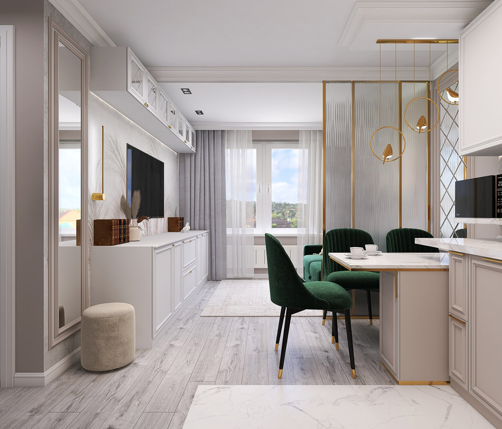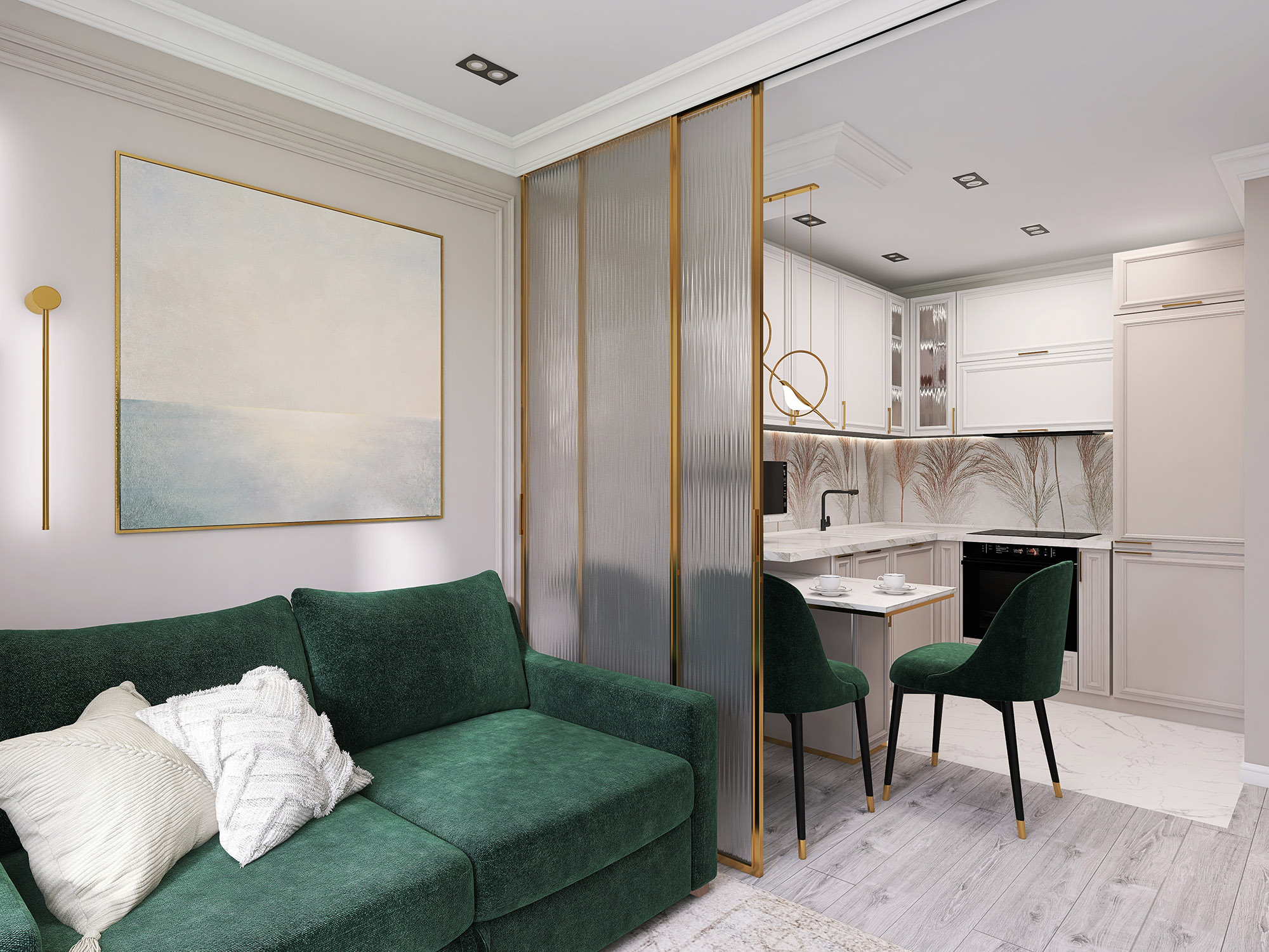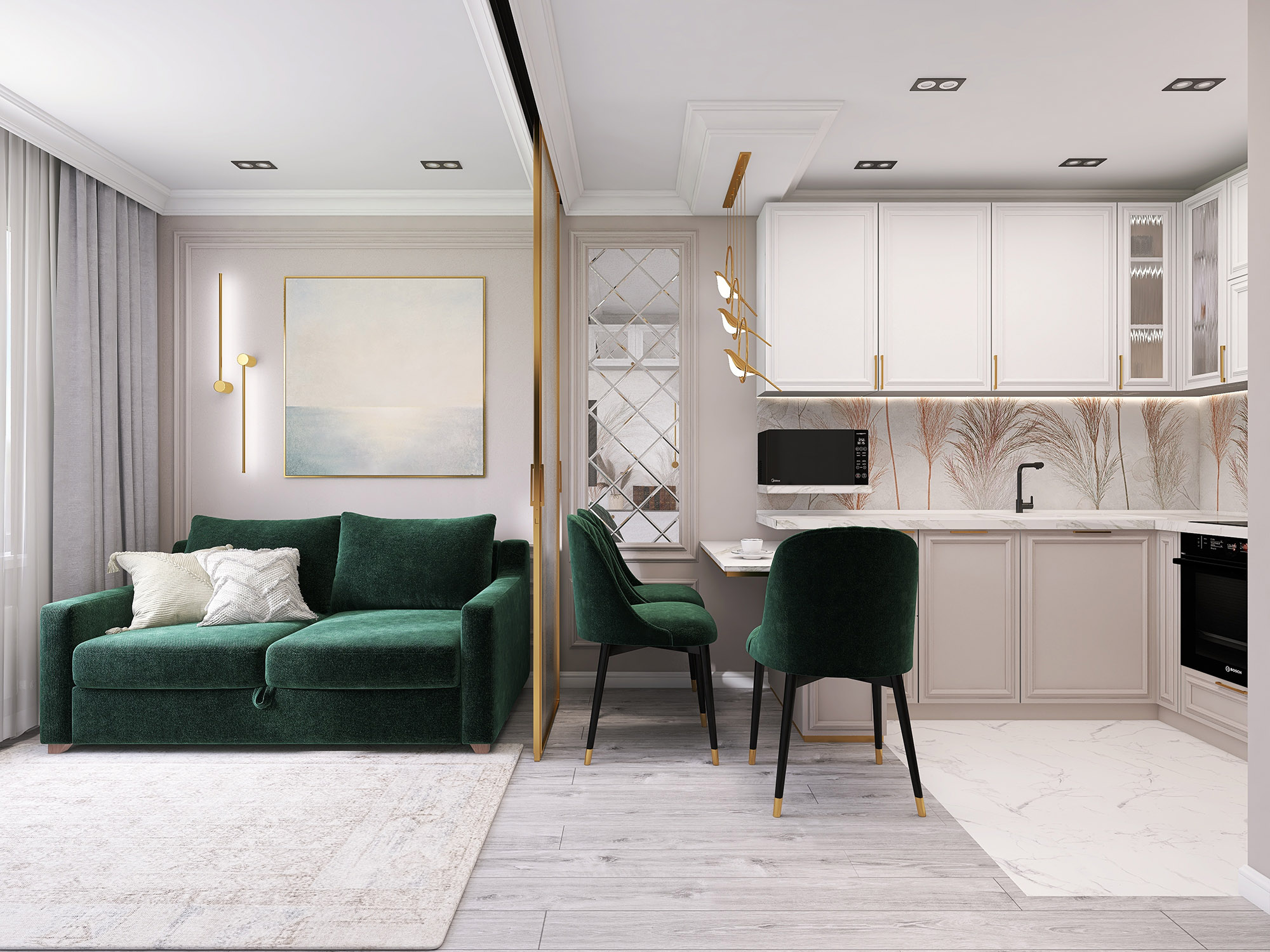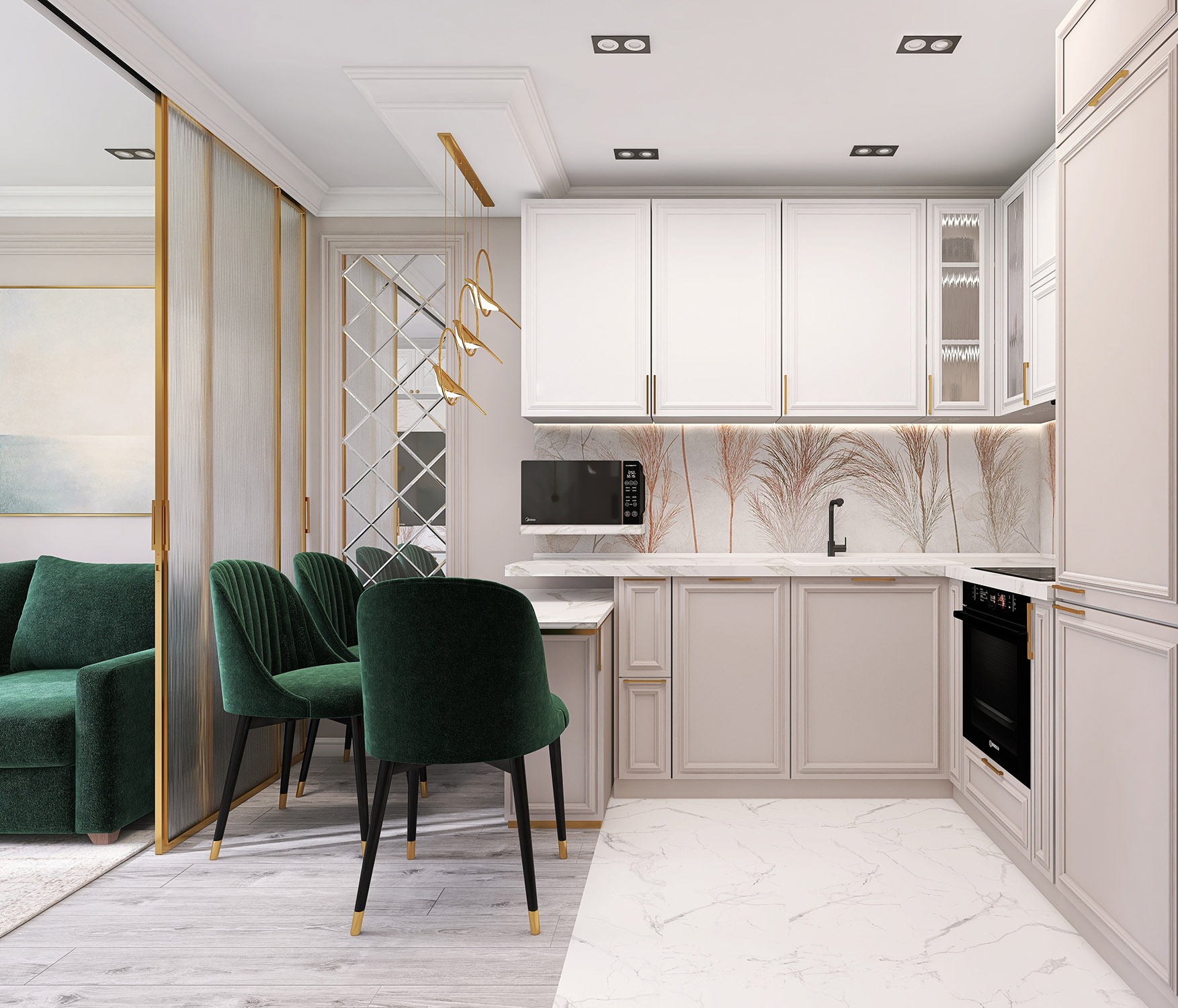 Проект кухни-гостиной для бабушки 80 лет. Обои из коллекции «Air». Комната по-настоящему начинает «дышать», так как за счет светлых тонов и стройных форм листьев, колосьев и стеблей пространство расширяется. Фигуры либо ложатся тенью на дизайнерские обои, либо очерчены лишь по контуру тонкими линиями. Хозяева же могут обрести спокойствие и гармонию, как после отдыха на природе.