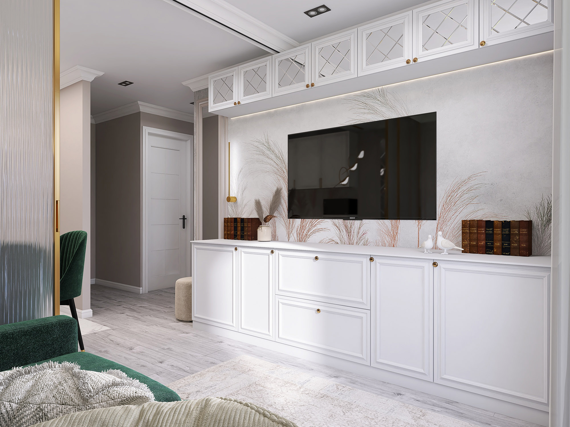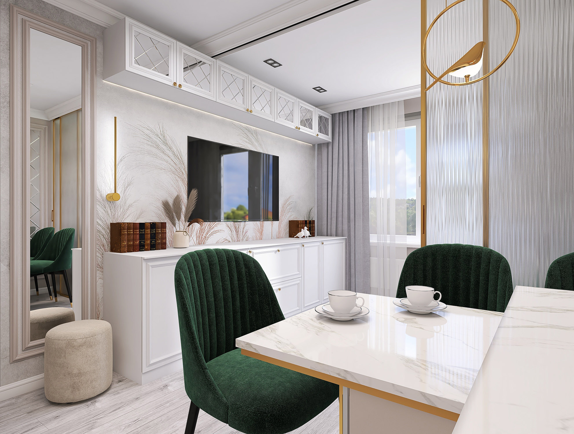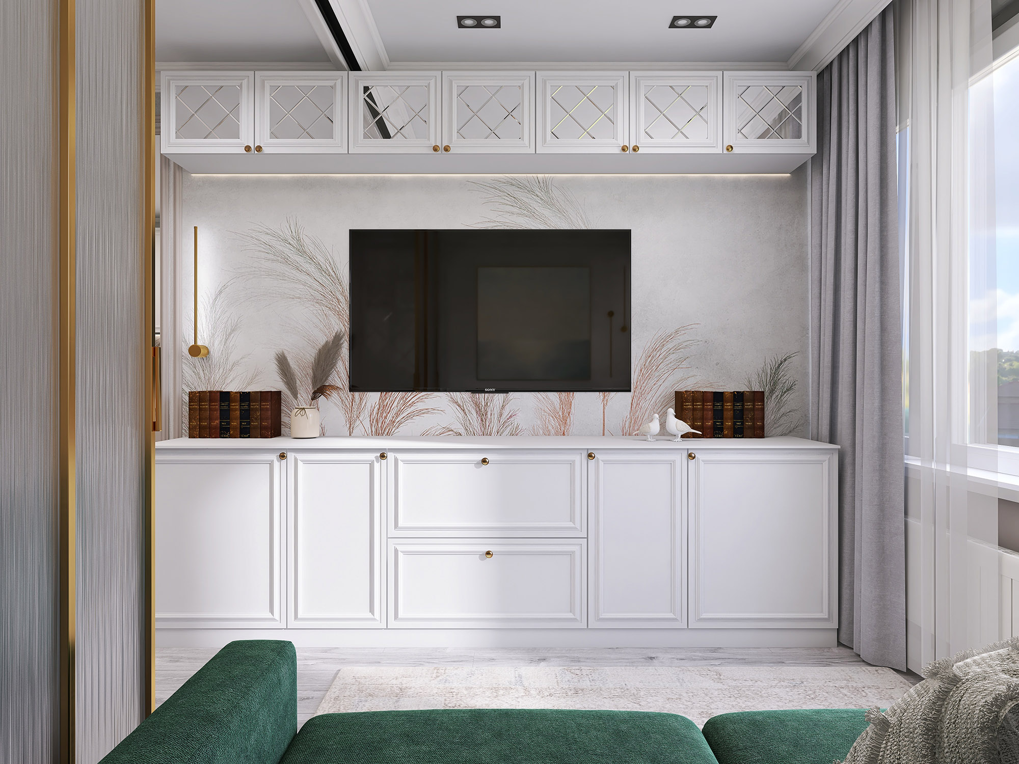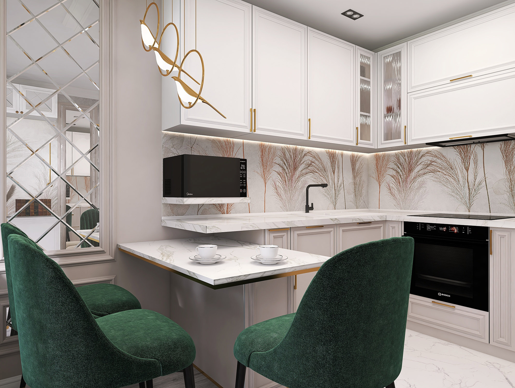 Проект кухни-гостиной для бабушки 80 лет. Обои из коллекции «Air». Комната по-настоящему начинает «дышать», так как за счет светлых тонов и стройных форм листьев, колосьев и стеблей пространство расширяется. Фигуры либо ложатся тенью на дизайнерские обои, либо очерчены лишь по контуру тонкими линиями. Хозяева же могут обрести спокойствие и гармонию, как после отдыха на природе.
