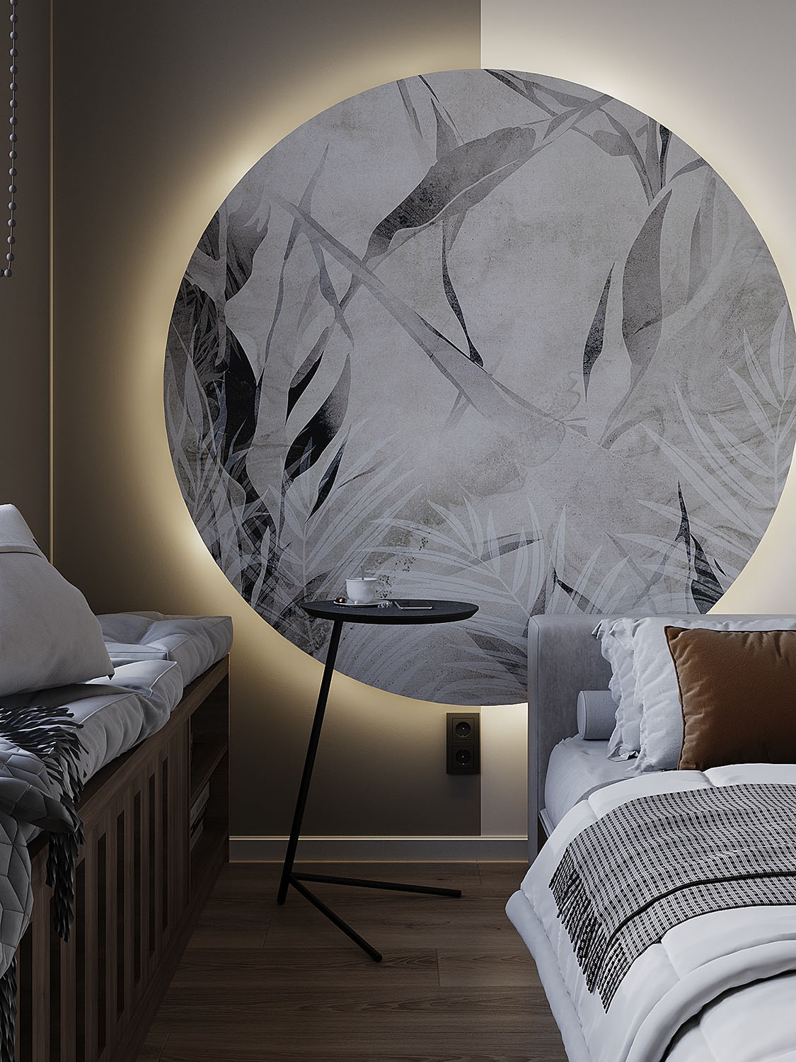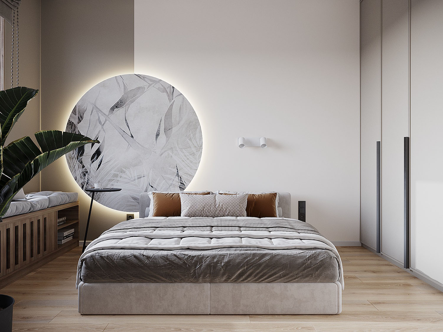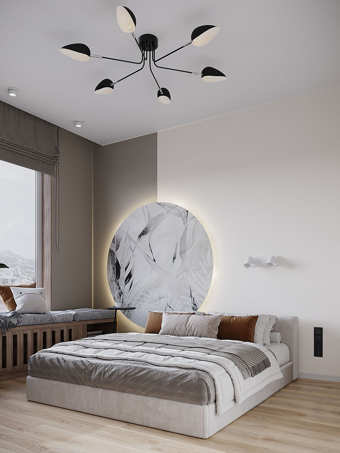 Интерьер спальни в квартире под сдачу в аренду в ЖК «ALIA». Задача была — сделать квартиру с элементами минимализма, светлую, унисекс, для проживания одного или двух человек. НеоКартина из коллекции Air оживила интерьер, отлично вписавшись в цветовую гамму комнаты.