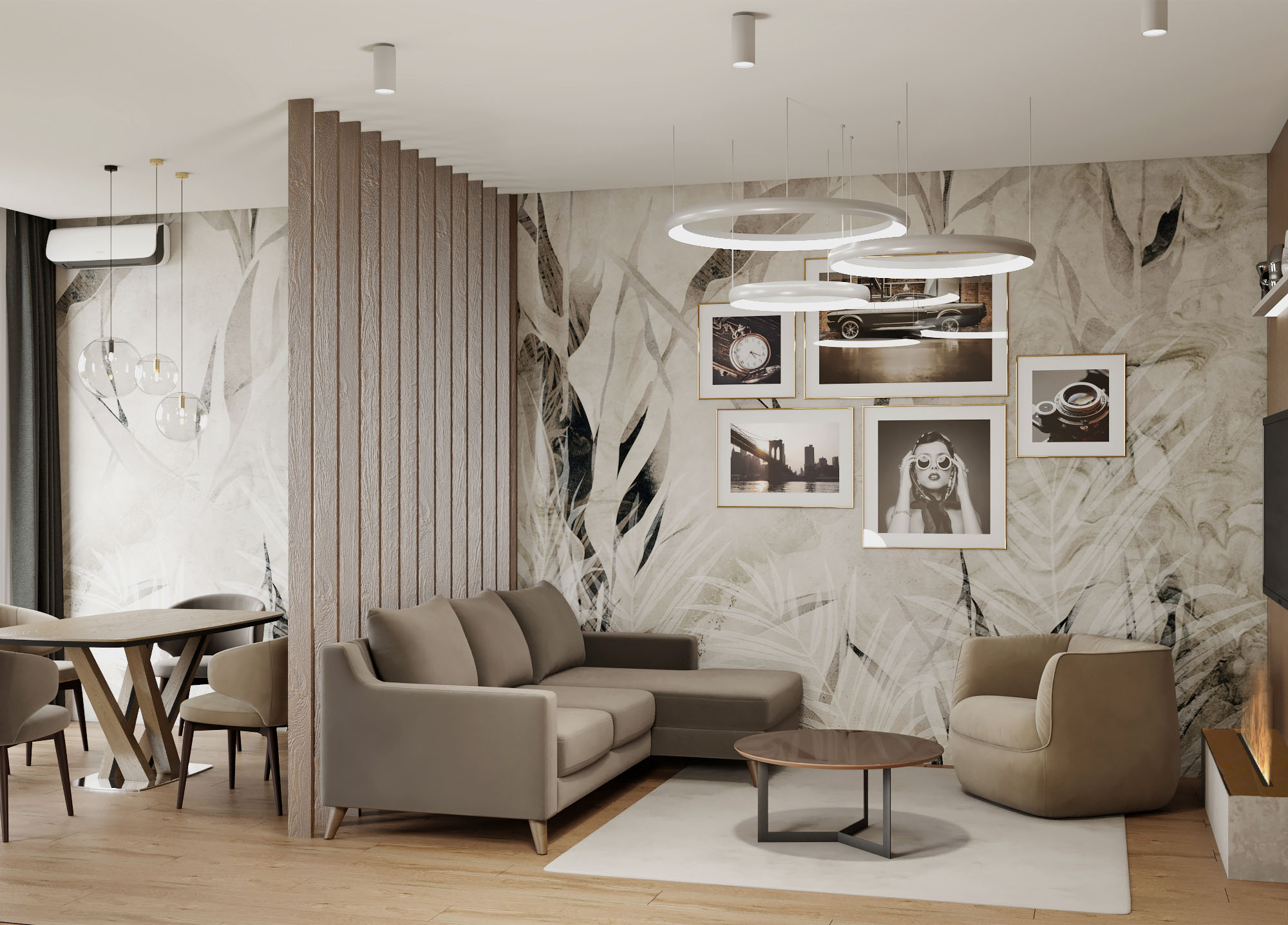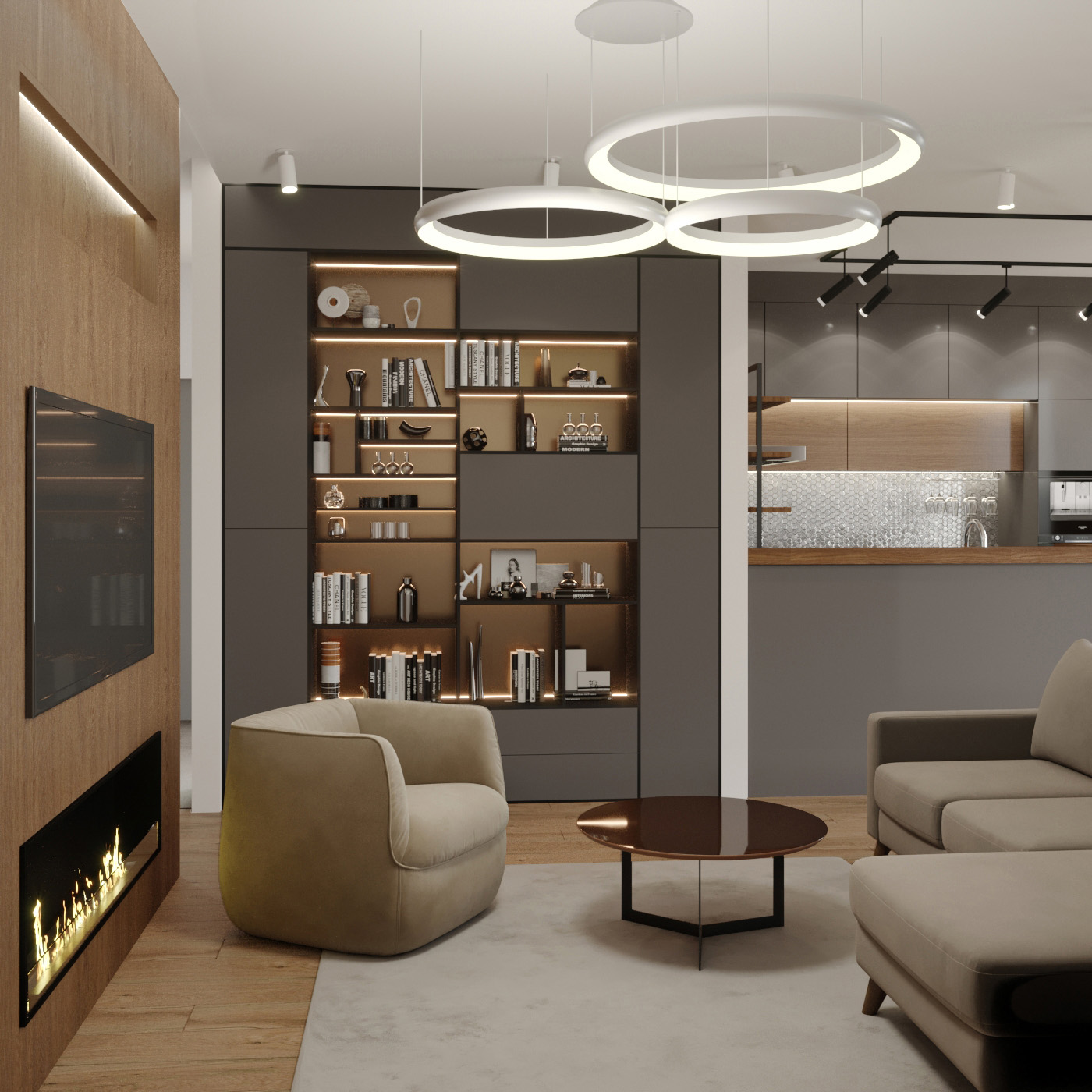 Кухня-гостиная спроектирована как единое пространство, в котором в одной части помещения располагается кухня с барной стойкой, а в другой - столовая и каминная зоны, разделенные между собой реечной перегородкой. В каминной зоне стена с паровым камином оформлена шпонированными обоями, создающими впечатление натурального дерева.