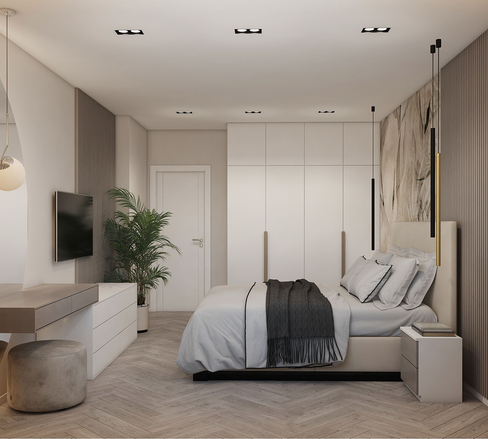 Спальня для молодой семьи. Площадь комнаты — 20 м². Квартира находится в г. Москва. Пожелания были сделать современный интерьер в спокойных тонах. Обои идеально подошли для данного помещения и пришлись по вкусу заказчикам.