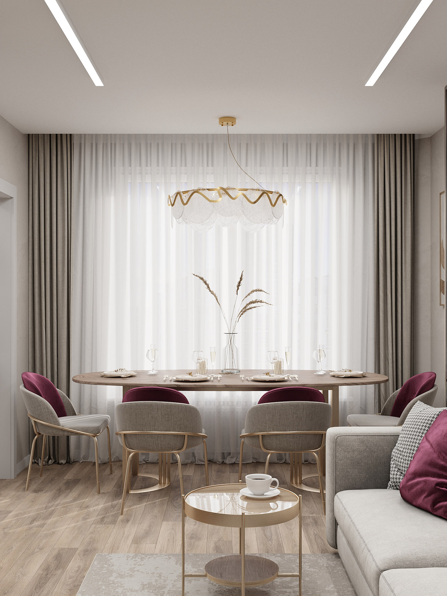 Вот такой интересный интерьер получился за счёт добавления золотых элементов и яркого текстиля. А акцентом в зоне дивана служат нежные обои из коллекции «Air».