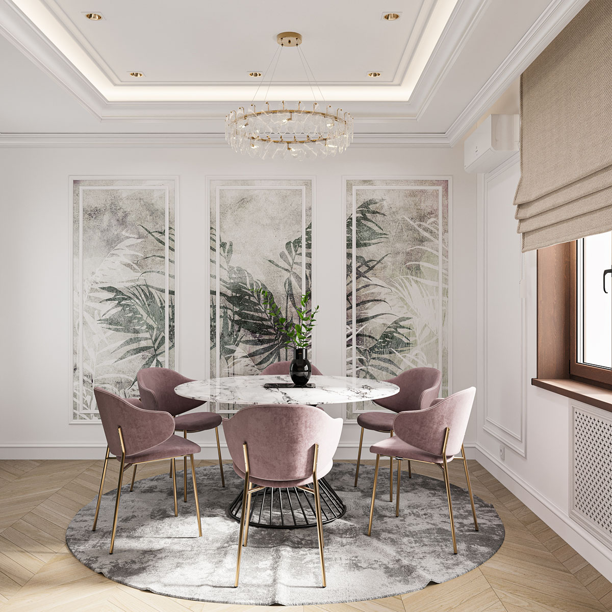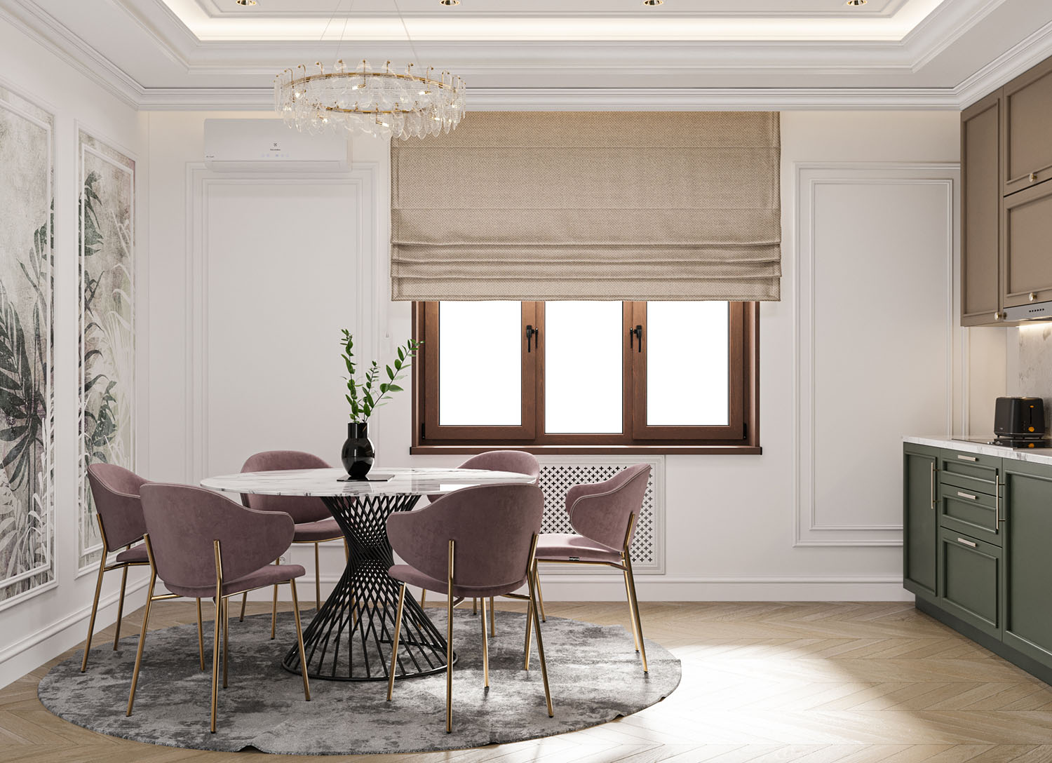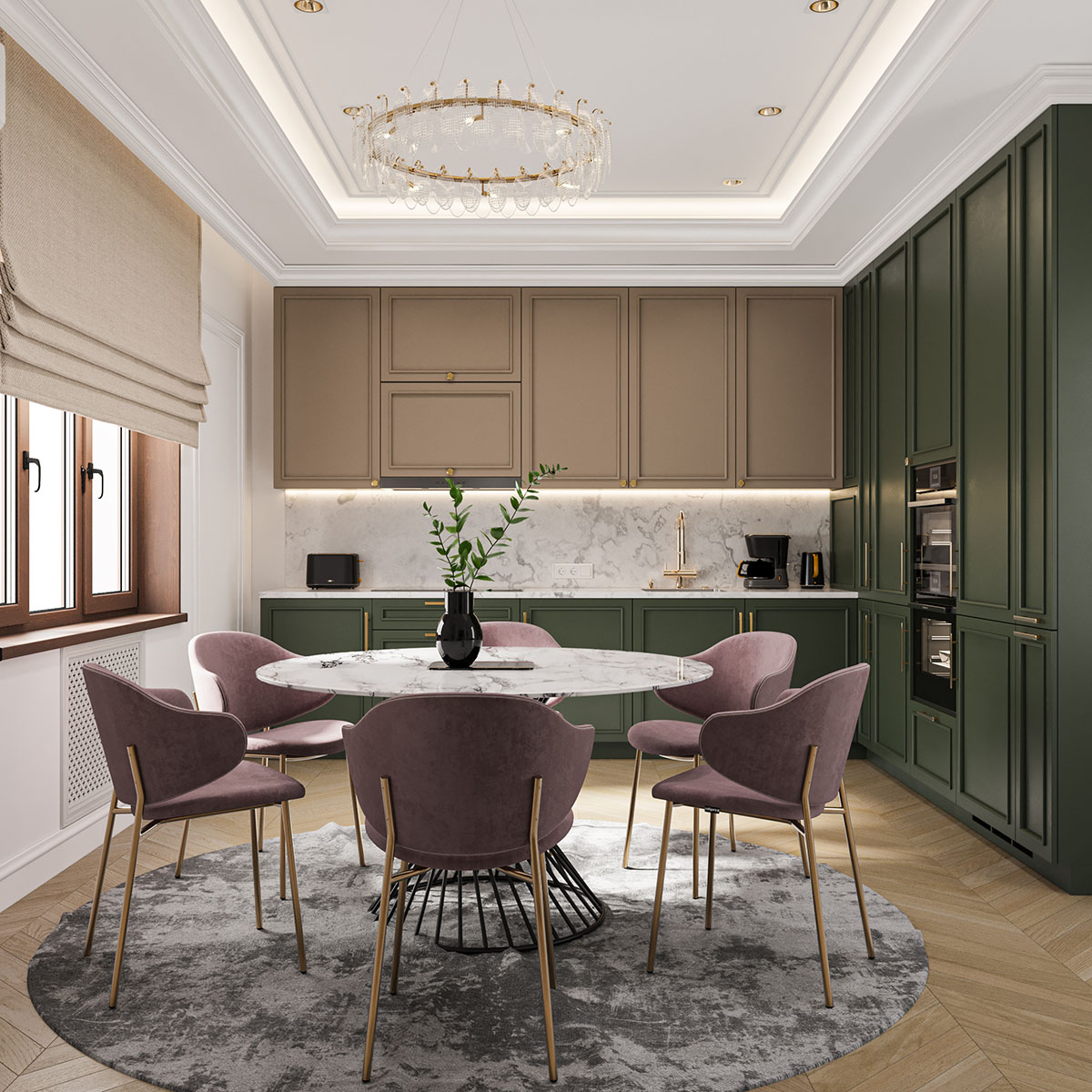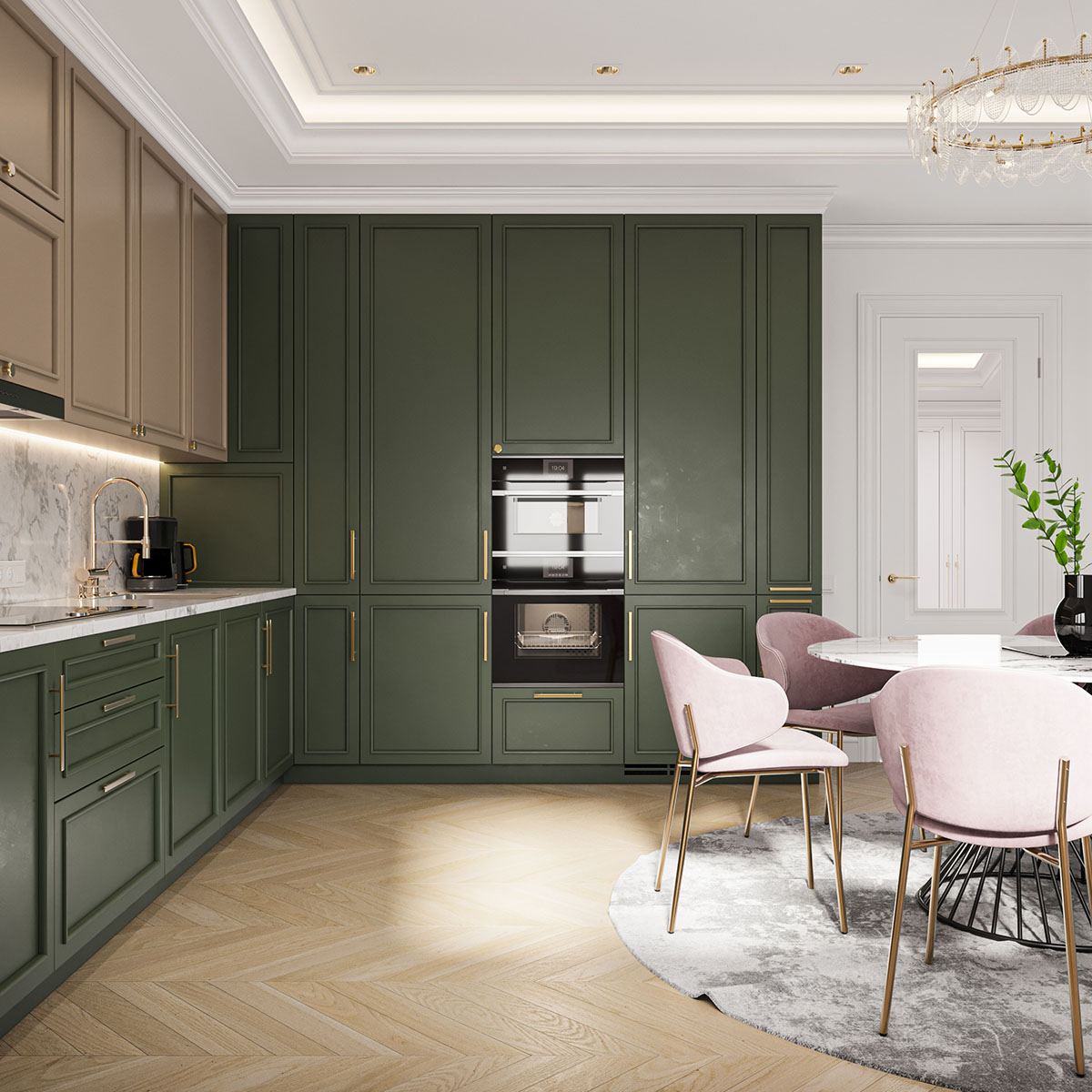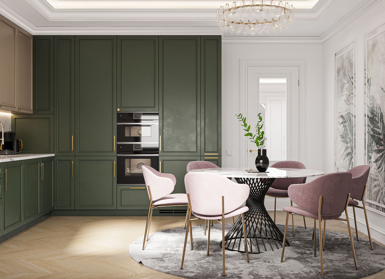 Кухня-столовая в неоклассическом стиле с зелеными шкафами, розовыми стульями на золотых ножках и круглым белым столом. Обеденная зона оформлена в мягких тонах с серым ковром и декором на стене в виде дизайнерских обоев с растительными мотивами. Центральным элементом освещения выступает элегантная люстра с золотыми элементами.