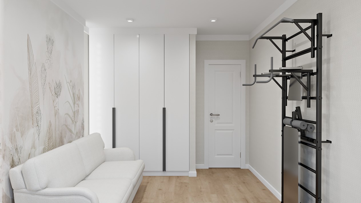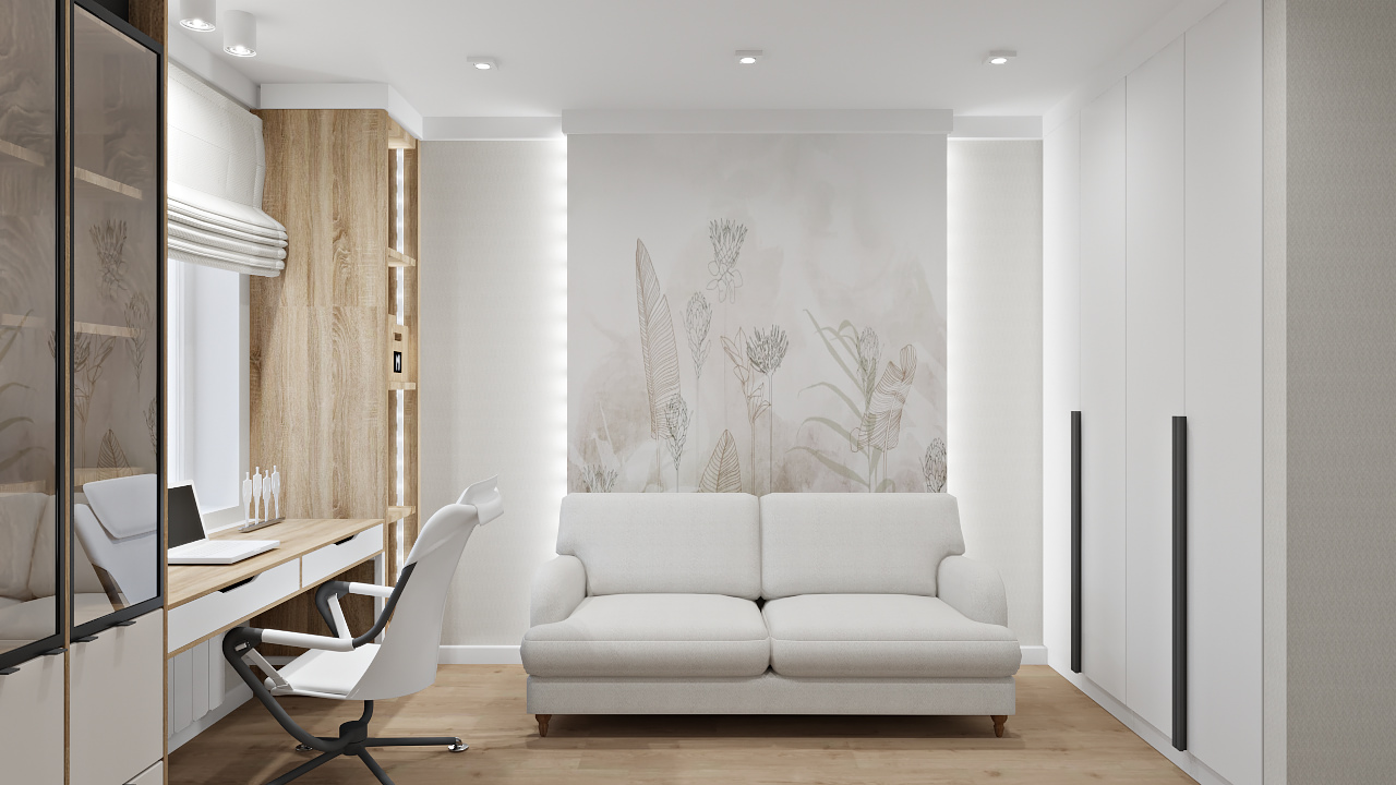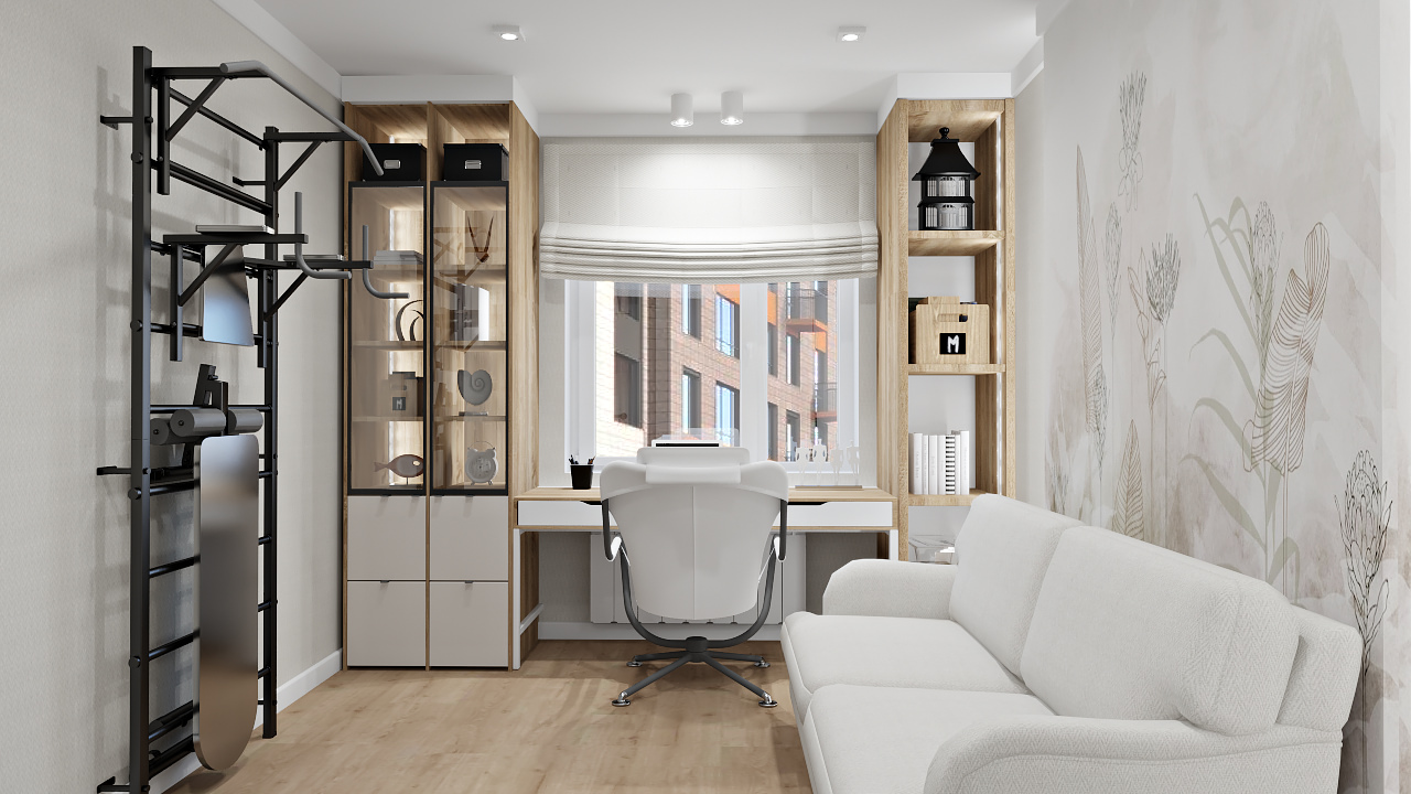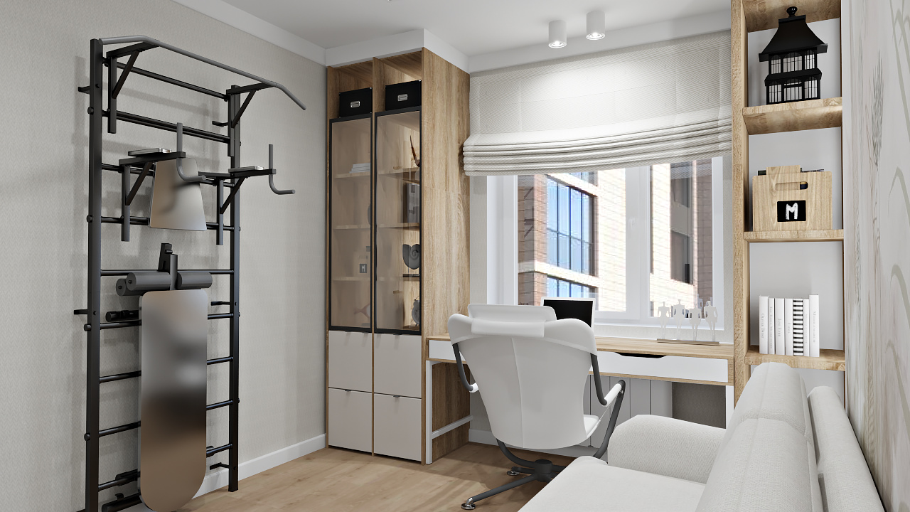 Проект трехкомнатной светлой квартиры в новостройке, г.Казань. Комната-кабинет площадью 11 м² предназначена для молодого холостого мужчины, который в настоящее время планирует использовать ее для времяпровождения за ноутбуком и занятия спортом, а также как гостевую. В будущем подразумевается передать комнату будущим наследникам/наследнику. Фреска из коллекции «Air» добавила помещению уюта и гармонии.
