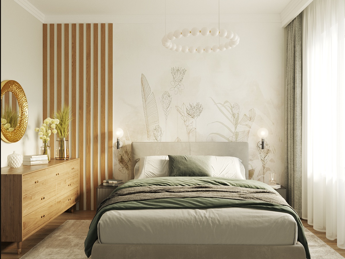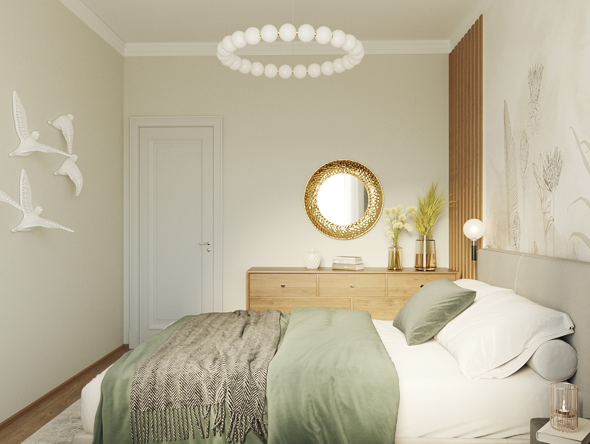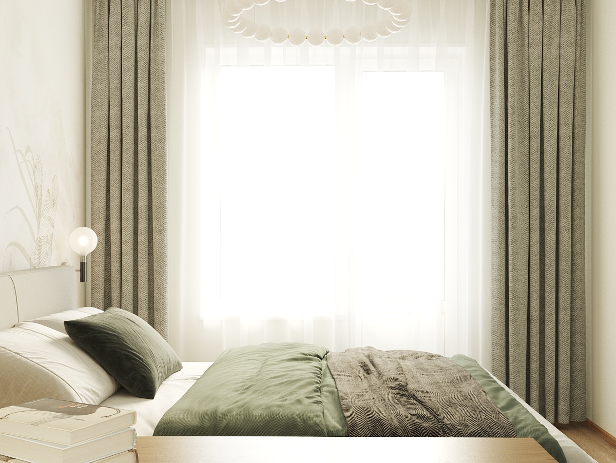 Спальня для молодой пары медика и военного. Главная цель проекта — сделать очень спокойную, располагающую к отдыху атмосферу. Для решения этой задачи отлично подошли обои с природными мотивами трав из коллекции Air, текстура натуральной древесины пола, реек и комода, а так же разнофактурный текстиль.