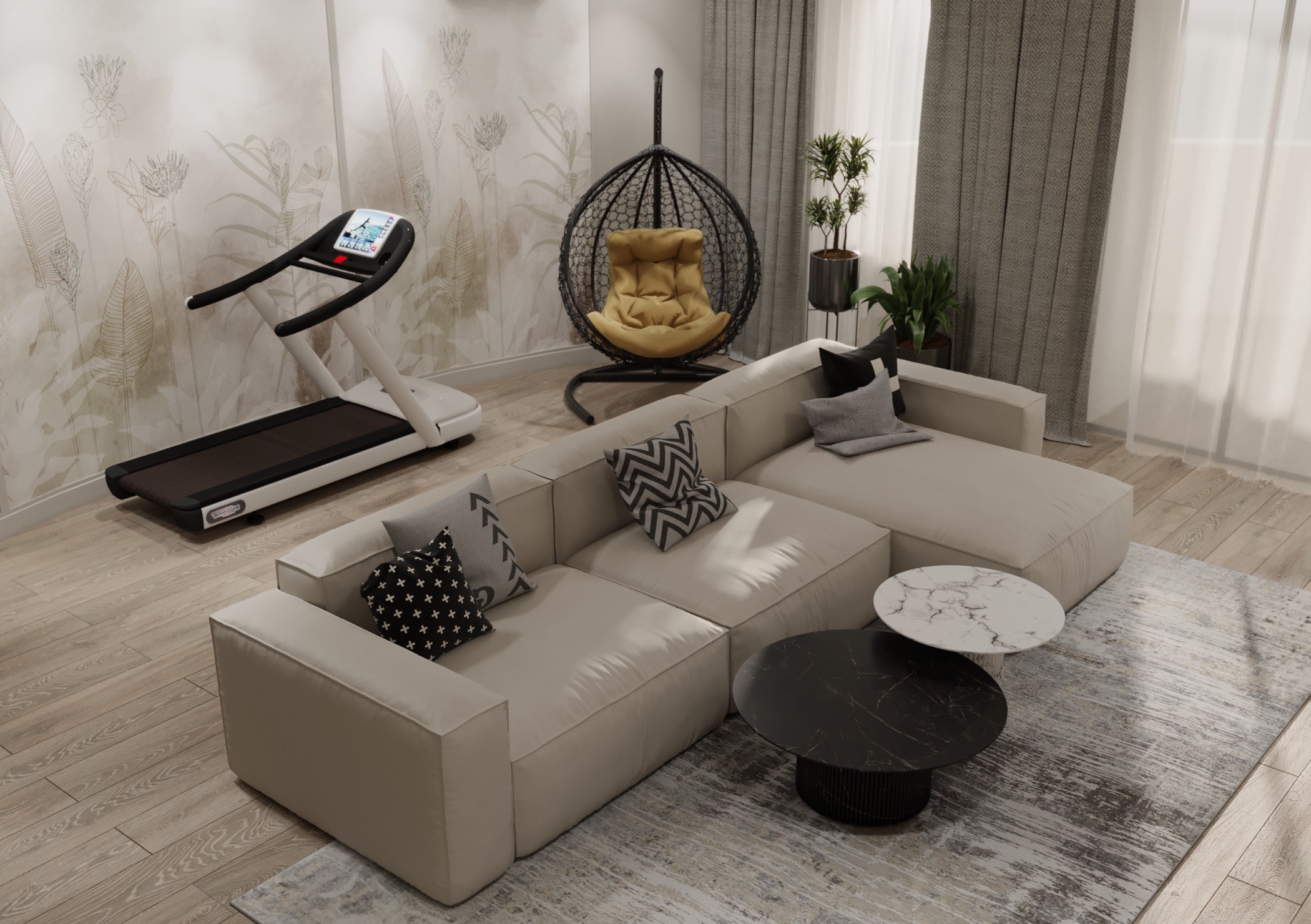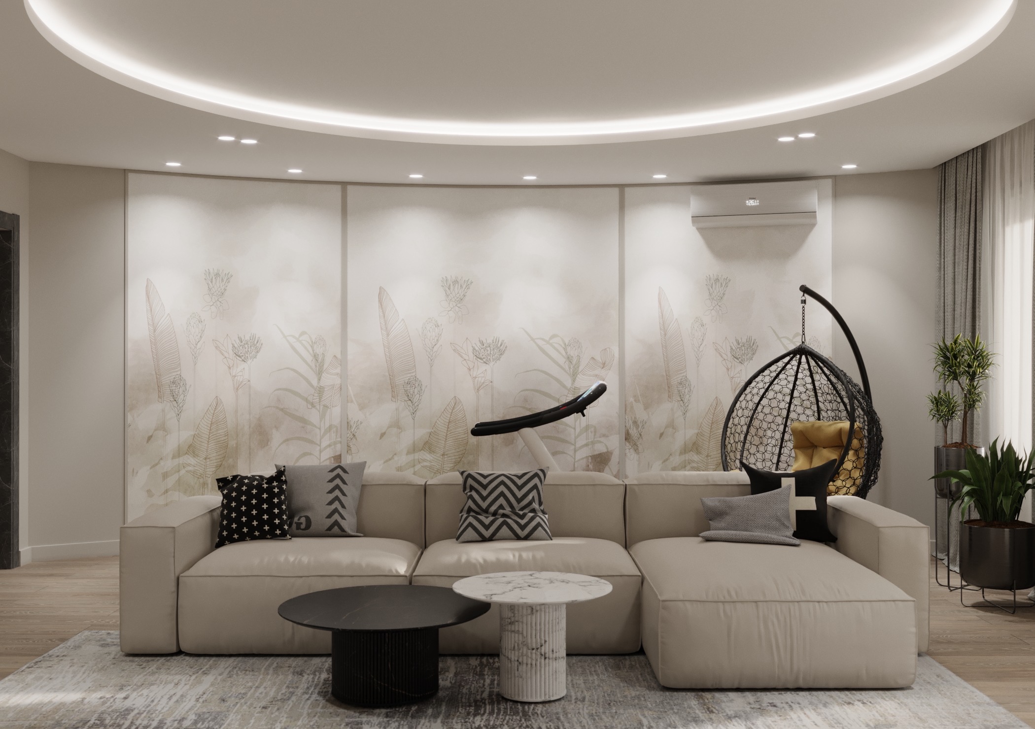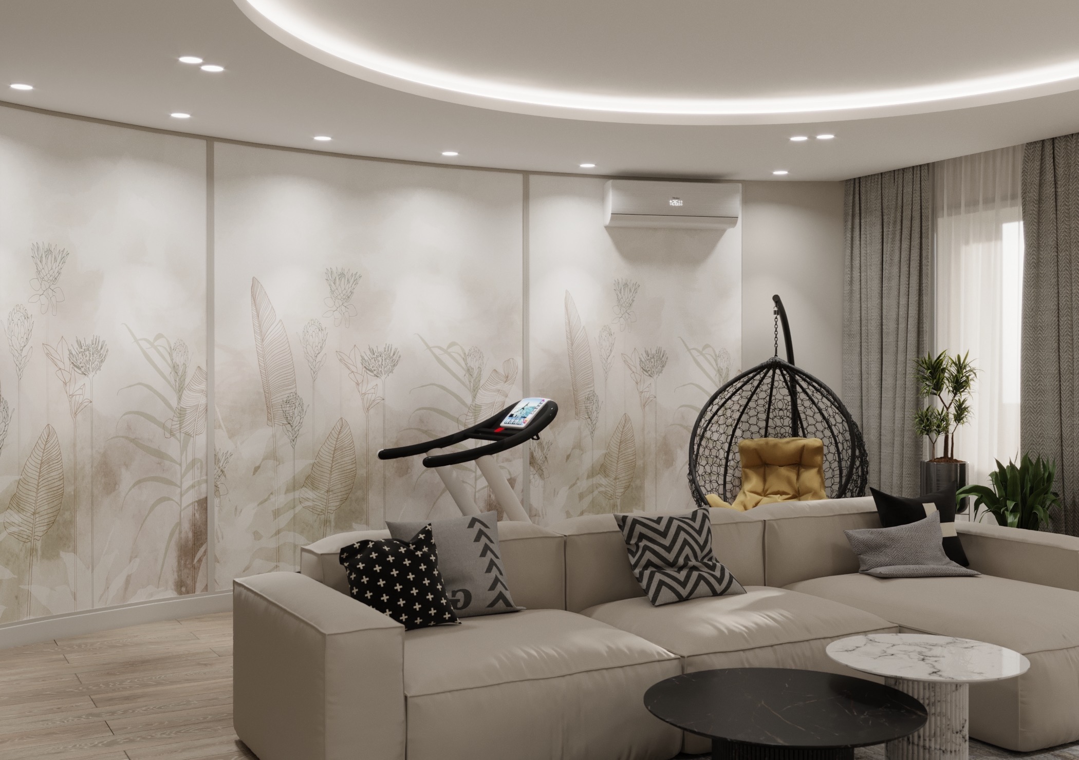 Для этой гостиной дизайнер выбрал обои из коллекции Air. Светлые пастельные цвета с преобладанием натуральных оттенков создают уют, а длинные растения вытягивают комнату вверх. Стиль и гармония могут проявляться даже в одной стене.