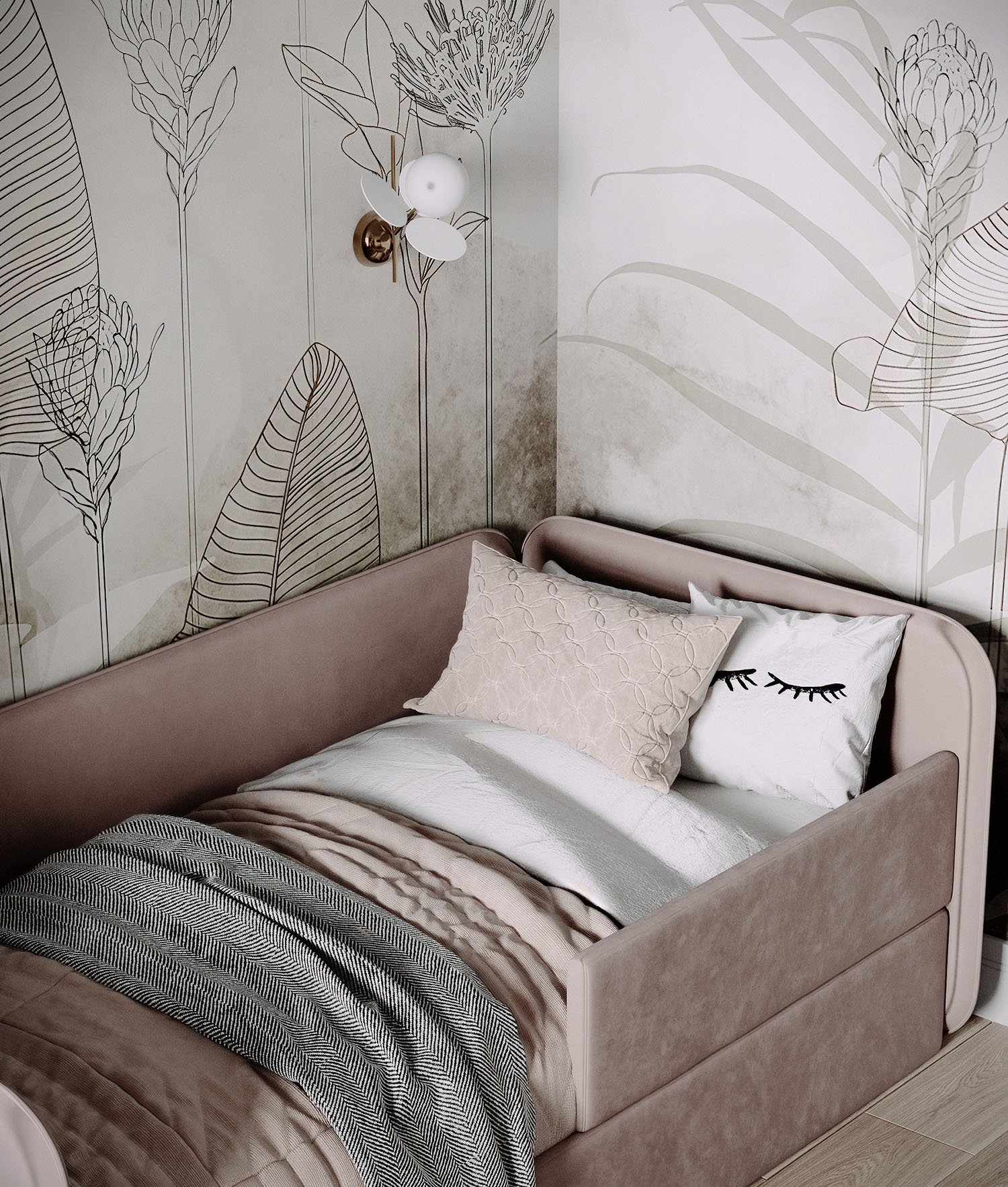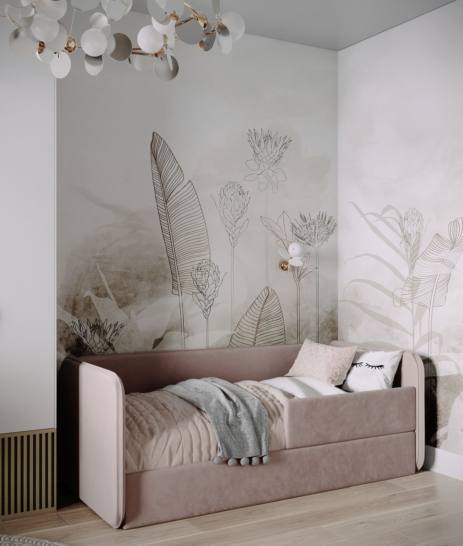 Нежная уютная комната для девочки. Обои из коллекции Air. Светлые пастельные цвета с преобладанием натуральных оттенков (зеленый, голубой, песочный) создают уют, а длинные растения вытягивают комнату вверх. Стиль и гармония могут проявляться даже в одной стене.