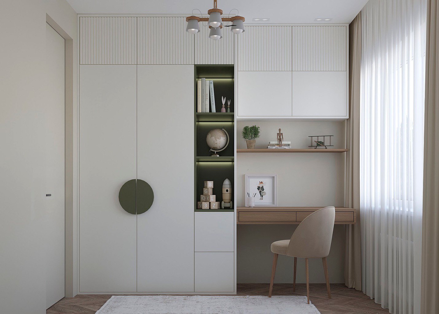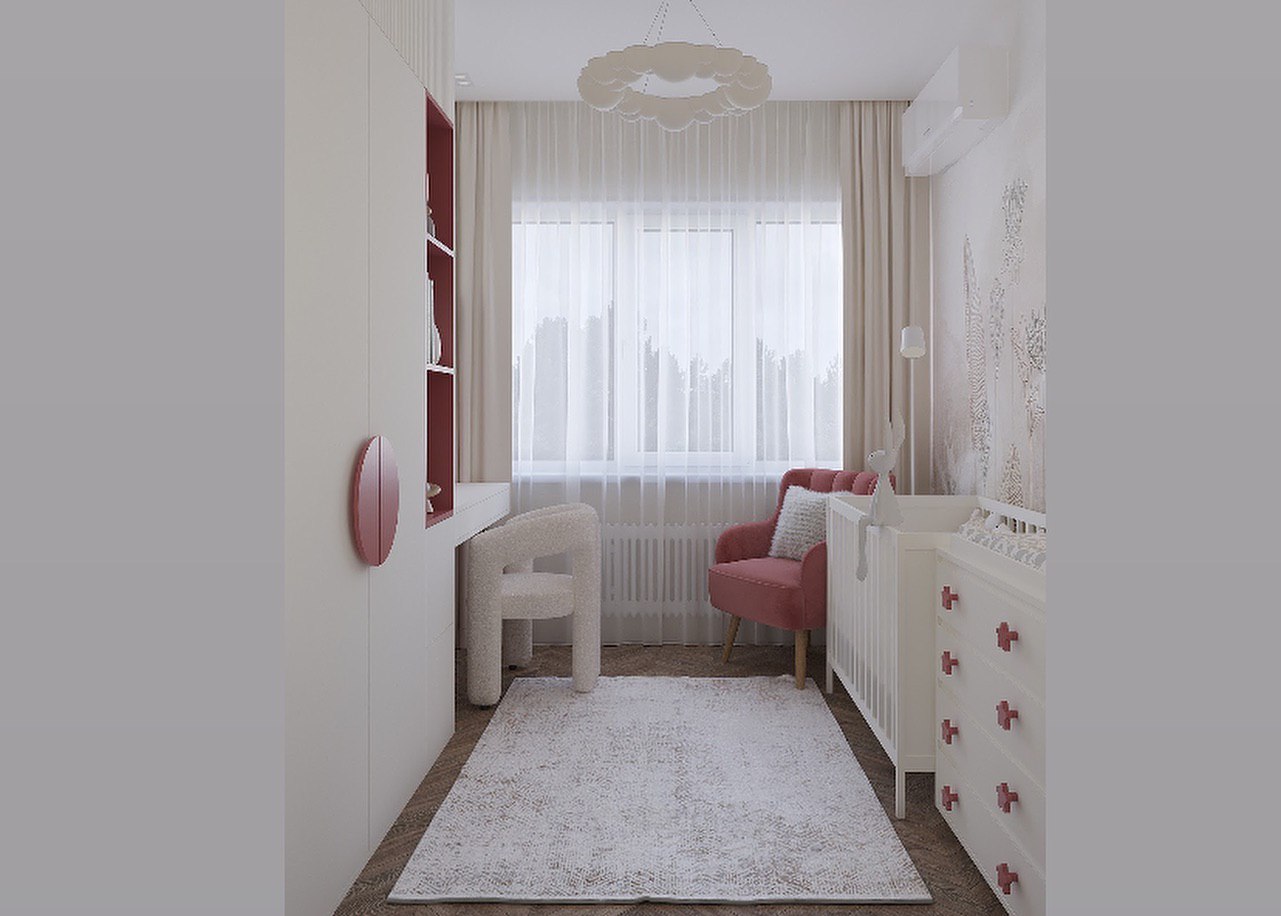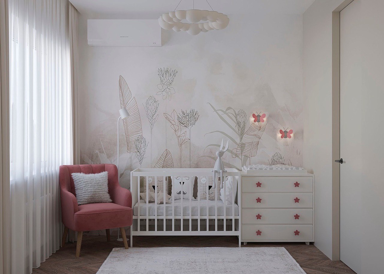 Заказчики просили разработать нейтральный дизайн детской комнаты для будущего ребенка. Обои выбирали между AIR 8 и AIR 13. Комната по-настоящему начинает «дышать», так как за счет светлых тонов и стройных форм листьев, колосьев и стеблей пространство расширяется. А природные мотивы благоприятно влияют на эмоциональный фон и психику.