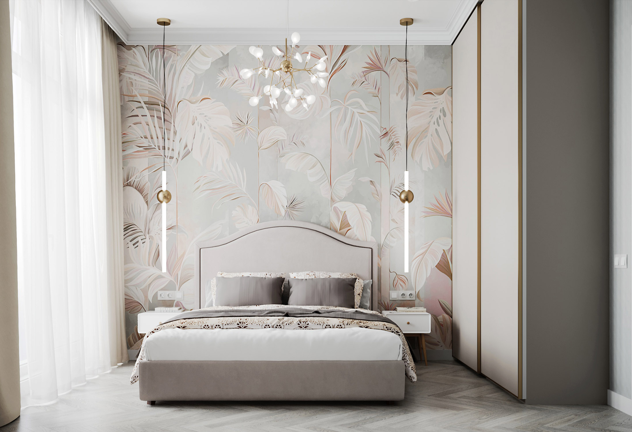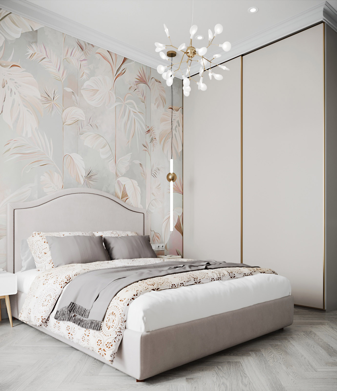 Нежно и романтично выглядит спальня в небольшой квартире общей площадью 58 м². Кровать с прошивкой гвоздиками и тумбочки на высоких ножках смотрятся легко и изящно. А дизайнерские обои и светильники добавляют шика.