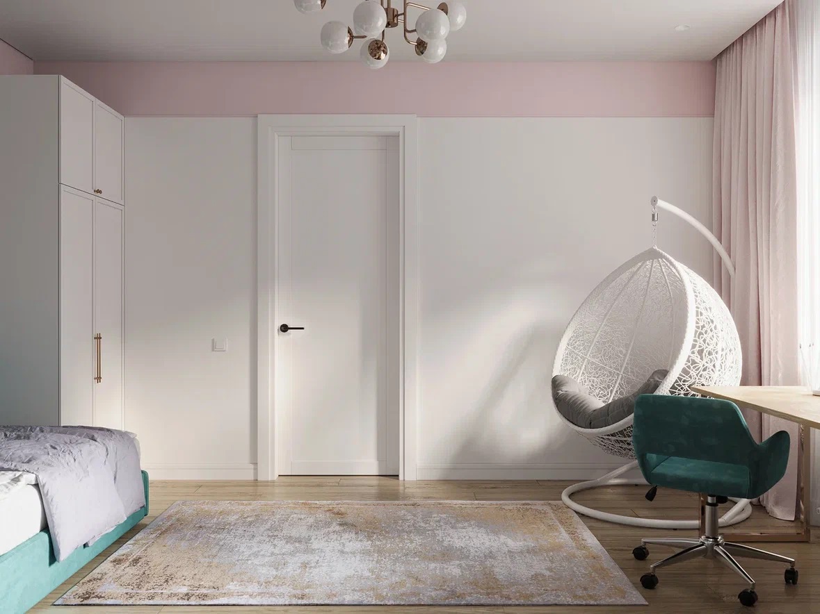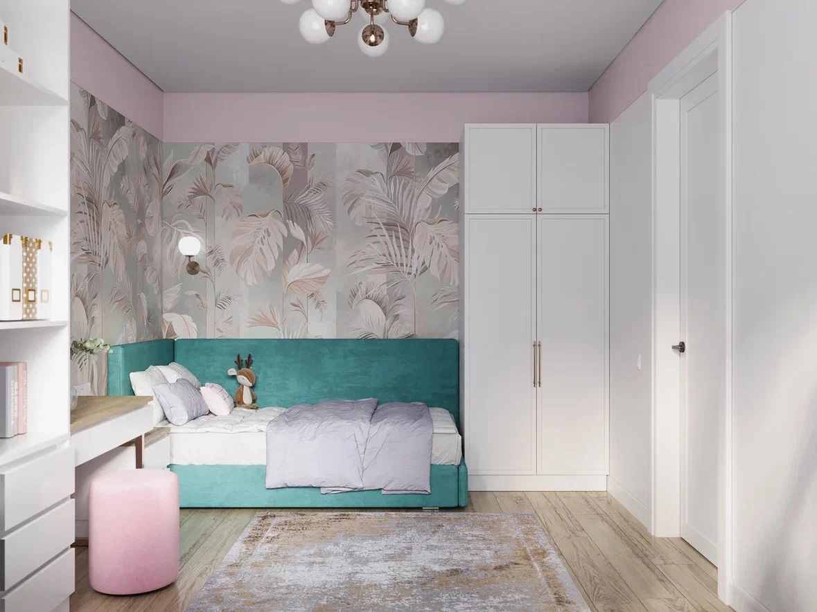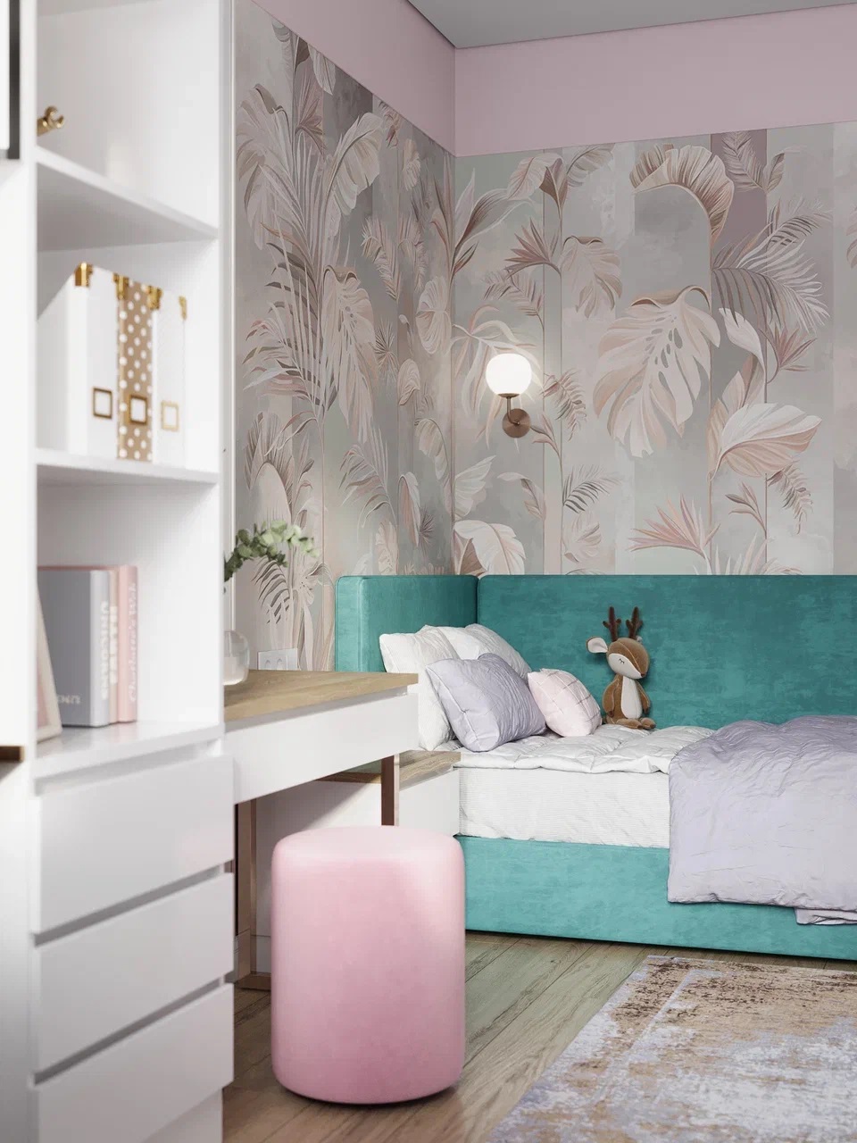 В какой комнате лучше использовать акцентные обои? В любой, в которой хочется! В данном проекте разместили их в детской, выделив зону спального места. Коллекция ALEXANDRA добавила комнате нежности и сделала ее более просторной.