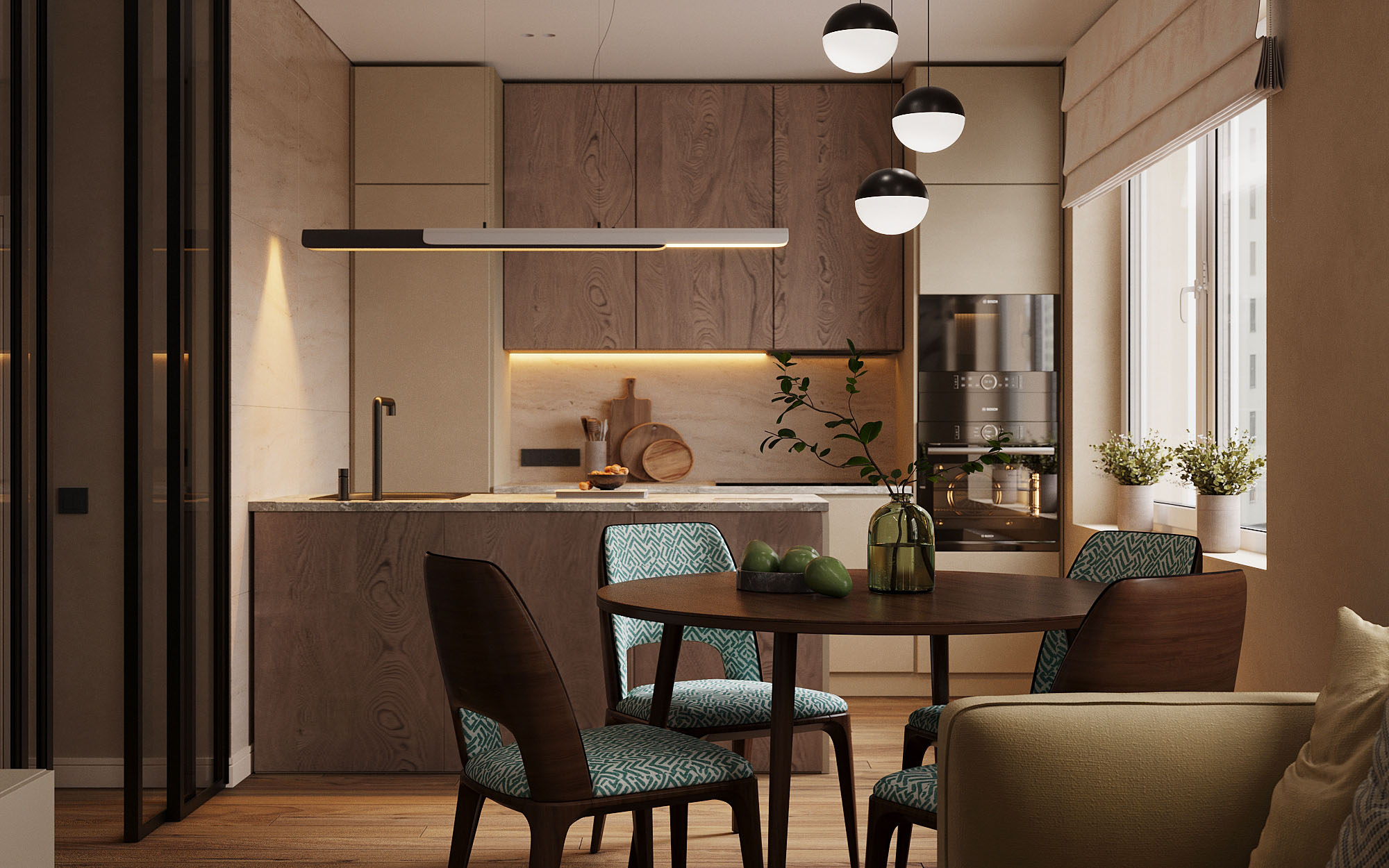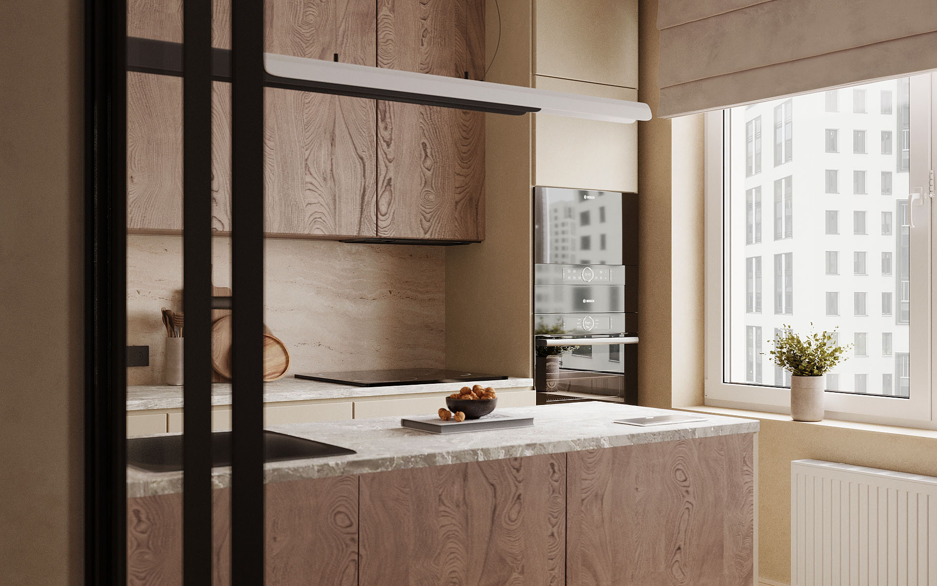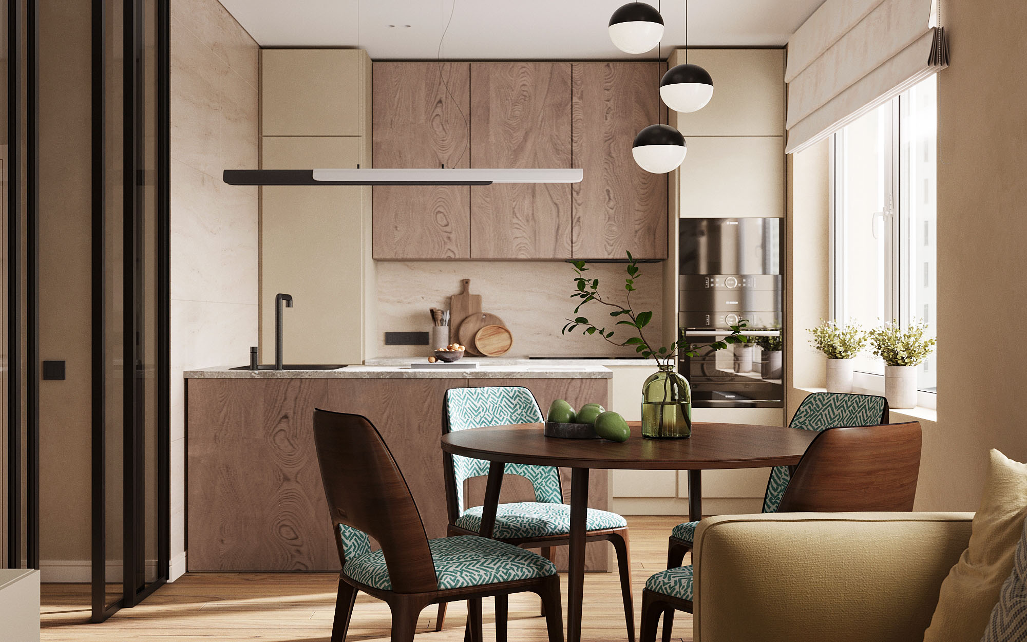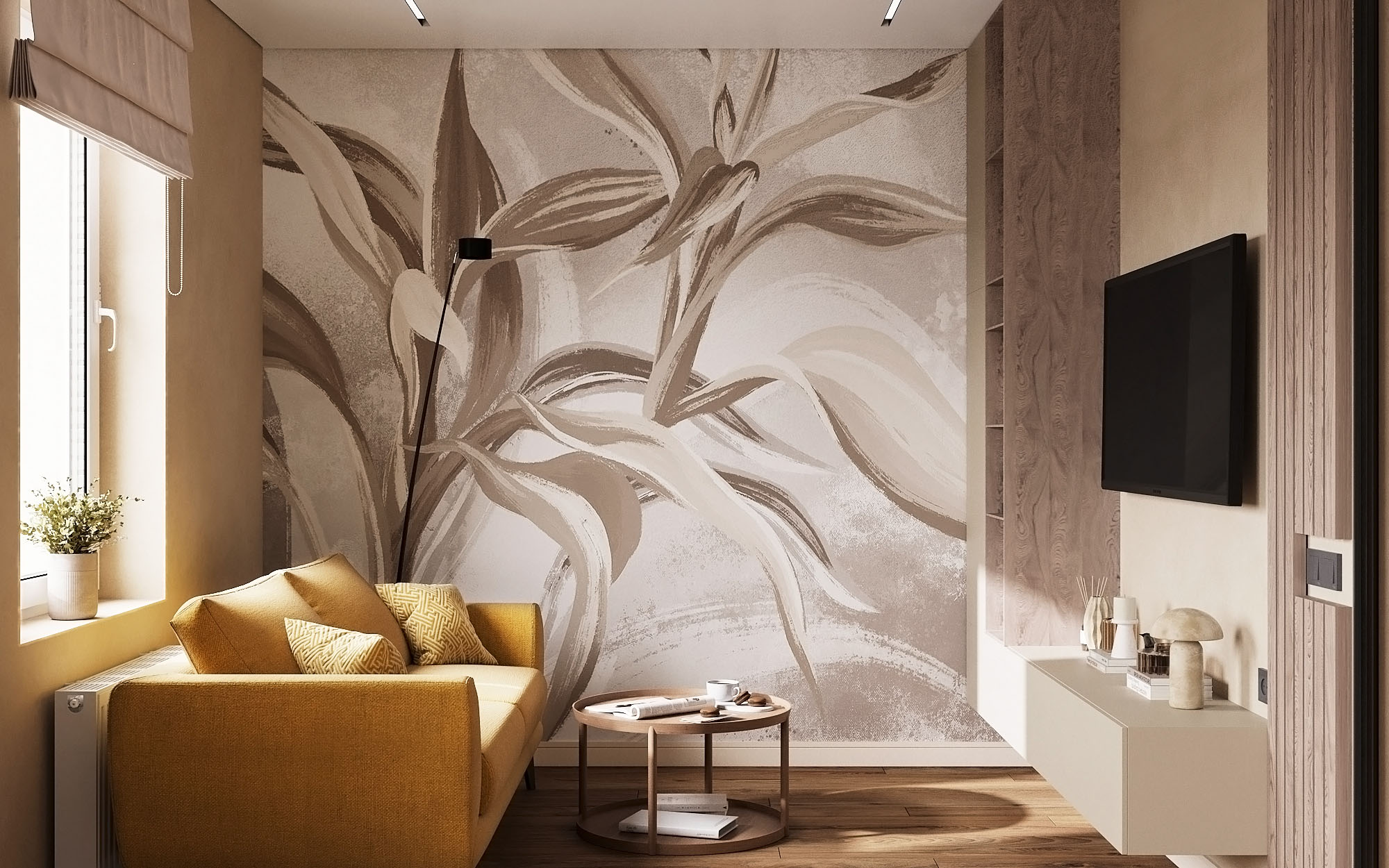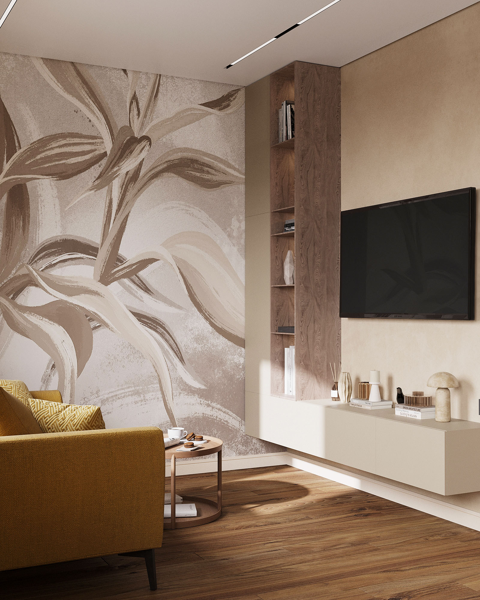 Проект в ЖК «Галактика PRO» в городе Санкт-Петербург для семьи из трех человек. Главным пожеланием заказчиков было оформление квартиры в монохромных бежевых тонах. В кухне-гостиной выделили акцентную стену необычными обоями из коллекции «Alive 22», которые гармонично дополнили интерьер.