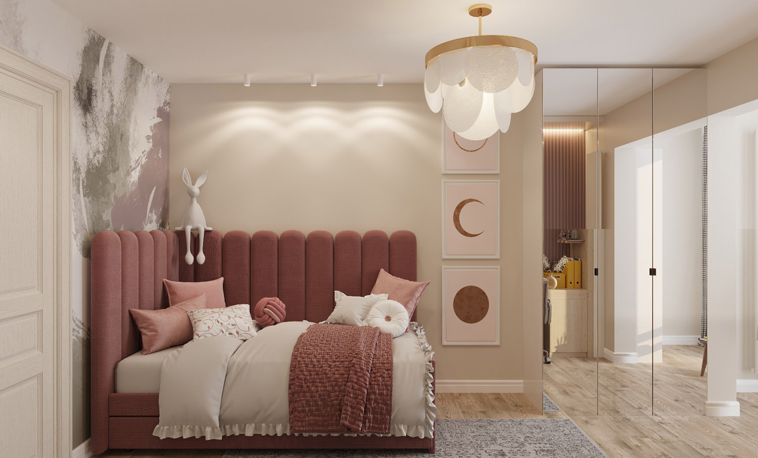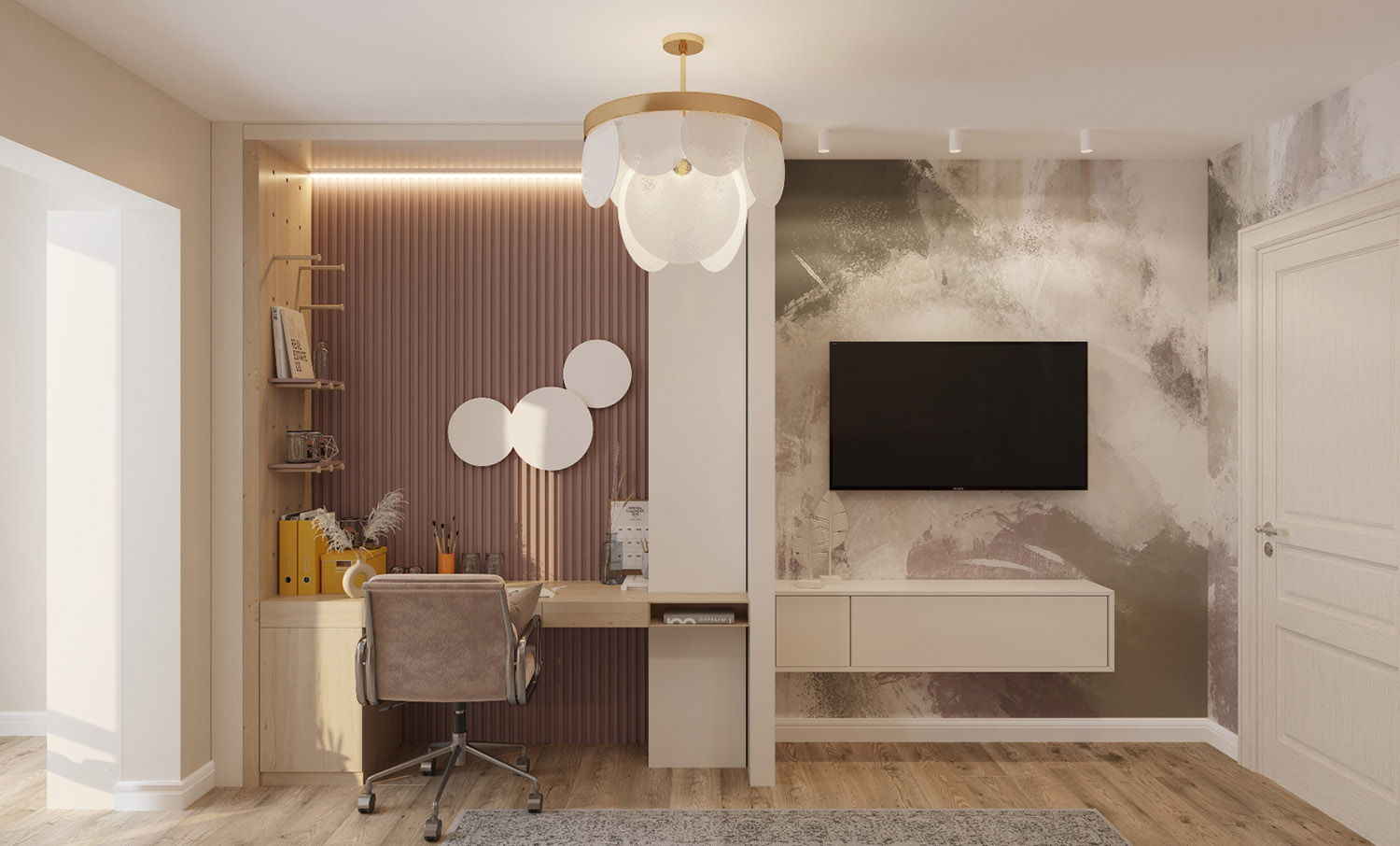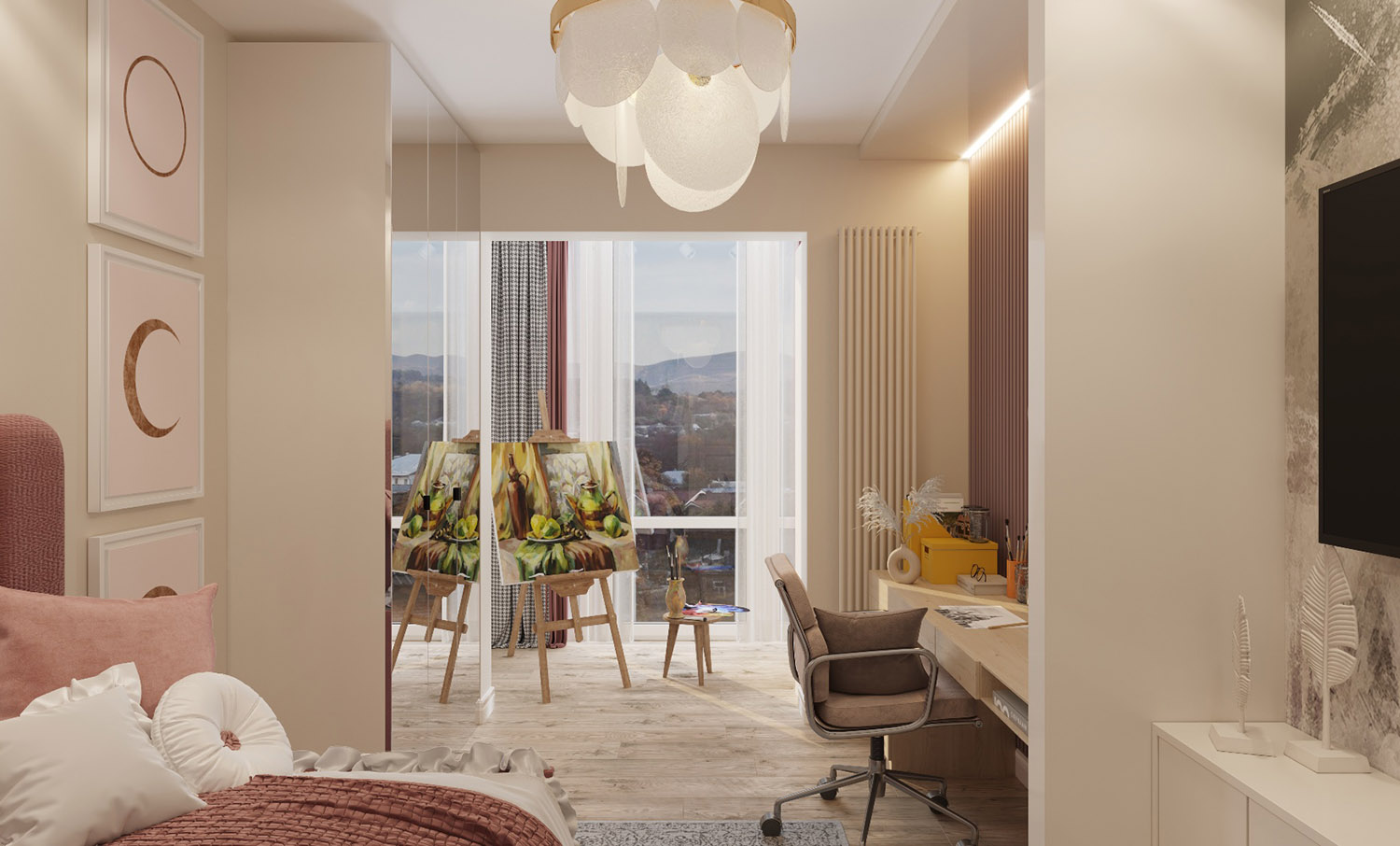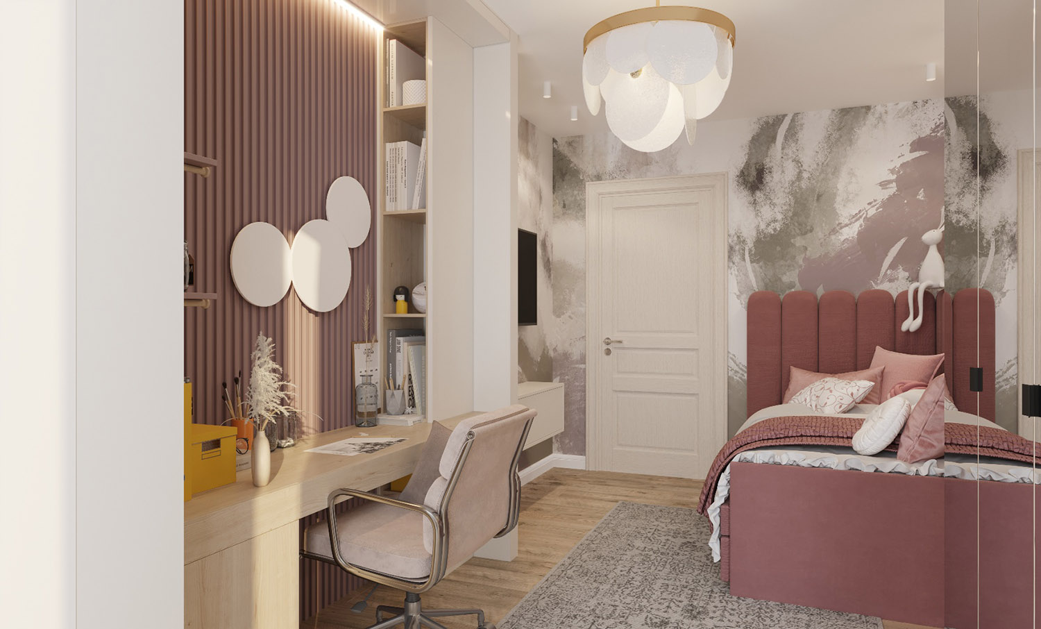 Это проект комнаты для творческой девочки, которая живет в г. Кисловодск. Акцентом стали обои из коллекции «Alive» — очень абстрактные, но от этого не менее красивые. Вся гамма комнаты подстроена под палитру этих обоев.